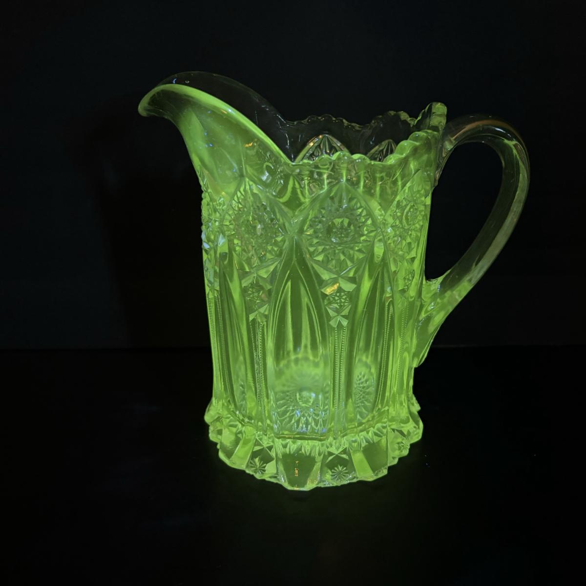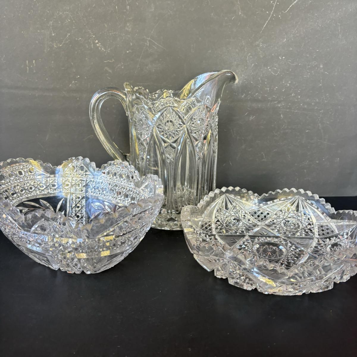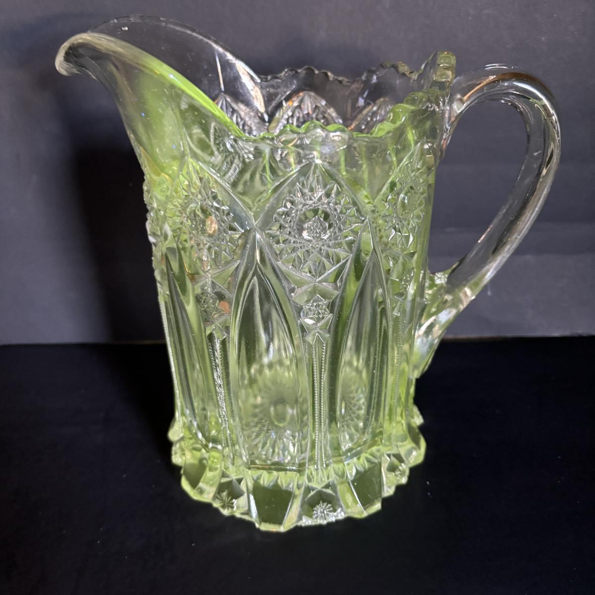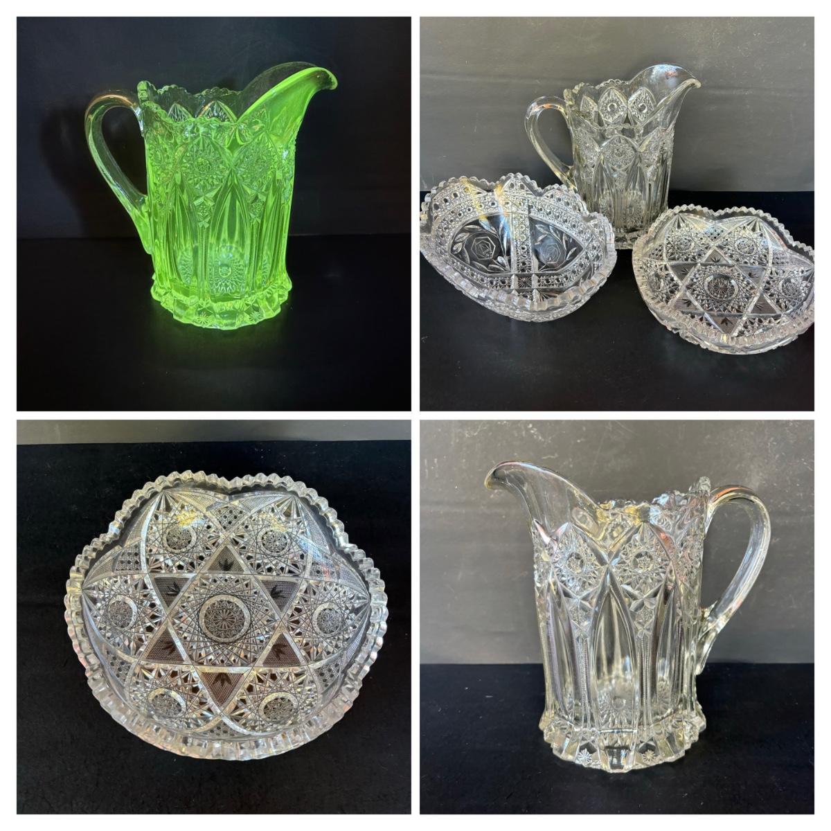 LOT 206: Cut Glass Uranium (or manganese) Pitcher & Cut Glass Bowls