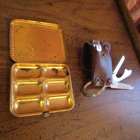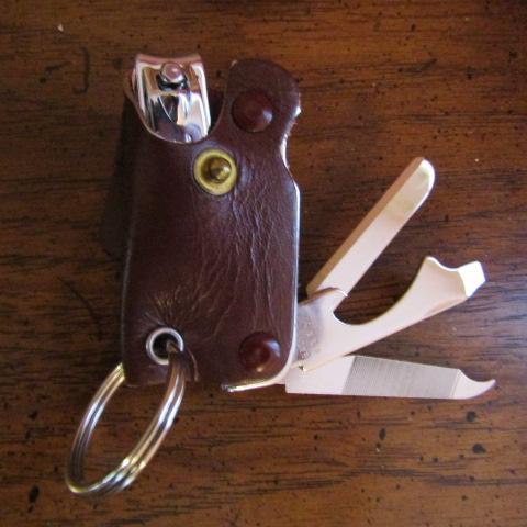 NAIL CLIPPERS, FILE, BOTTLE OPENER AND KNIFE IN LEATHER SHEATH