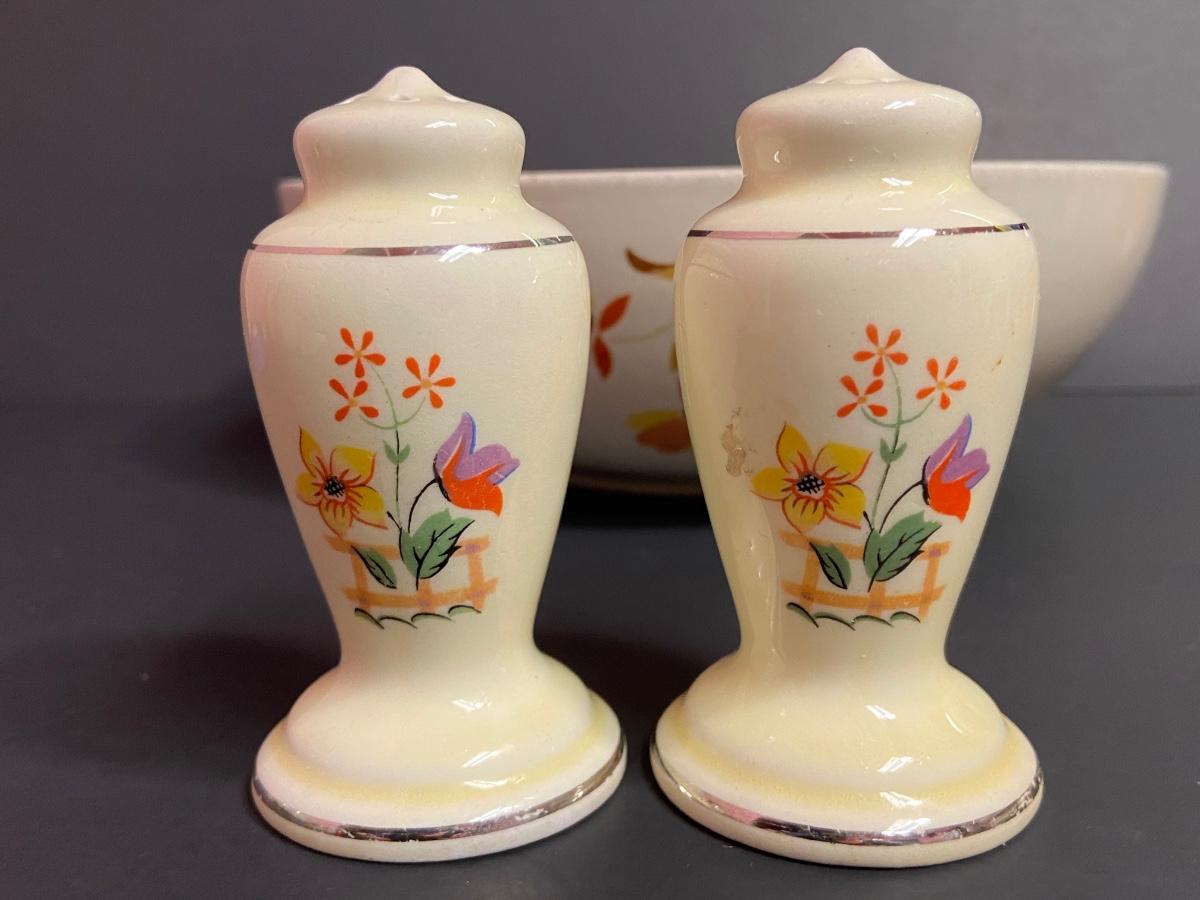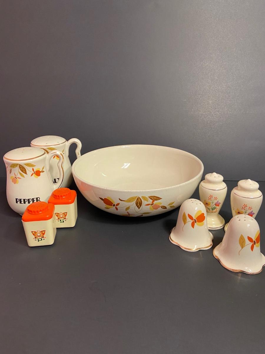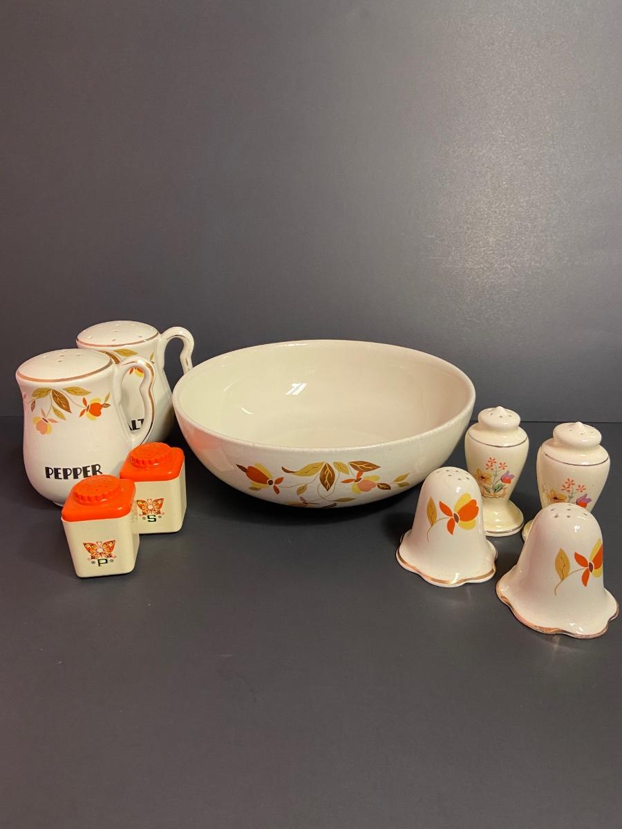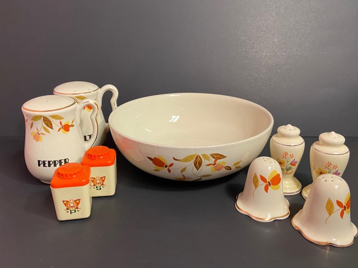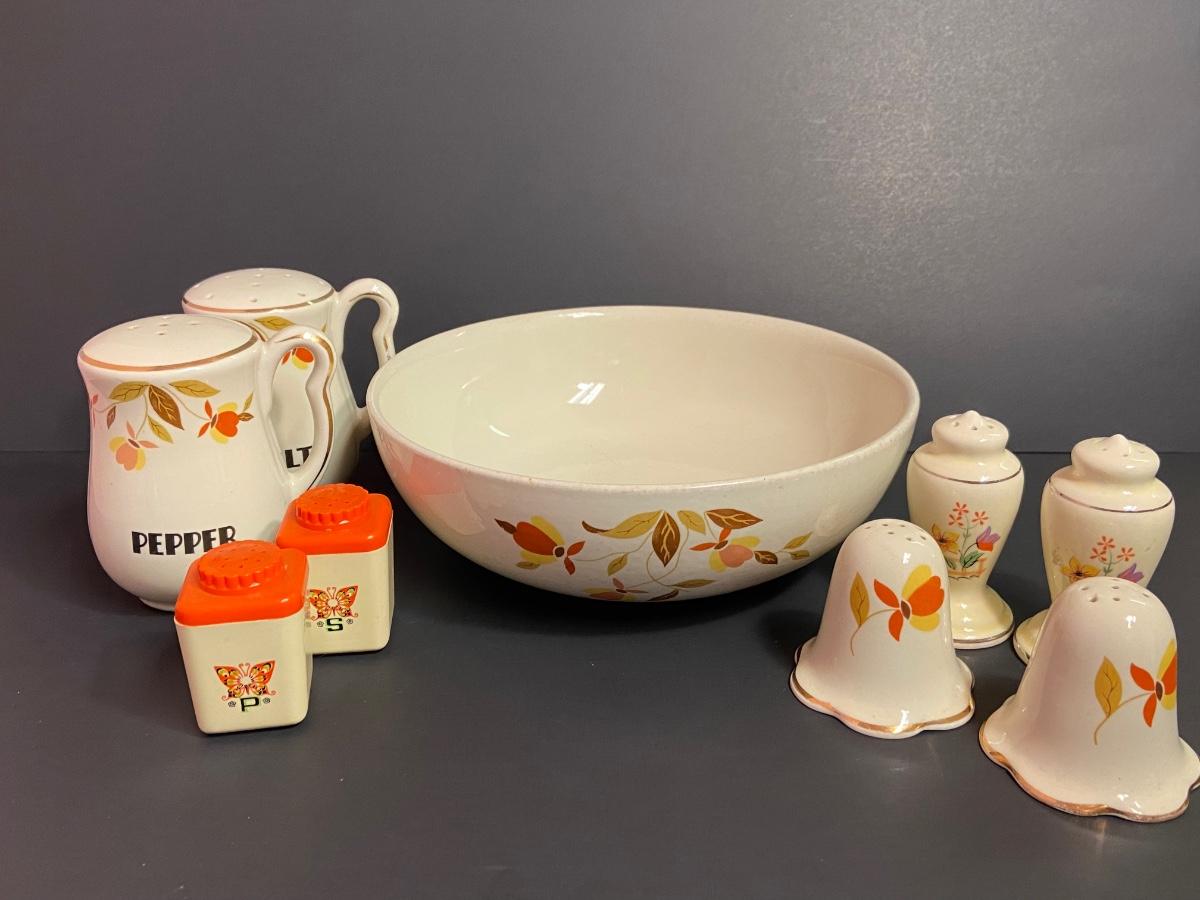 Vintage Hall collection bowl with matching salt/pepper shakers along with butterfly and floral salt/pepper shakers