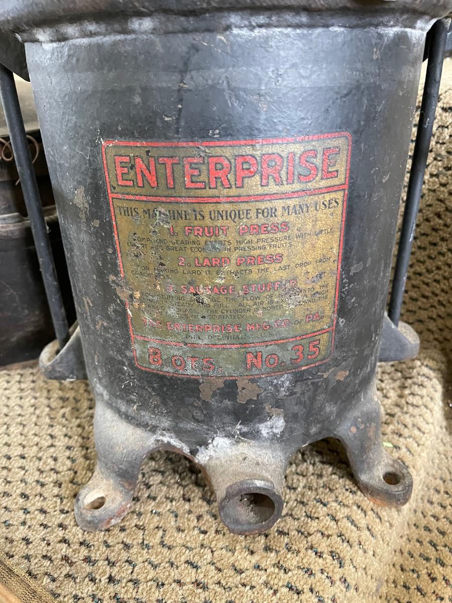 2 Antique Presses (4 qt press by Enterprise MFG Co & Philadelphia National Specialty MFG Co), Pail (2 qt) and Ice Tongs