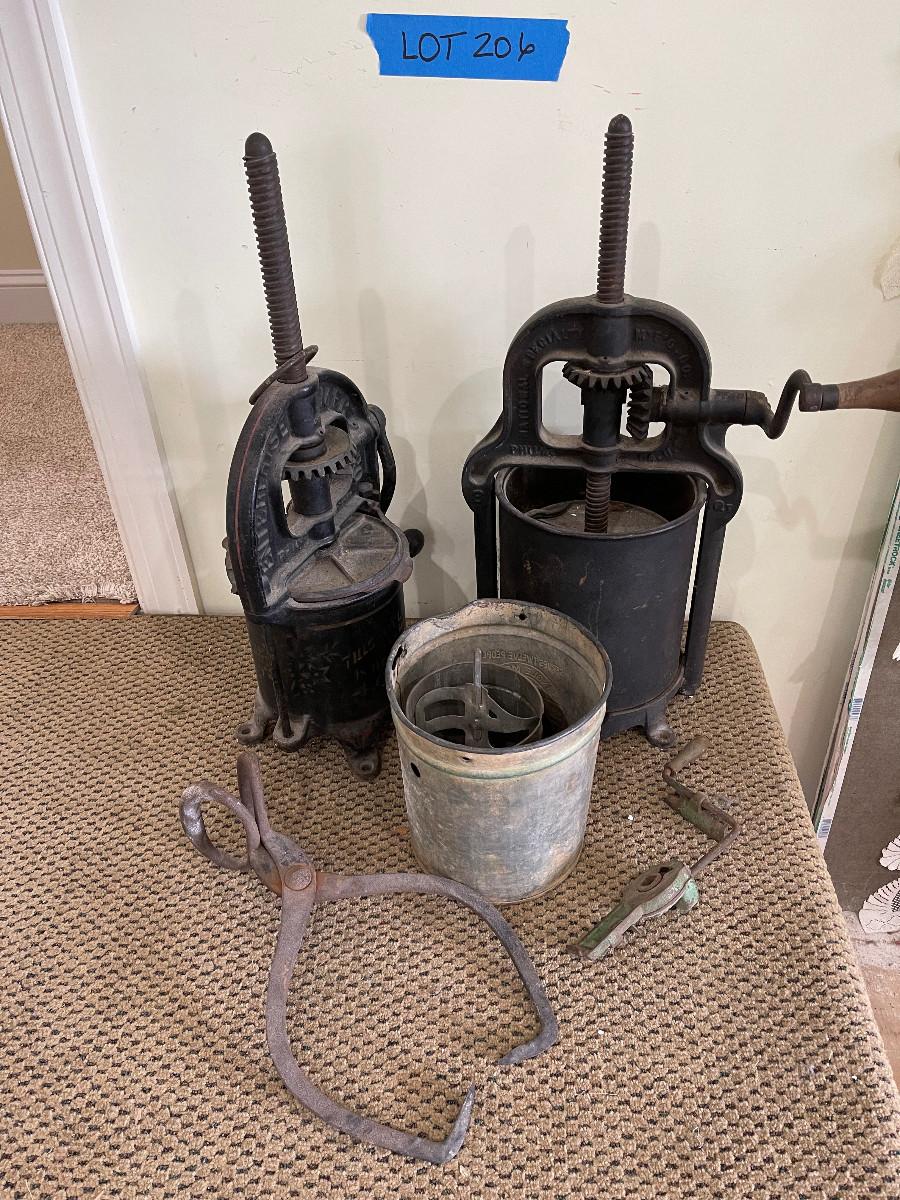 Lot 206 - Antique Presses, Pail and Ice Tongs