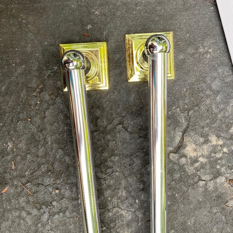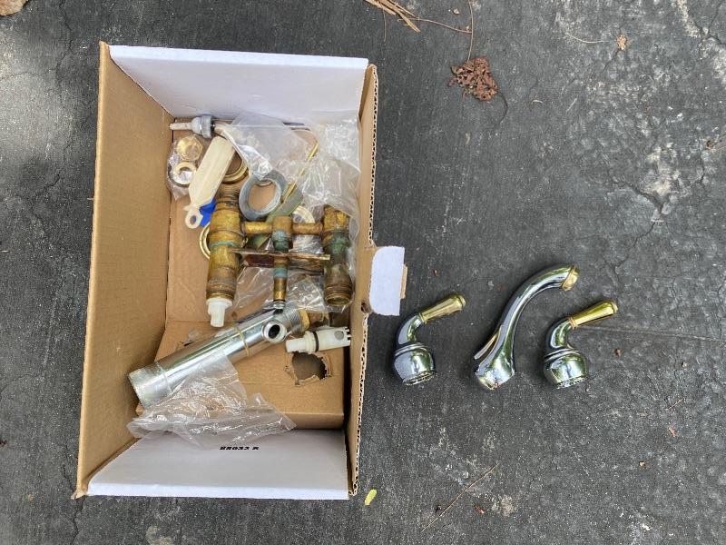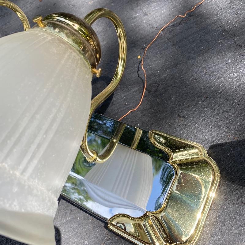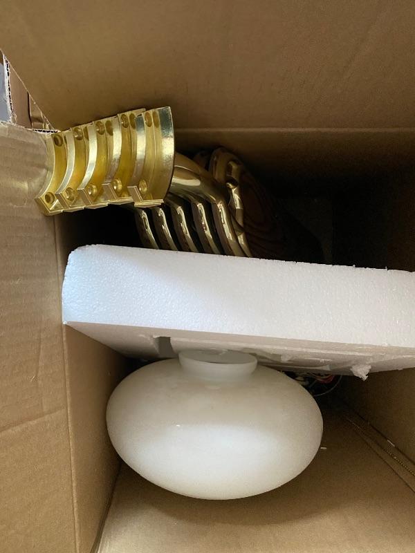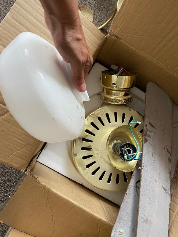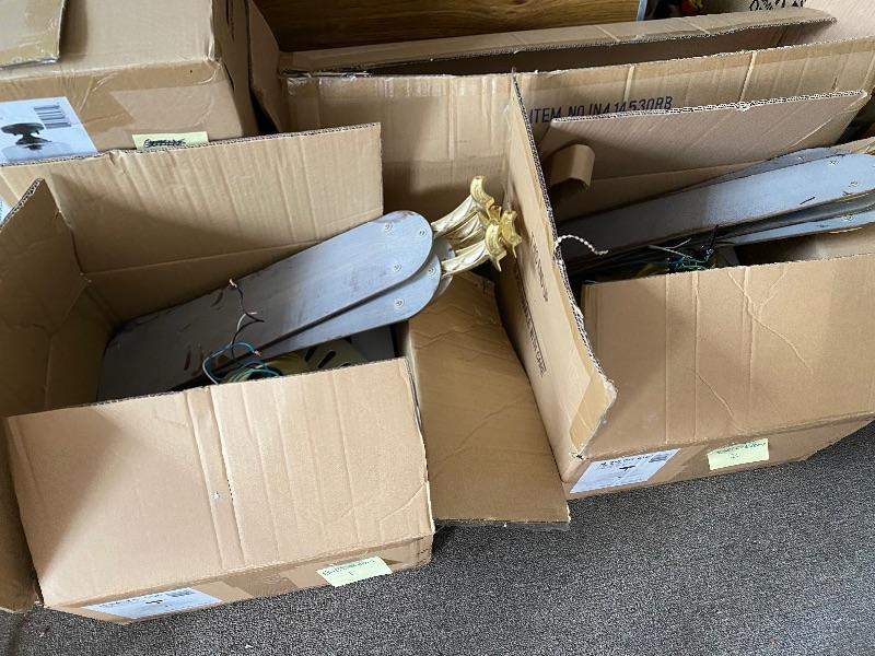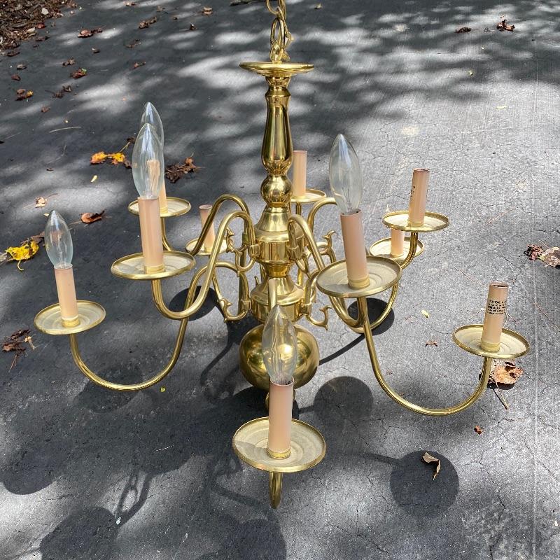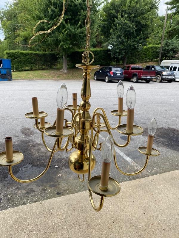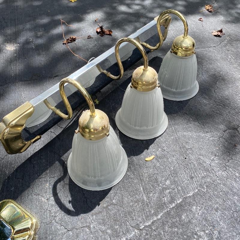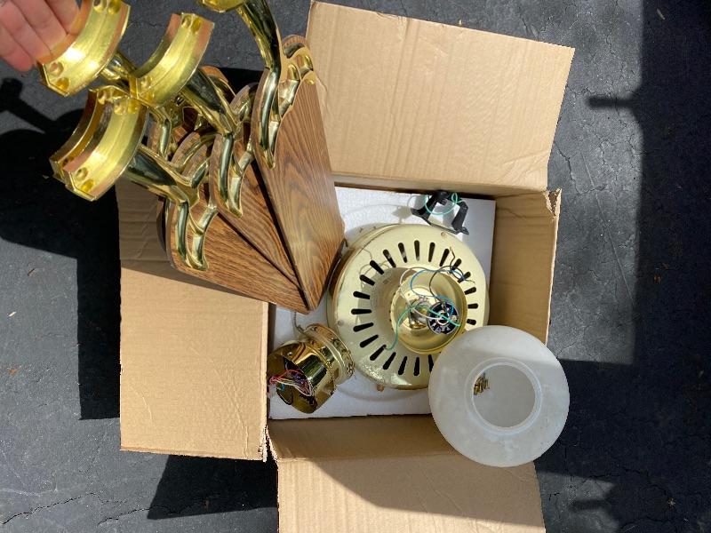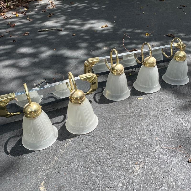 Update the fixtures at your home with this Brass and silver colored lot. There are three brass and glass overhead lights, one brass colored chandelier, four ceiling fans with wood colored blades, two bathroom over head lights in gold and silver (one three light and one two light) and two 18” silver bathroom towel holders and two silver and gold towel holders (both with matching toilet paper holders) and a nice gold and silver three hole faucet.