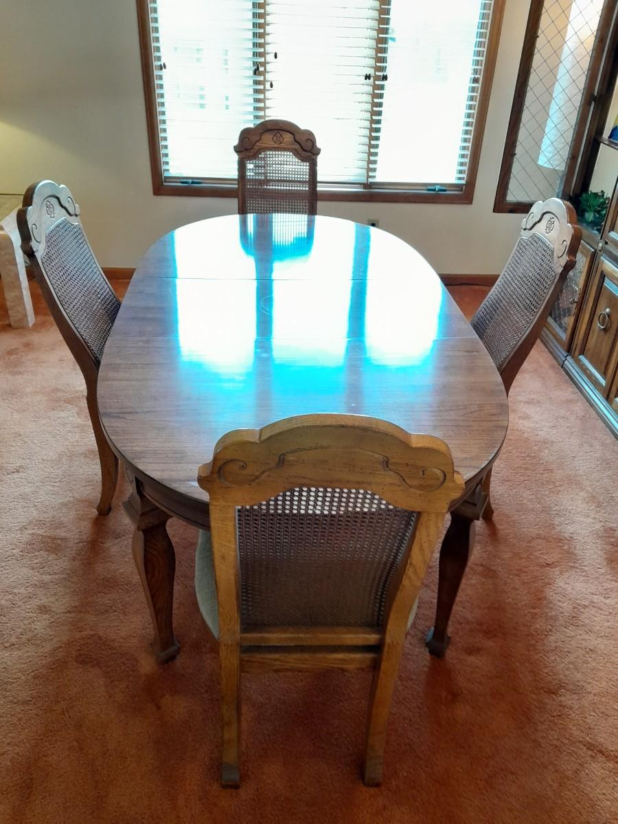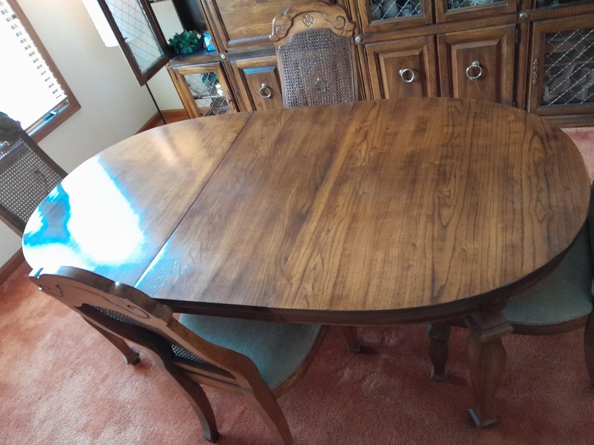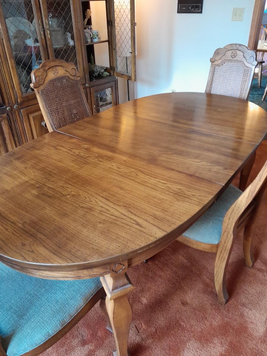 BROYHILL DINING TABLE WITH LEAF AND FOUR CHAIRS TBALE IS 78" X 42" WITH AN 18" LEAF