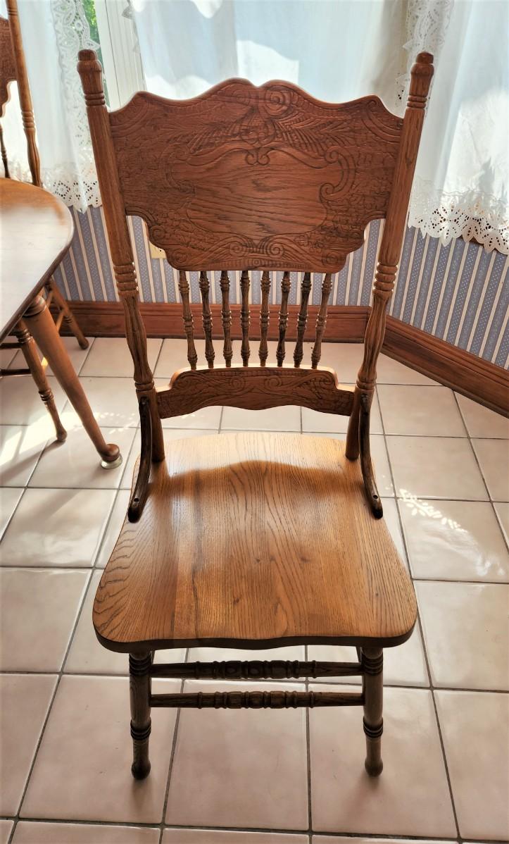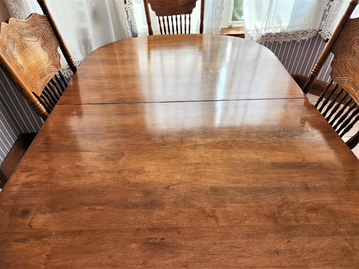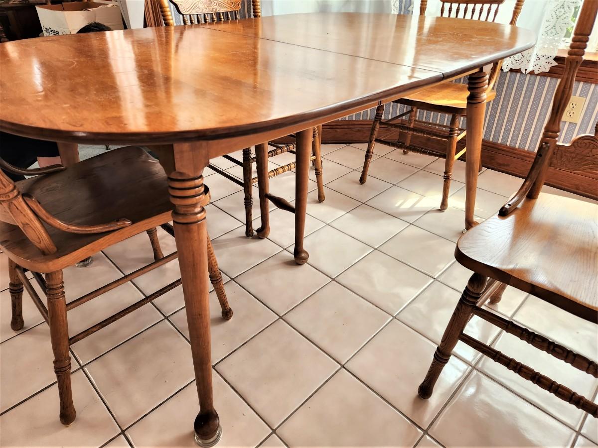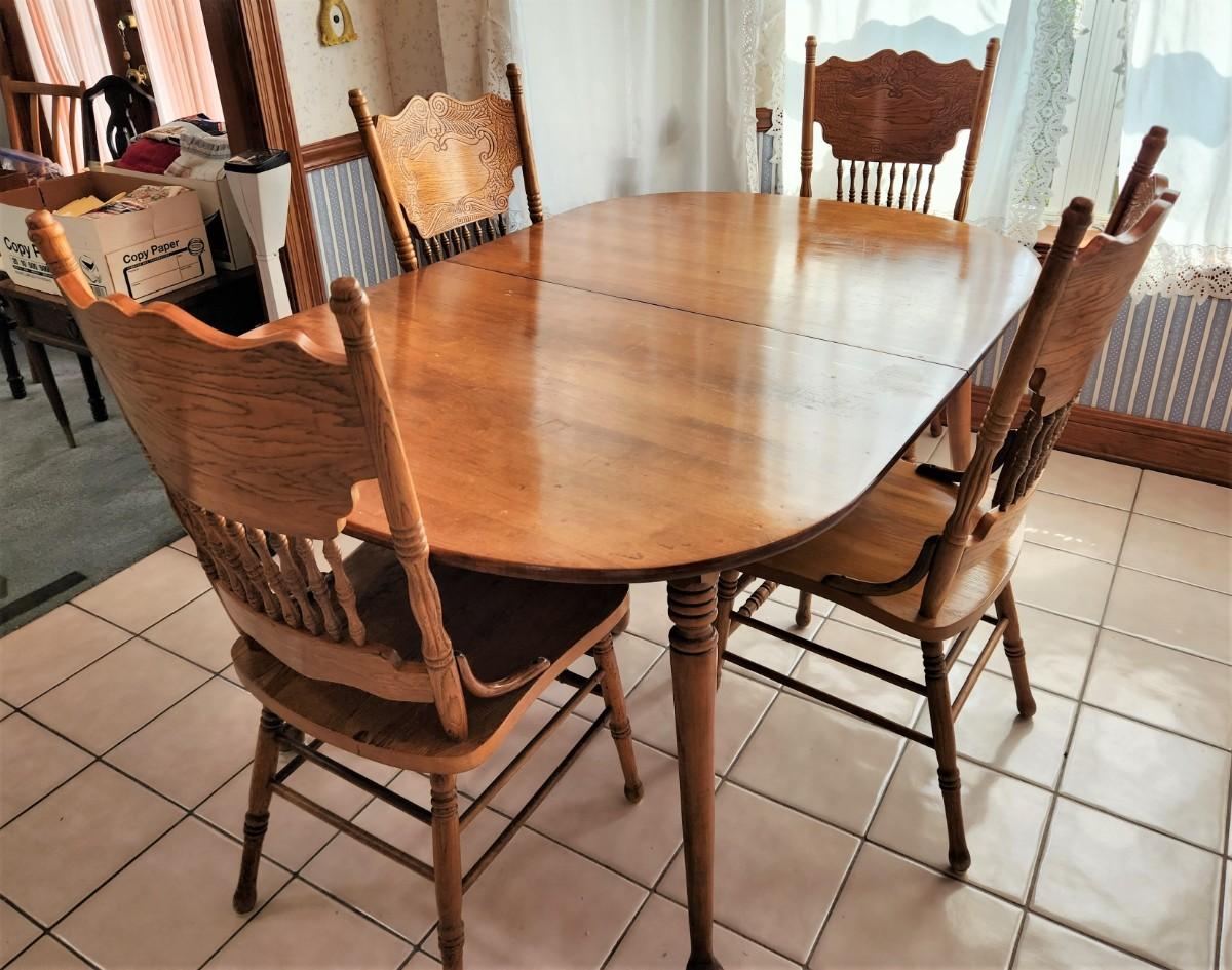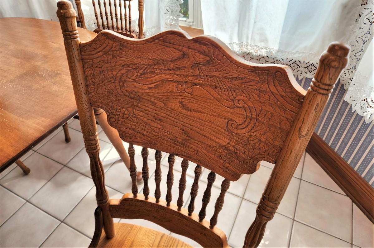 Oak finish early American style dining room table with 4 chairs/2 leaves. Chairs are marked "Woodcraft - New Orleans". Used condition. Without leaves, table is 42" across, 62.5" long, 29.5" tall. Chairs are 43" tall at the back and 19" wide. Each leaf adds an additional 12" to the length of the table.