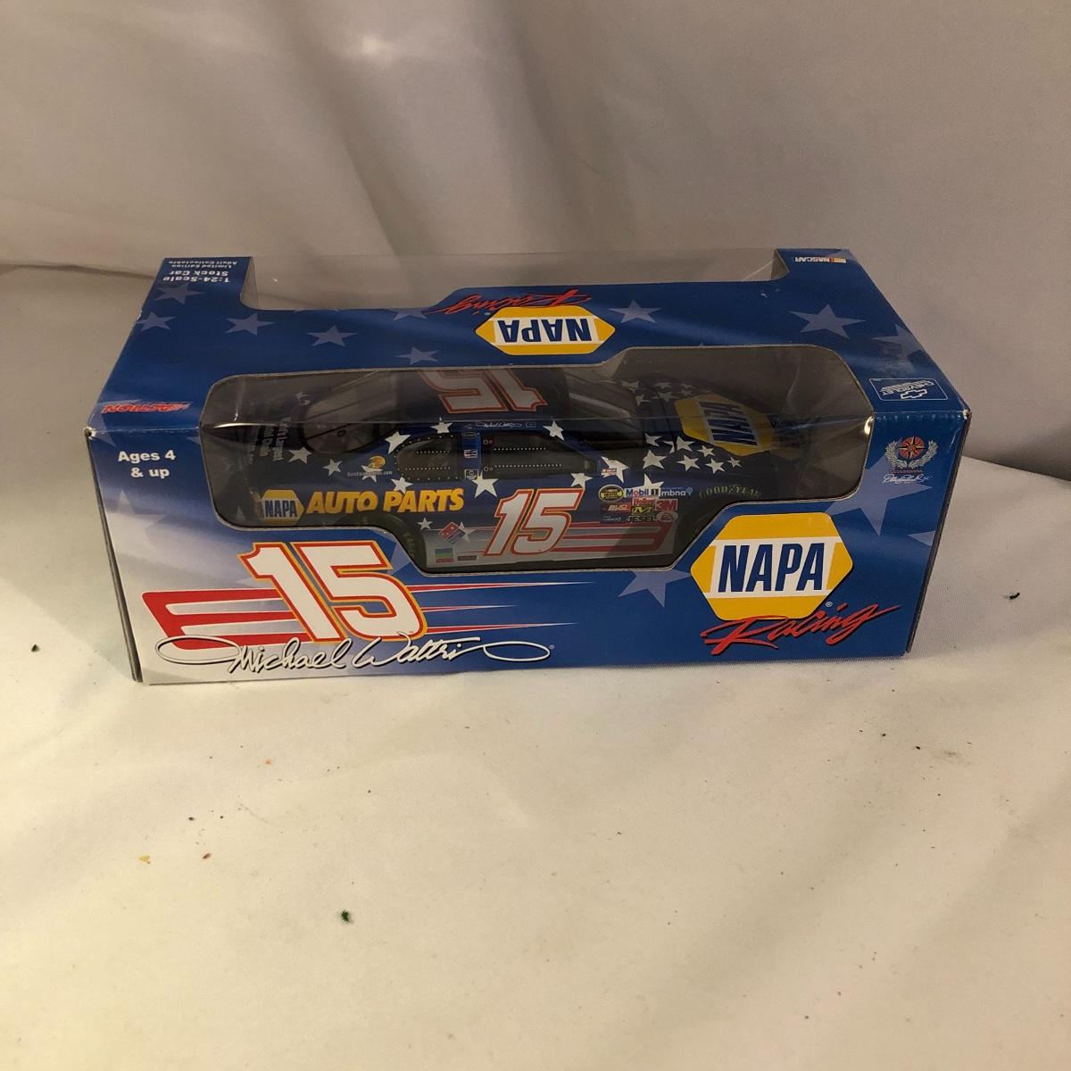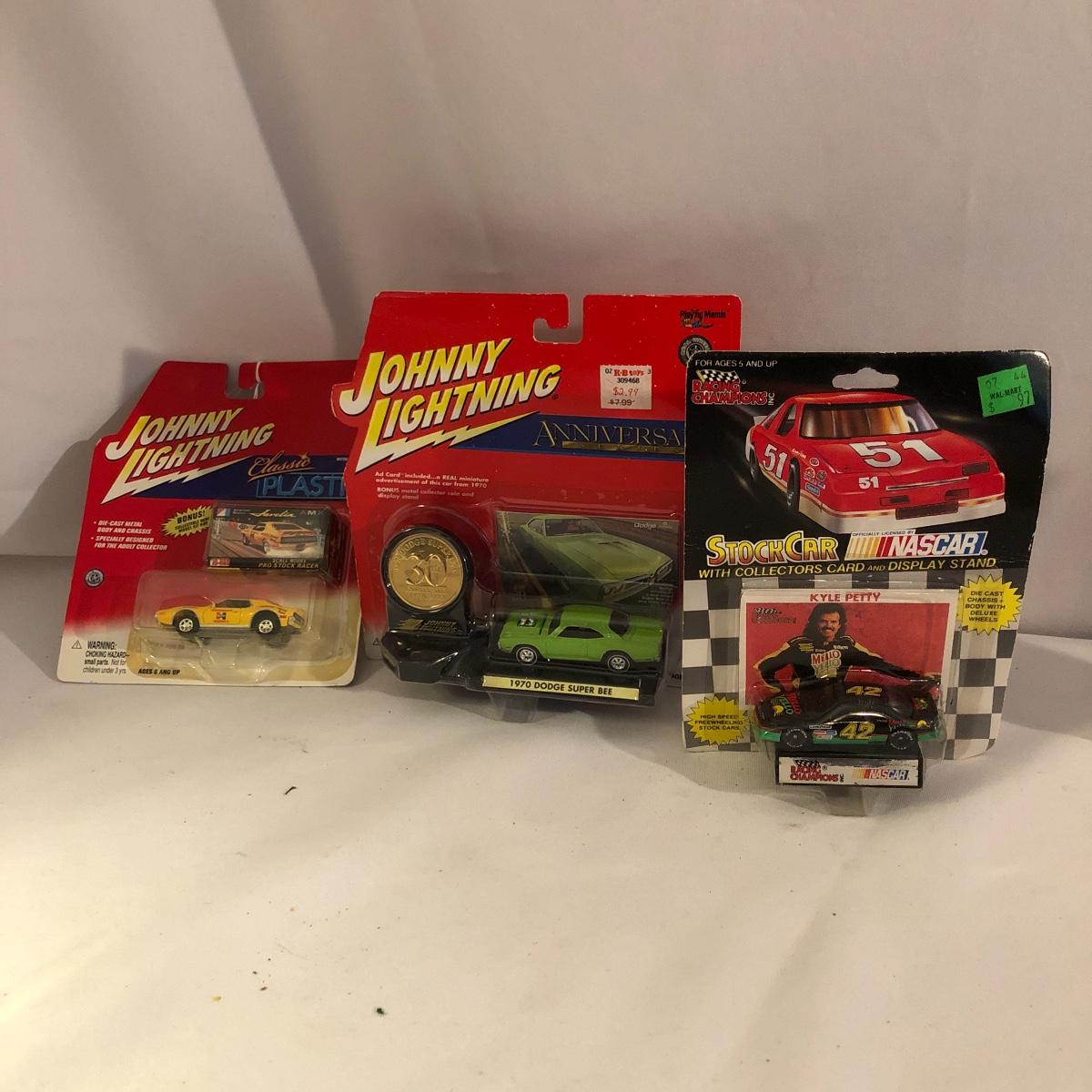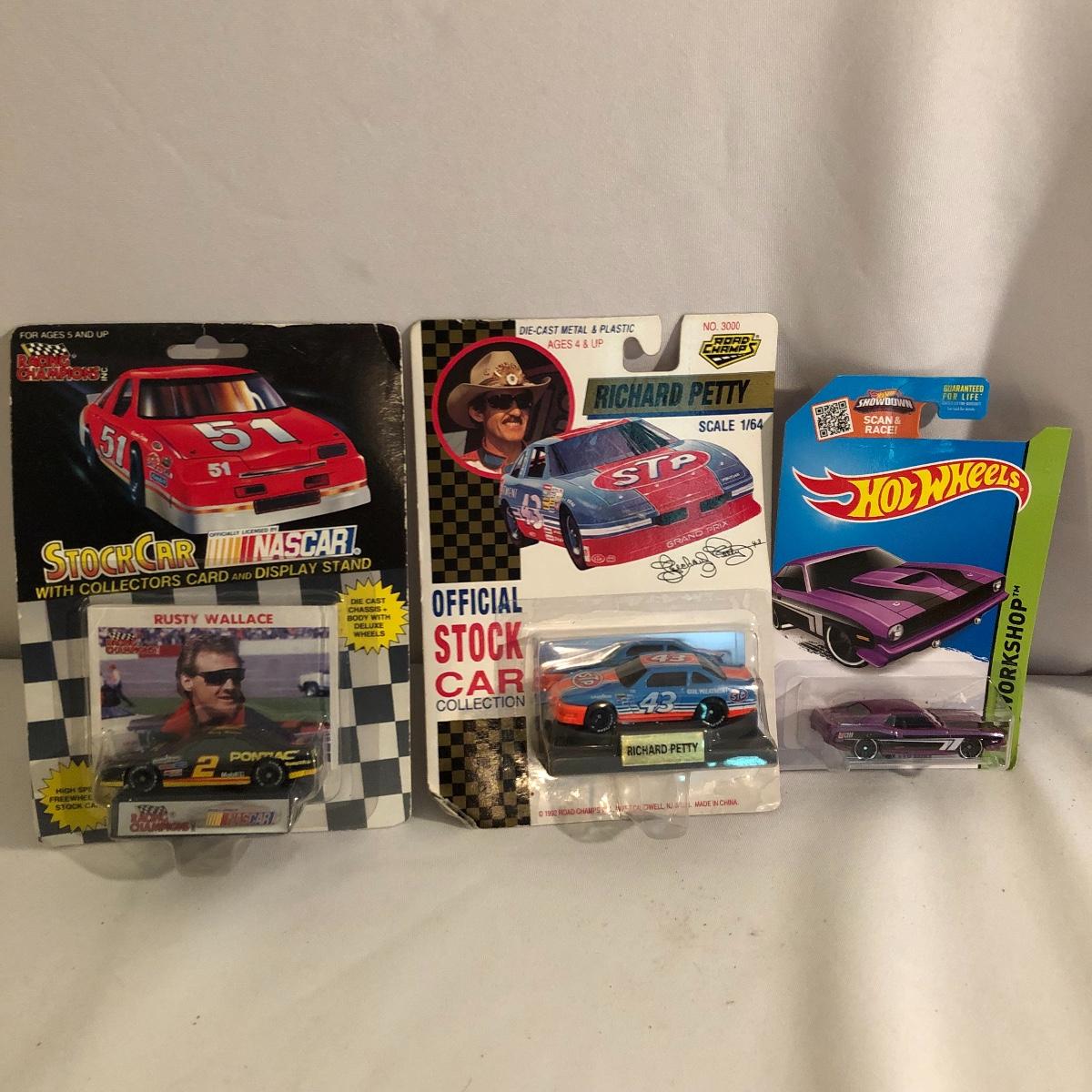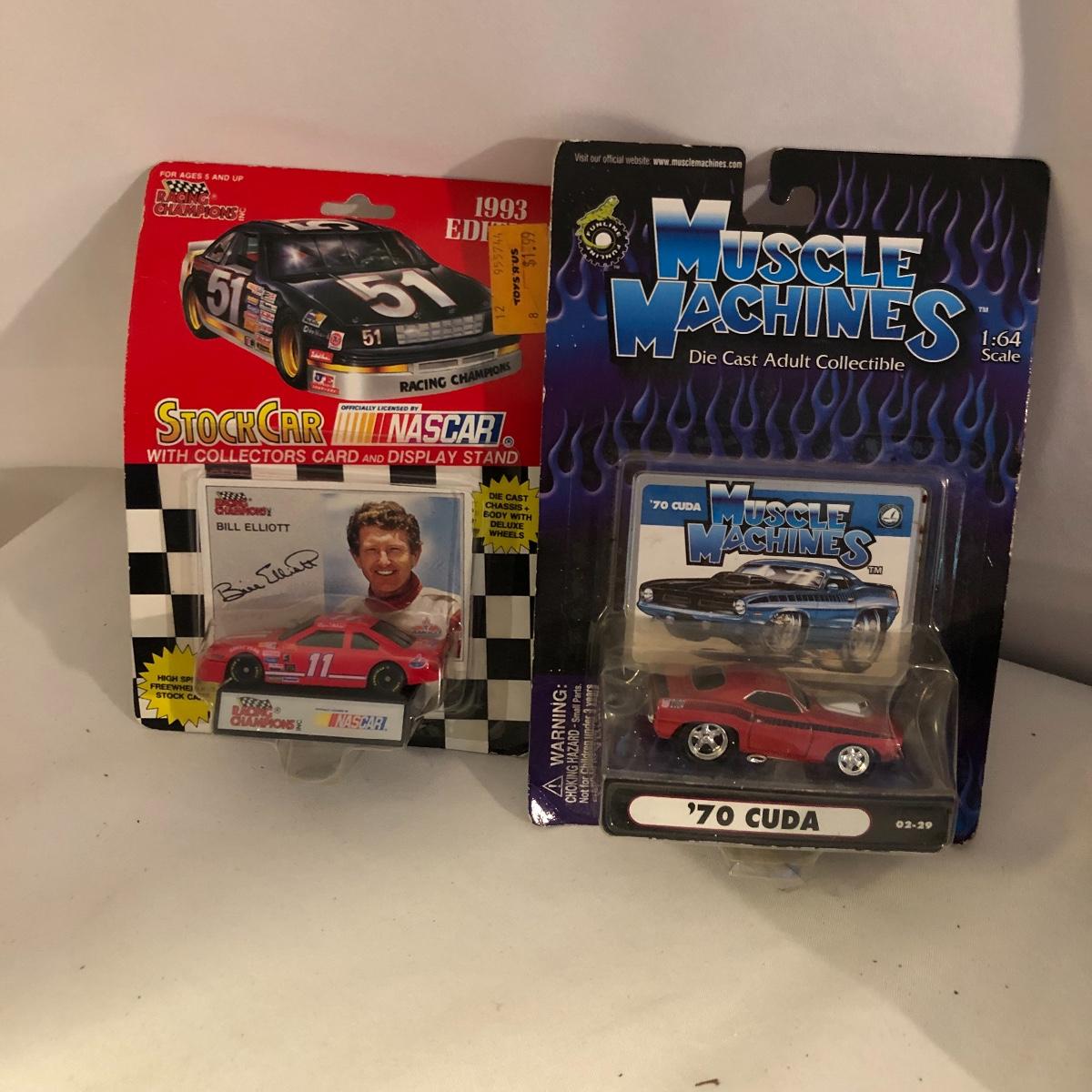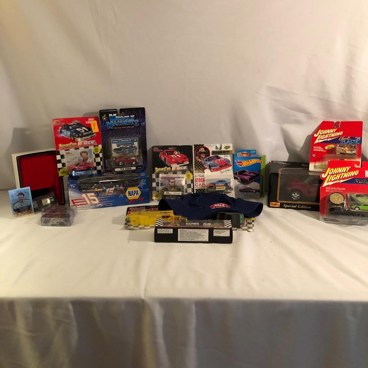 This lot is for NASCAR fans and those who adore muscle cars! This lot includes a NAPA Michael Waltrip Car, Road Champs Richard Petty car, Alliance race team cars, PT Cruiser Maisto car, Dale Jarrett bucket hat and more.
