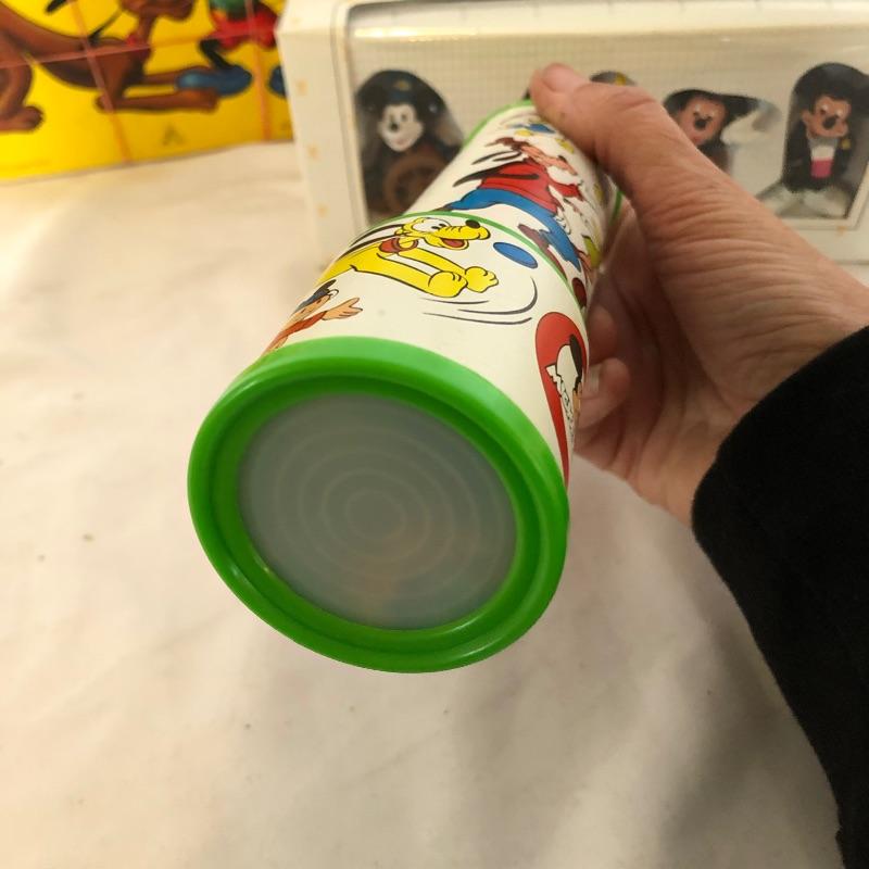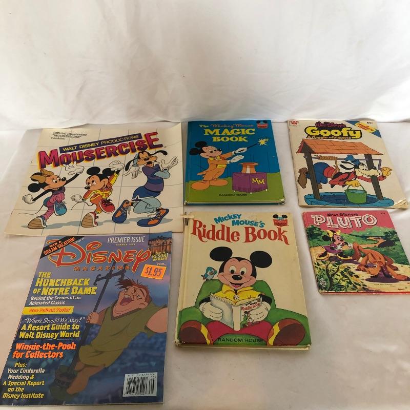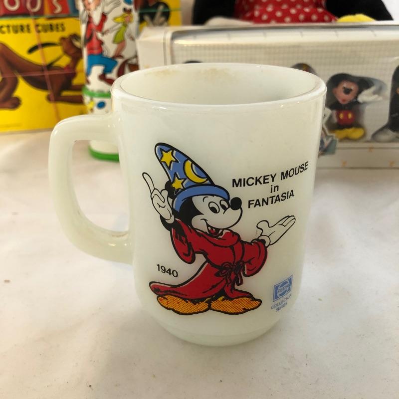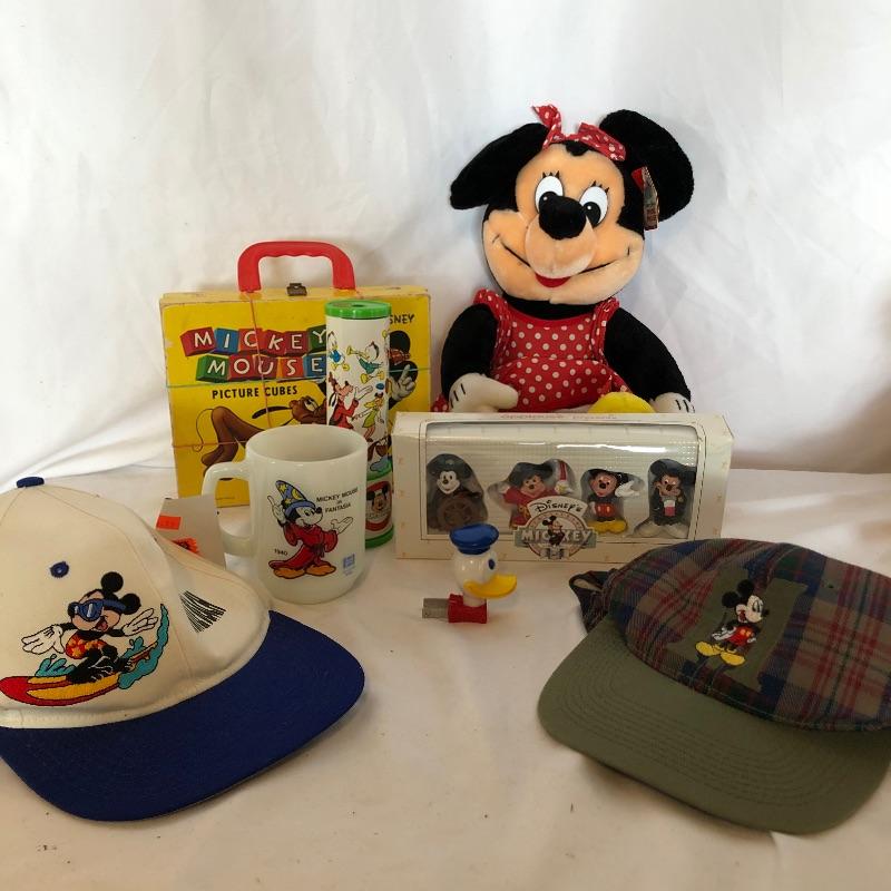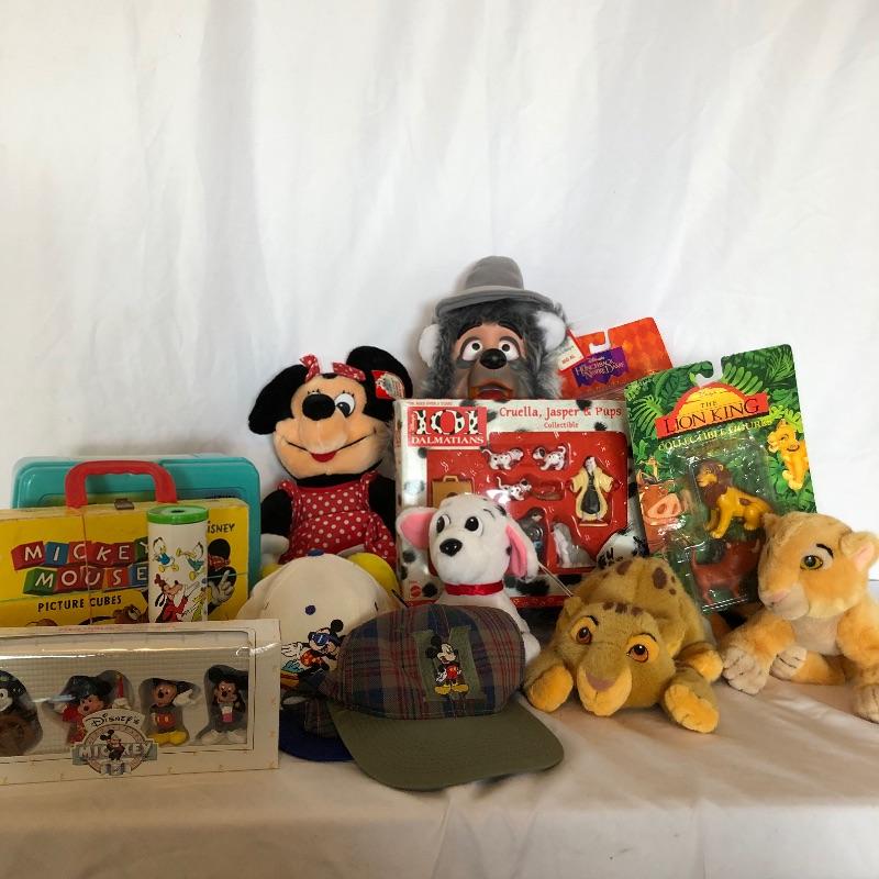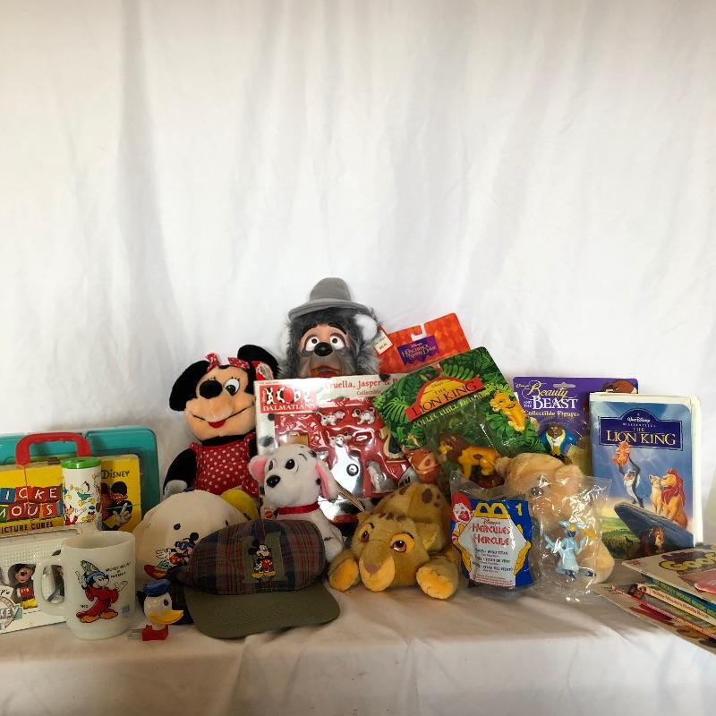 So many vintage Disney collectibles here. See images for all that we have included but to name some of the many vintage items, Little Mermaid lunch box with flask, Lion King plush animals, VHS and figures, Minnie Mouse stuffed animal, mug and much more. The two t-shirts and one sweat shirt are size large and one sweatshirt is size small. Please note the Mickey Mouse picture cubes is missing one cube. There are well loved items and some still in their packages. see pix for details. Shipping available.
