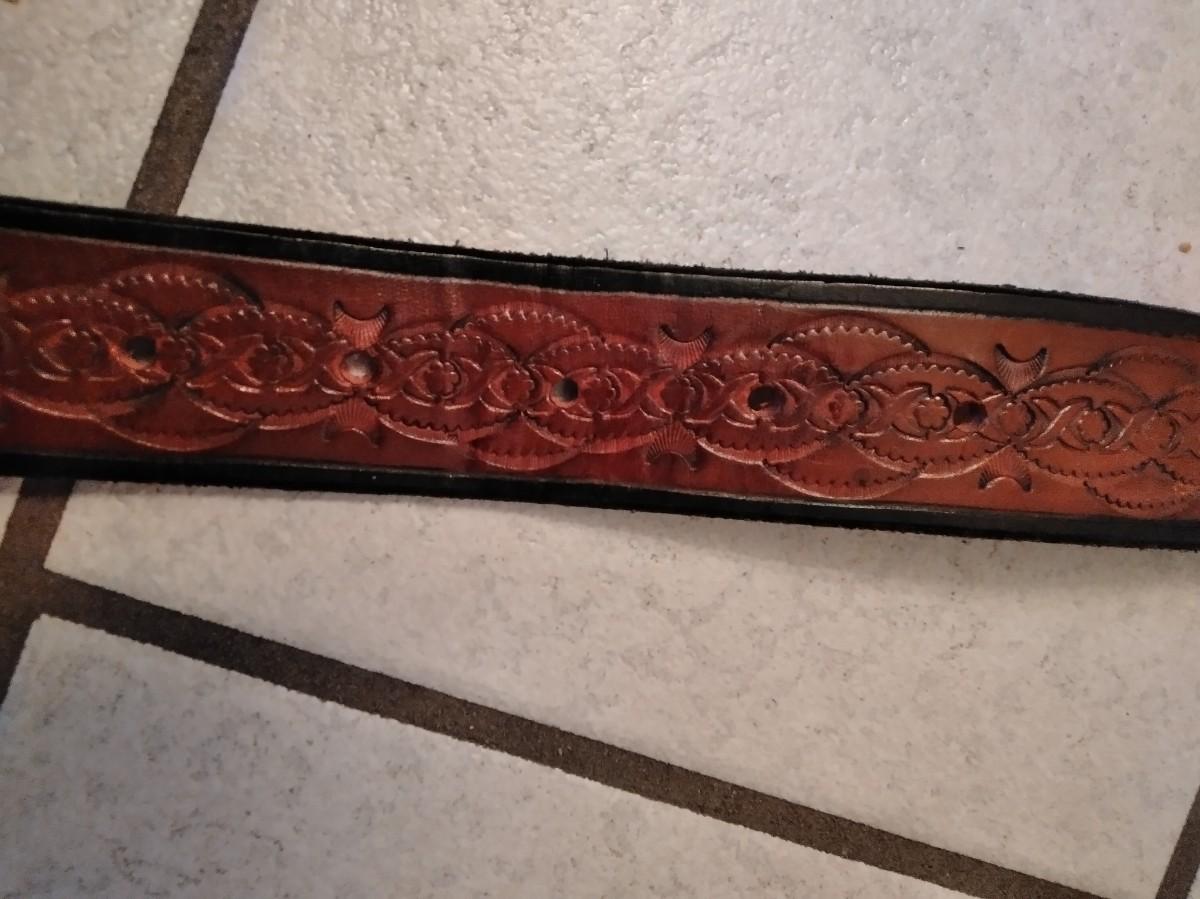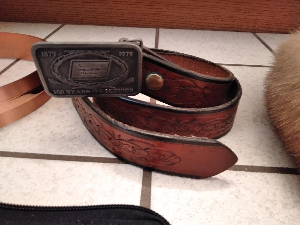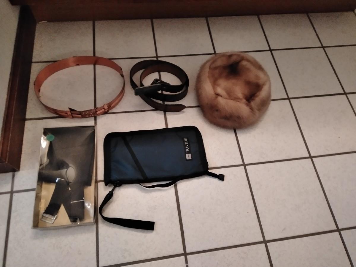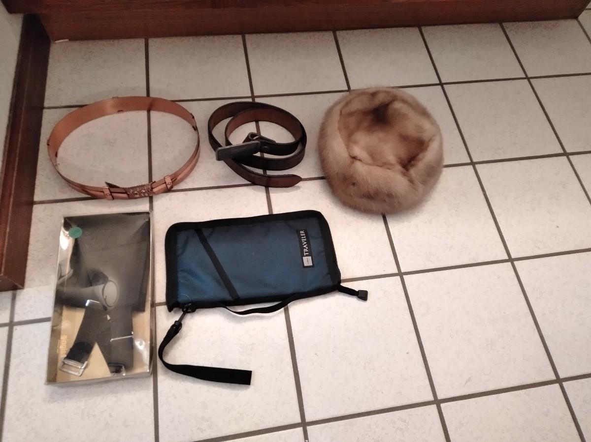 GINGISS CUMBER BUN, LEATHER TOOLED BELT WITH BUCKLE, METAL GOLD COLORED BELT? FUR CAP, AND A TRAVEL BAG.