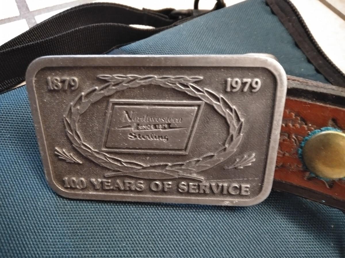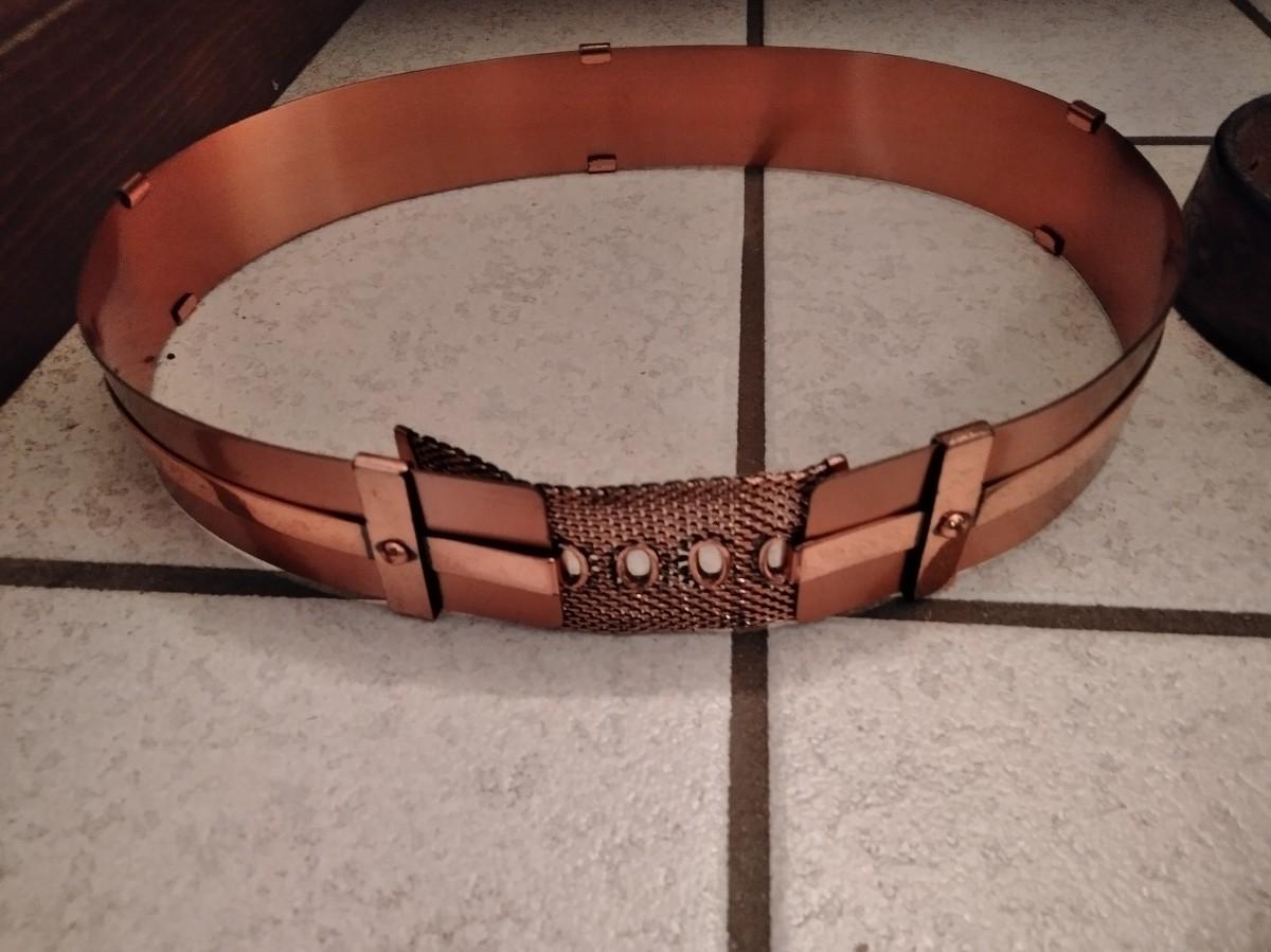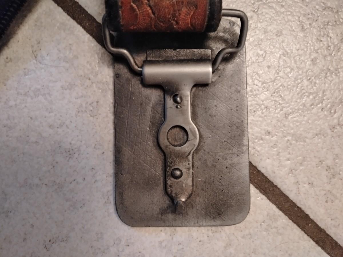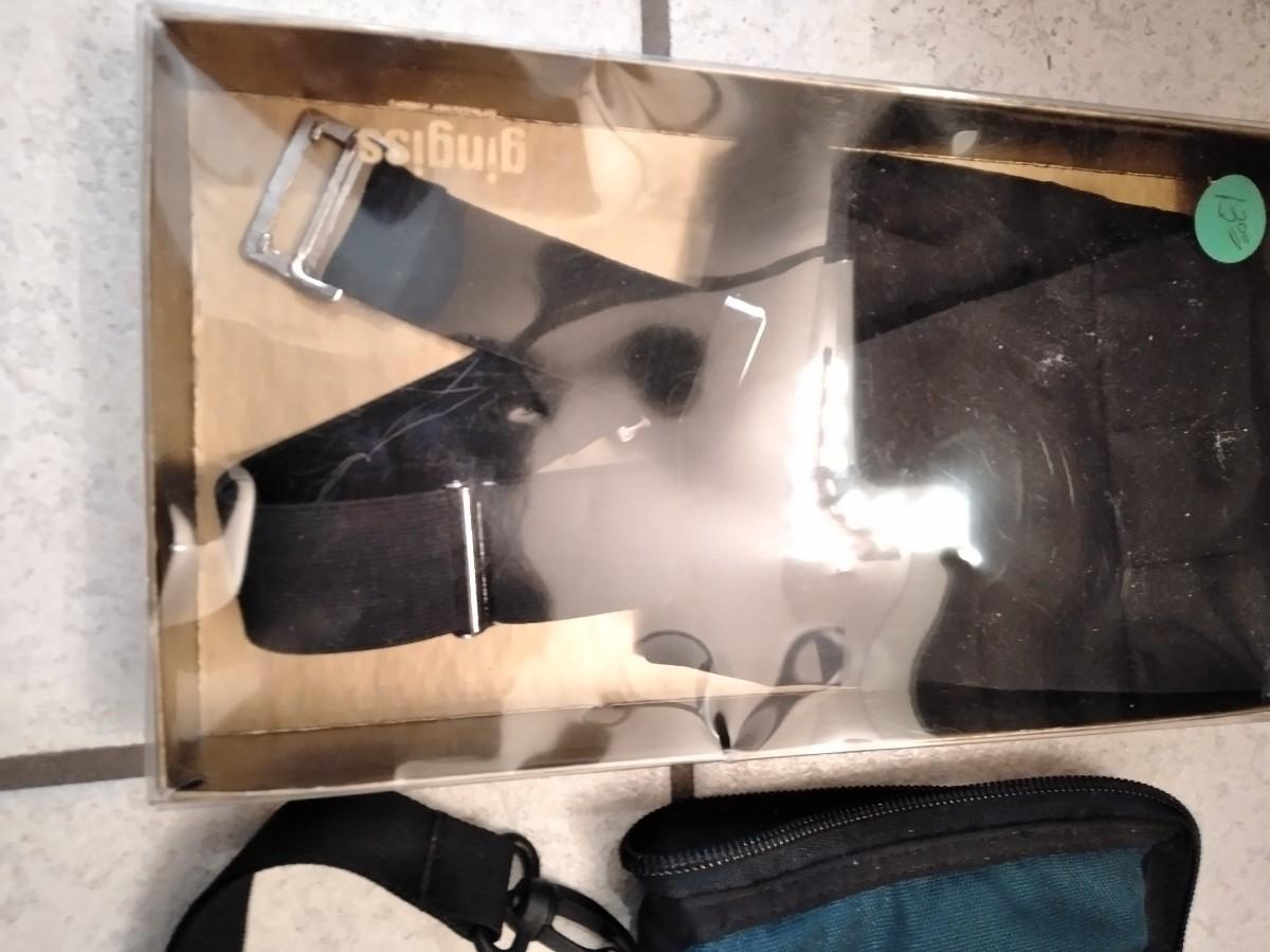 GINGISS CUMBER BUN, LEATHER TOOLED BELT WITH BUCKLE, METAL GOLD COLORED BELT? FUR CAP, AND A TRAVEL BAG.
