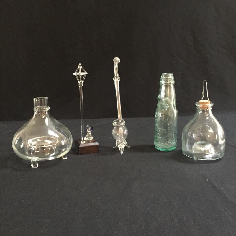 Selection of glass collectibles including John Dyson bottle , German Fly Trap, vase , glass pipe , candle holder and dog artwork.