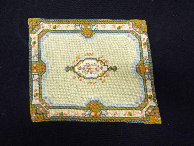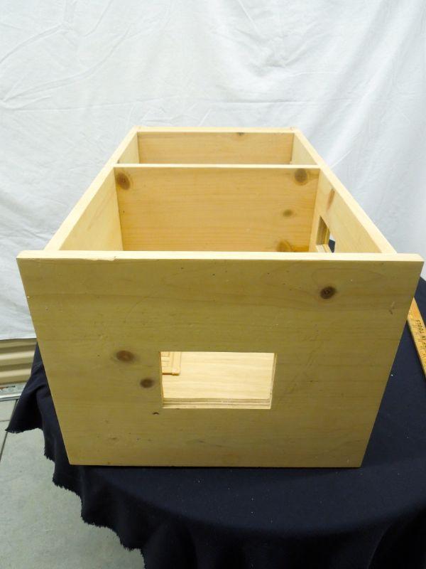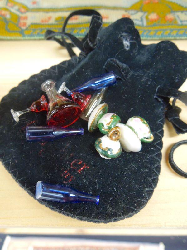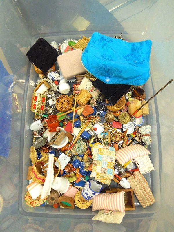 Solid pine dollhouse is 30"H x 17" W x 14" D. Has two levels. One exterior door is broken. Plastic bin full of miniature household accessories including several area rugs (one is needlepoint), small ceramic teaset, glass bottles and much much more.