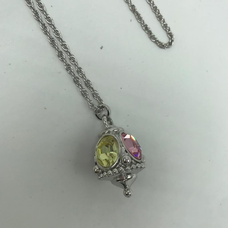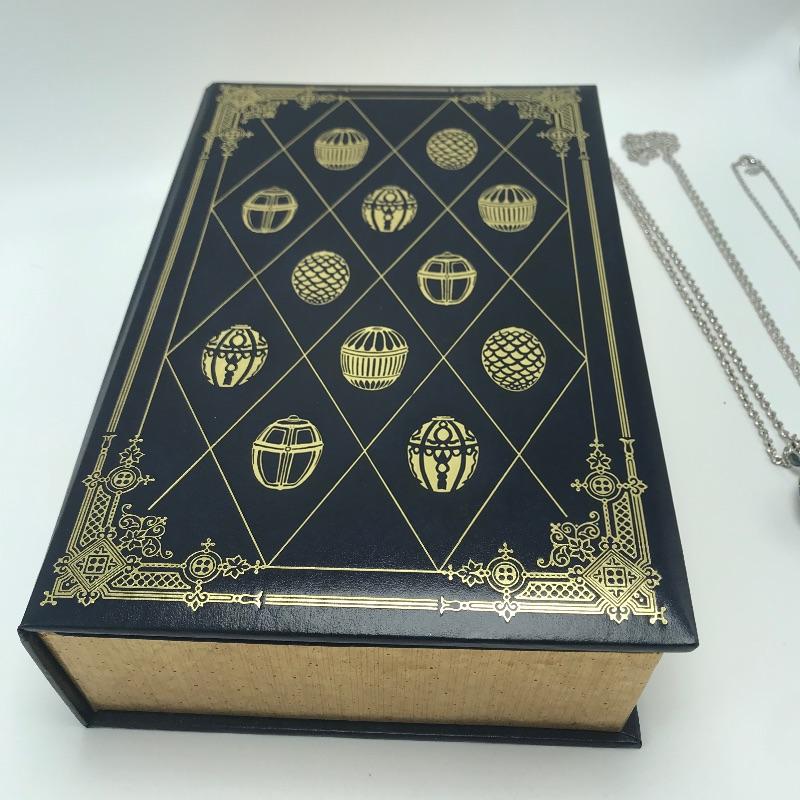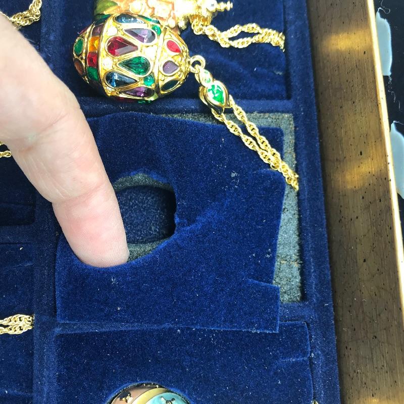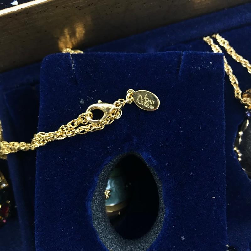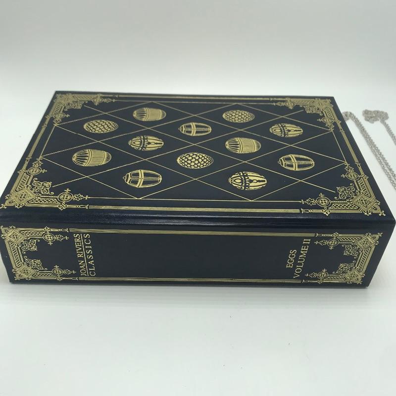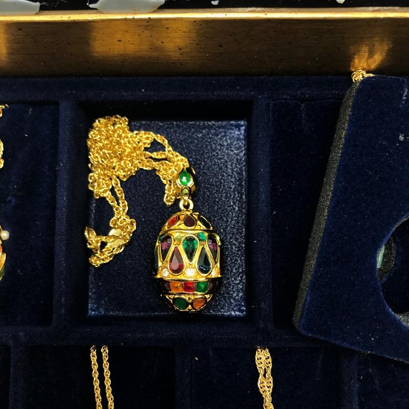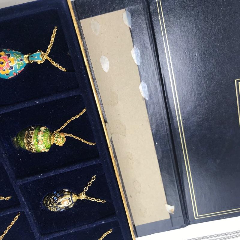 Breathtaking collection of eighteen golden colored necklaces each with a unique and stunning egg by Joan Rivers. Each egg is a pendant on a golden colored chain, one chain is missing a piece of the clasp, which appears to be a minimal repair. The eggs rest in a “book” entitled “Joan Rivers Classics, Eggs, Volume II”. The box shows a little wear, the blue cloth on the foam insert needs to be re-attached in spots and the binding could use a little glue. Lot also features three silver colored chains with one colorful egg and another jeweled pendant. See photos.