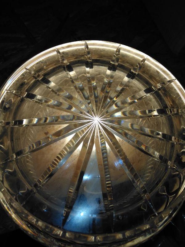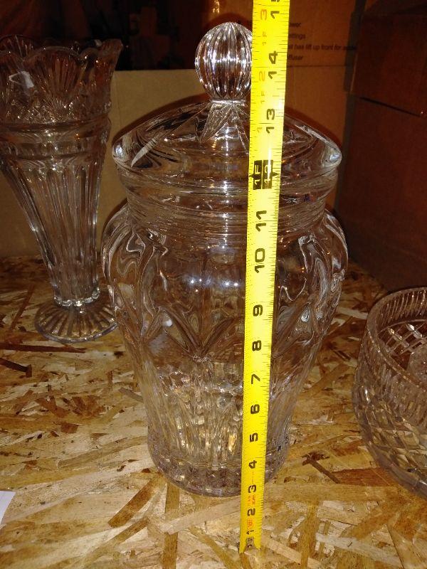 LARGE LIDDED GLASS COOKIE JAR, LARGE 14" CRYSTAL GLASS VASE, LARGE 8" BOWL, AND TWO SMALLER CRYSTAL DISHES.
