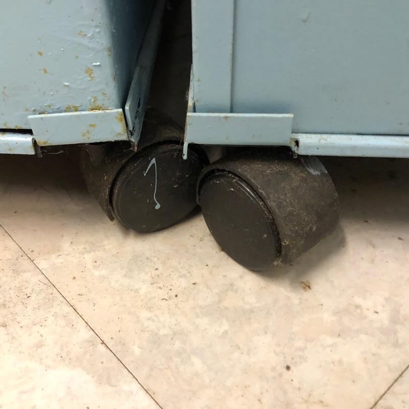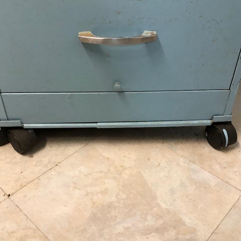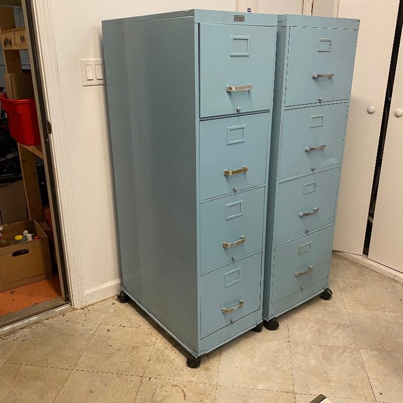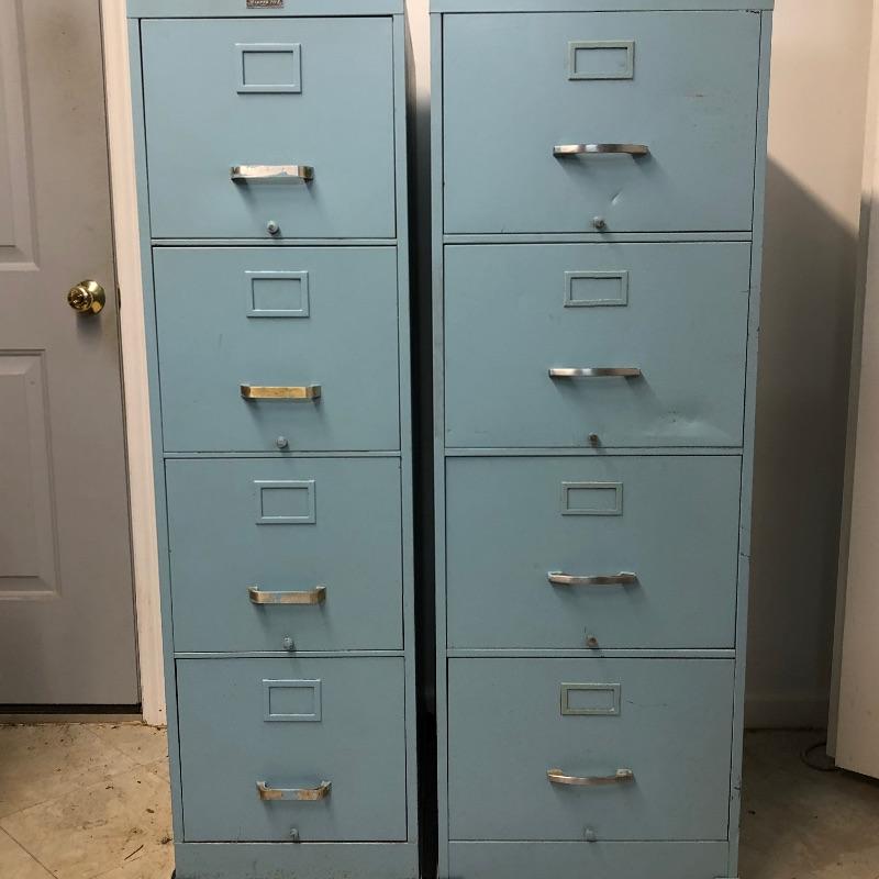 Looking for some storage? Look no further! This lot includes a pair of baby blue metal filing cabinets with wheels. Each cabinet has 4 drawers. Wider one measures 25” deep x 18.5” wide x 54.5” tall. Second cabinet measures 26” x 15” wide x 54.5” Local pick up only.