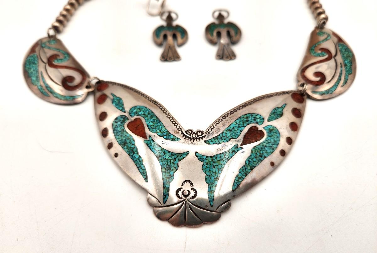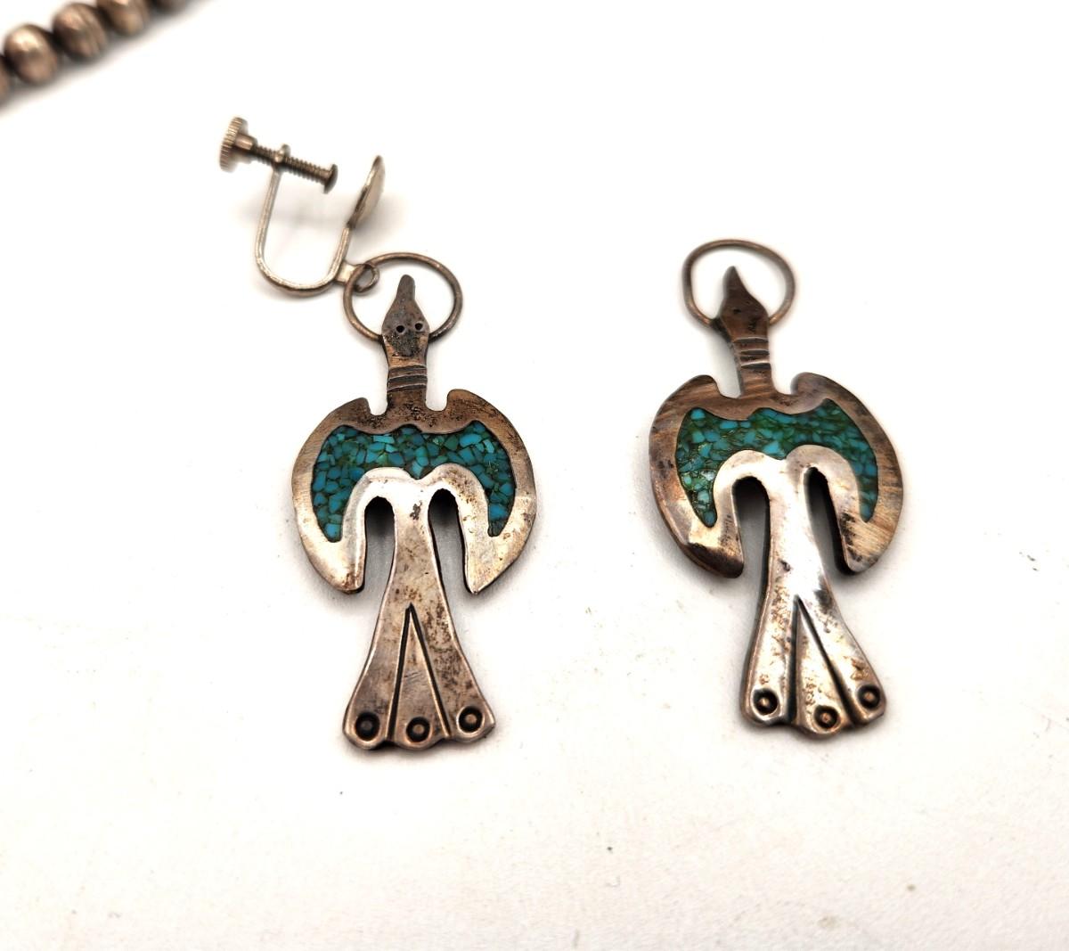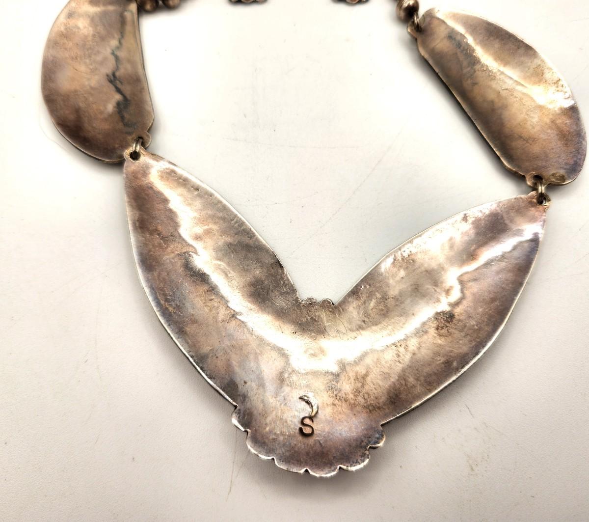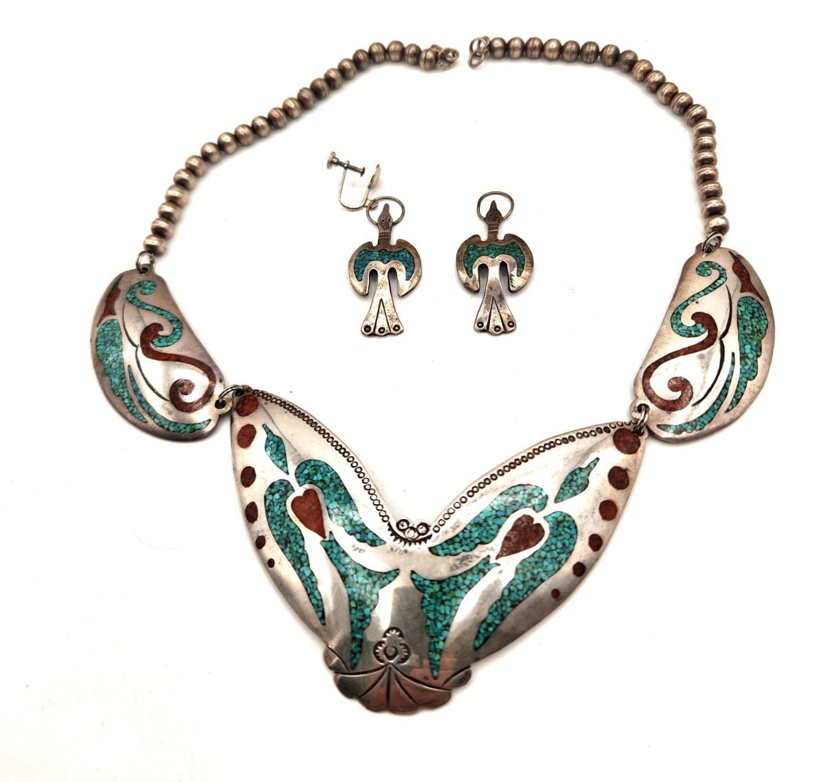 This fantastic Sterling necklace was executed by Navajo artist Thomas Singer before his death in 2013. He was a well known artist know for his turquoise "chip" jewelry. The necklace bears his mark of a crescent moon topped by an "S." Earrings are in the same style, but not by Singer. Singer pieces routinely sell at auction for good prices. Note: One screwback missing (easy repair). There is a very reasonable reserve on this piece. Necklace measures 9" long from the back of the neck. Earrings are 2" long.