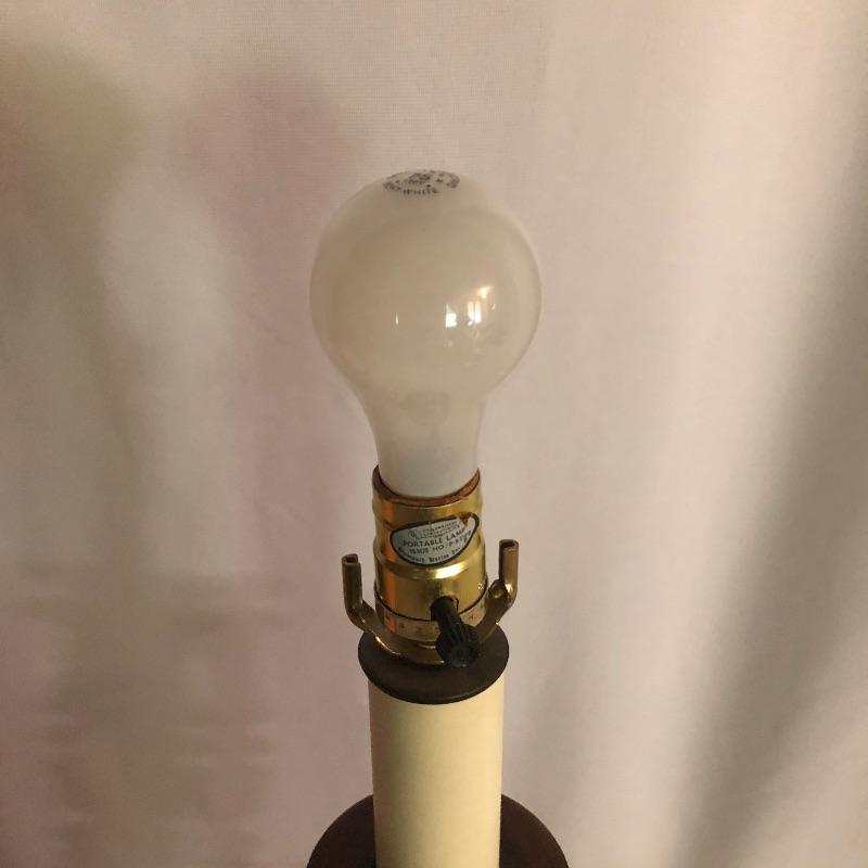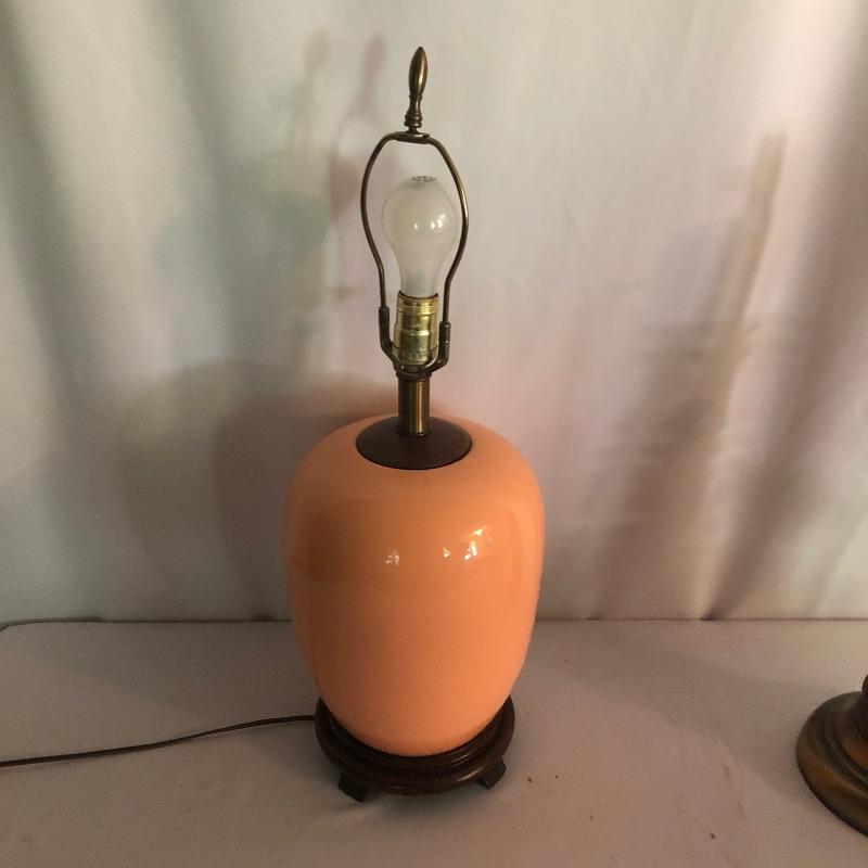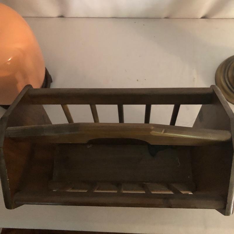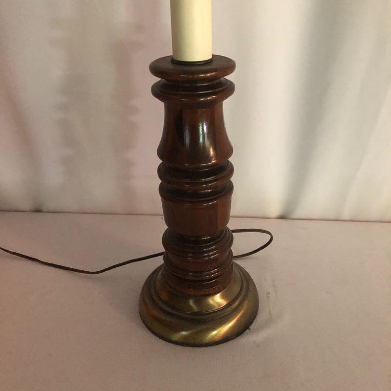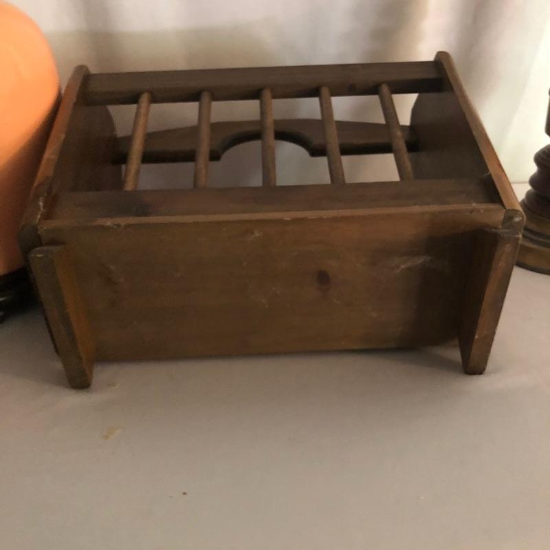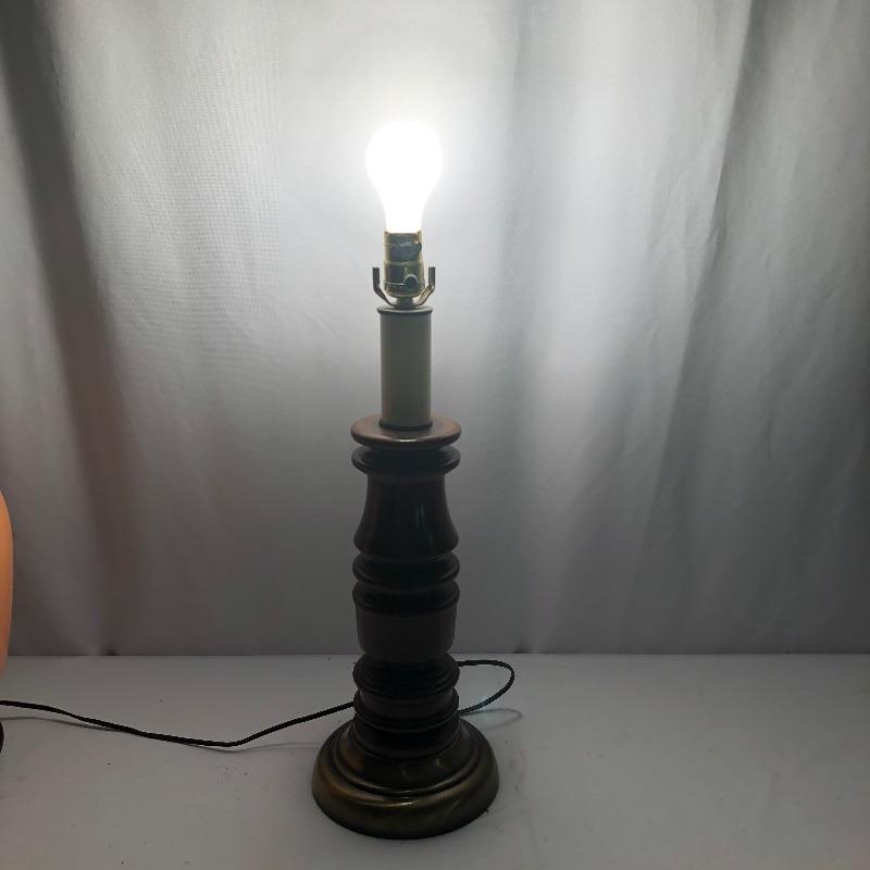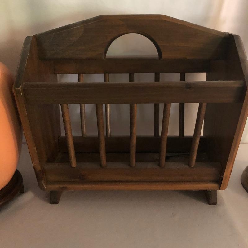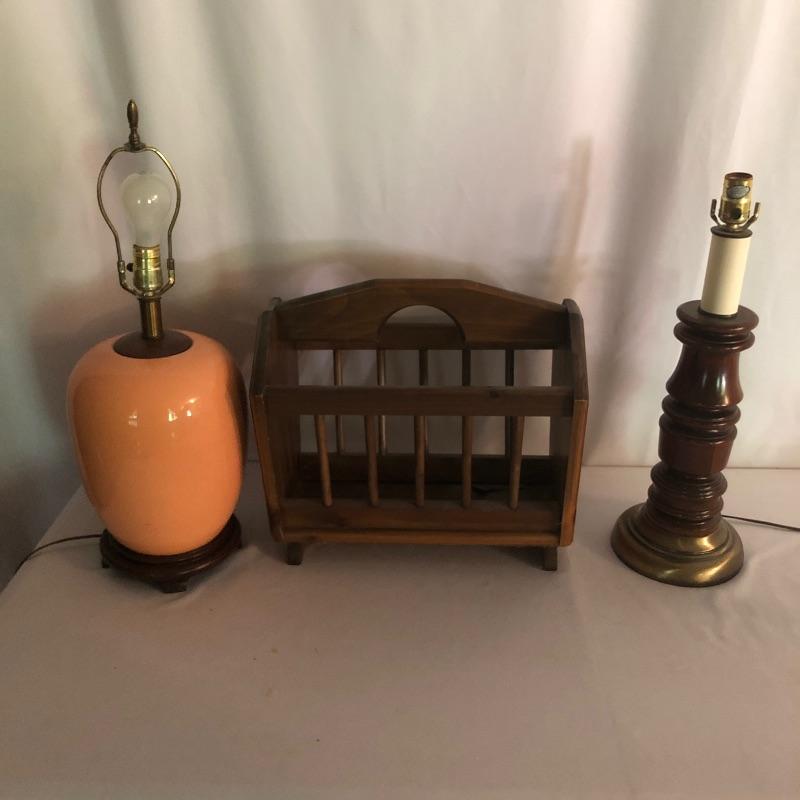 We have paired two nice lamps here of similar height and added in a nice wood magazine rack as well. Both lamps work. They need shades and the wooden one does need a hoop.