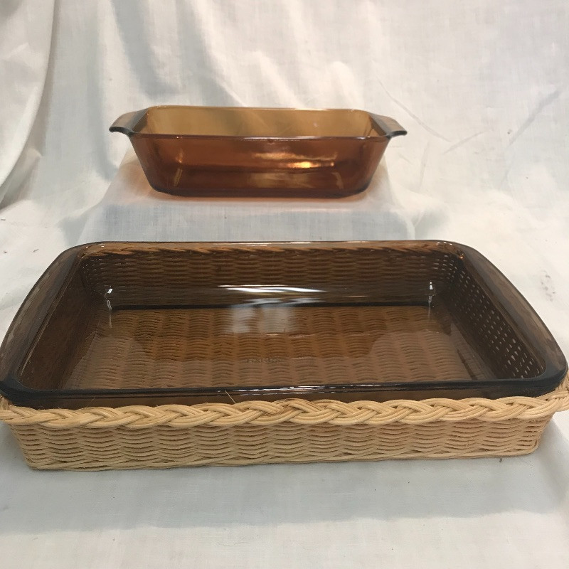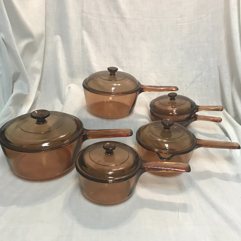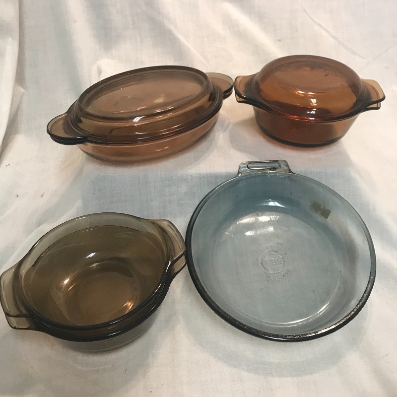Liven up your kitchen with some added color with this great collection of six brown glass cooking pots with five lids, one lid works for two pots. Pots are labeled Vision or Visions with names like Corning, France and Pyrex. Lot also includes a loaf pan and a 13” x 7.75” pan with a fitted basket and two deep 9” Anchor pie plates along with a few other colorful ovenware dishes. See images. Local Pickup Only.