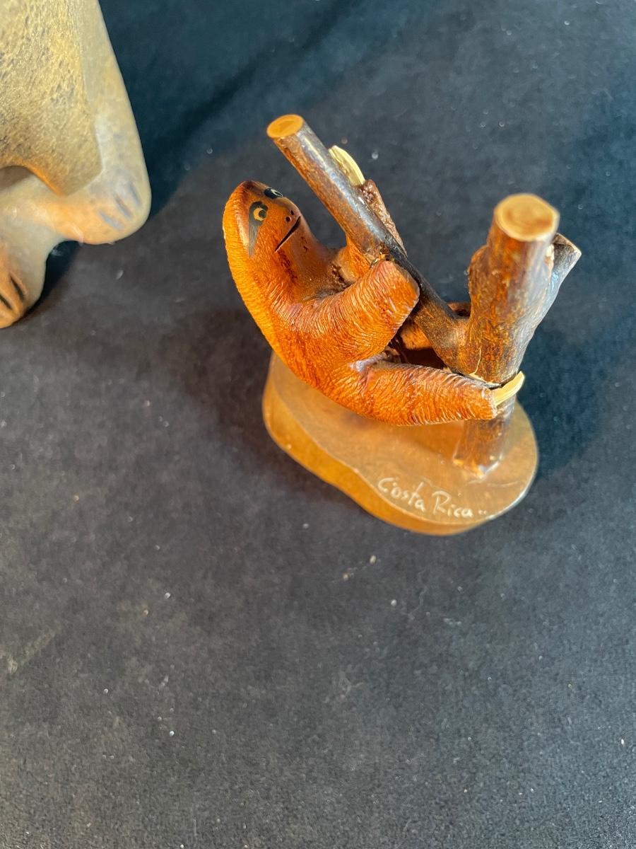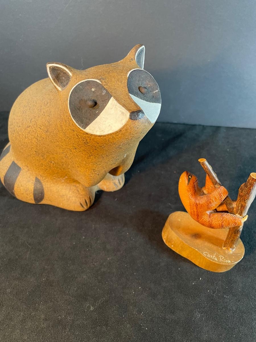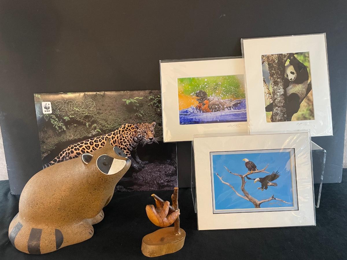 Pottery Raccoon, wooden sloth figurine (repaired), 2022 wildlife calendar, 3 framed photos of wildlife by Mark J. Thomas
