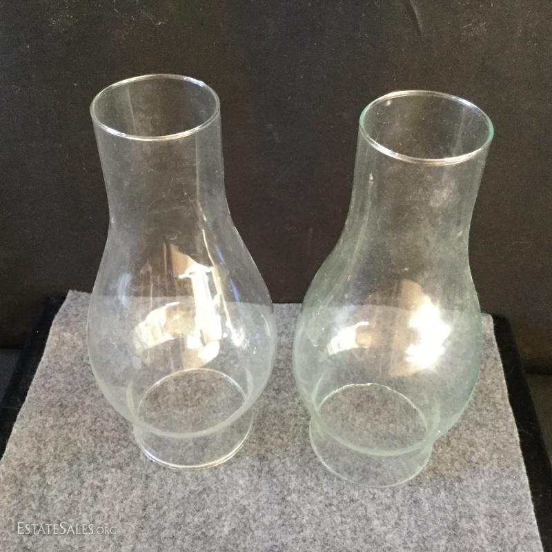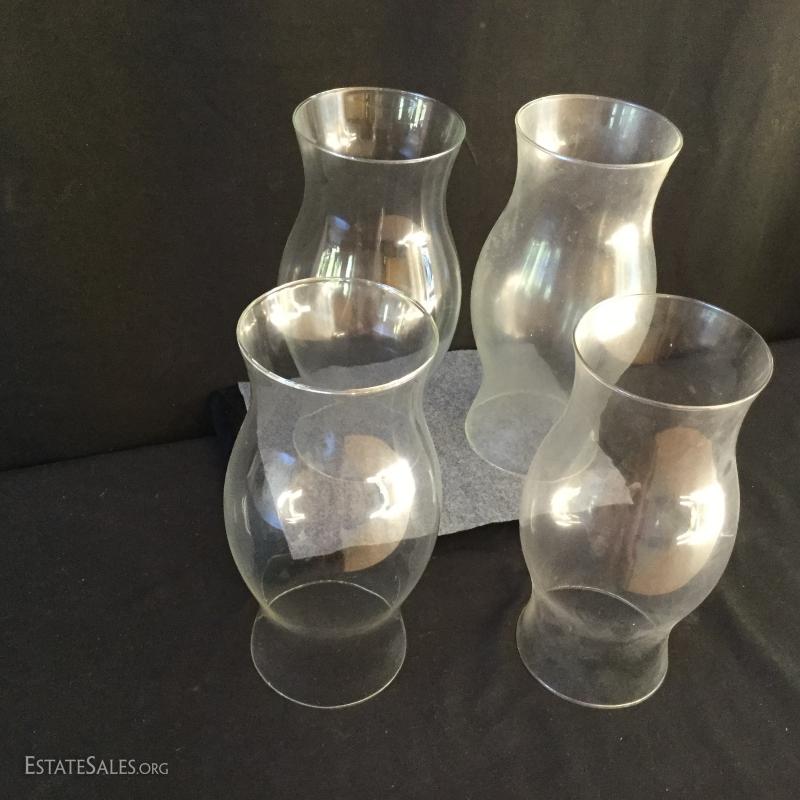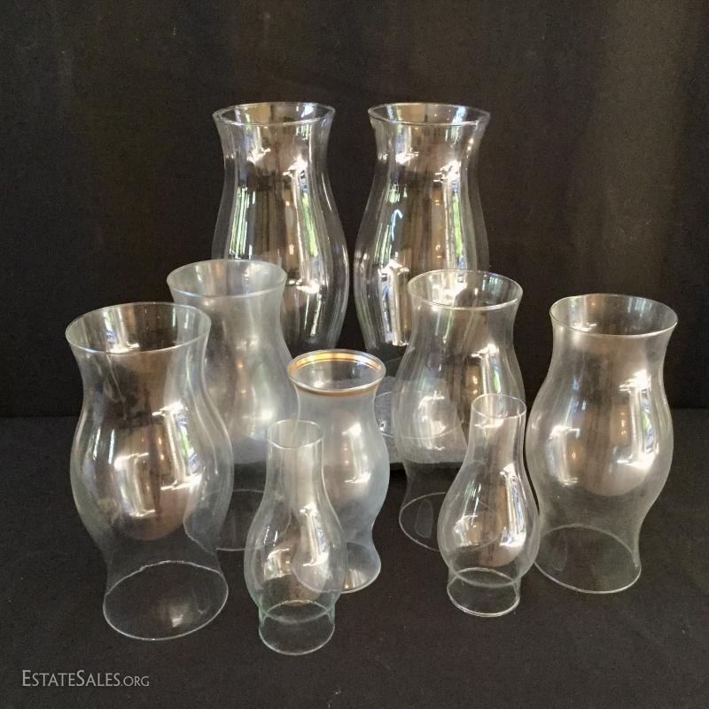 Two large (16"tall x 7"w) and four small (12" tall x 6" w) hurricane lamps. Add candles for a beautiful table setting at your next party. Also includes two 9" tall glass chimneys for gas lamps. See photos. No shipping. Only local pick up in Flat Rock, NC.