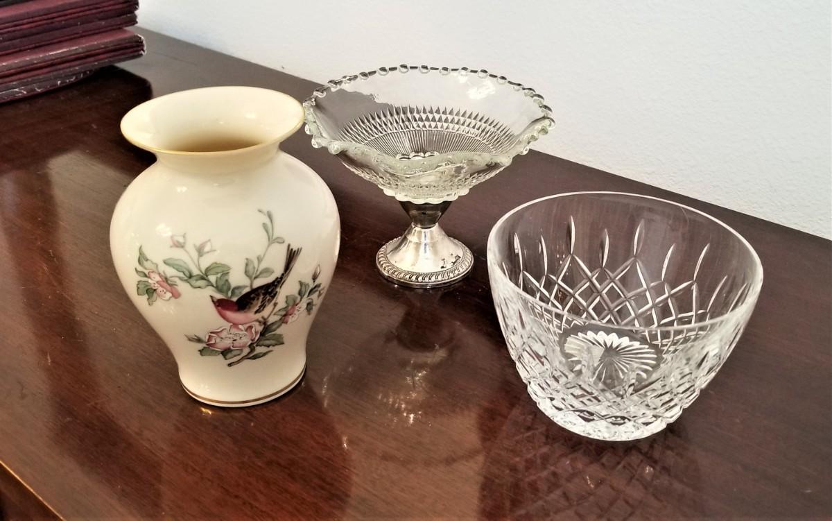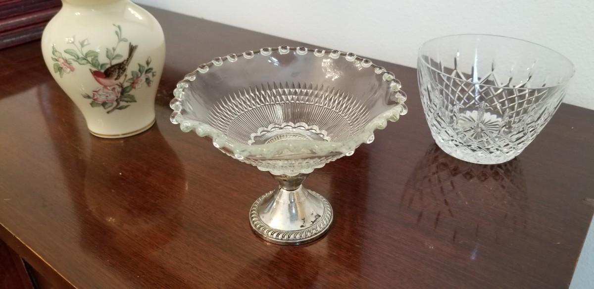 You get two pieces - glass compote with sterling silver base, and Lenox crystal bowl. All in good condition. We removed the vase because we saw it was broken. SORRY - two pieces only