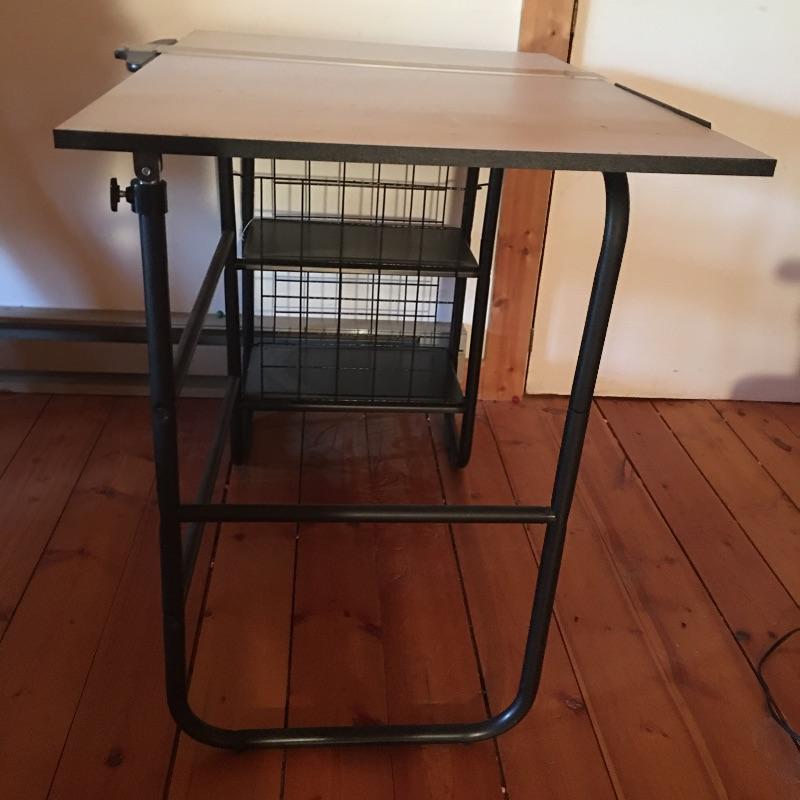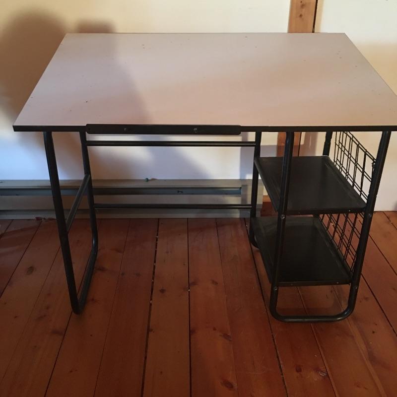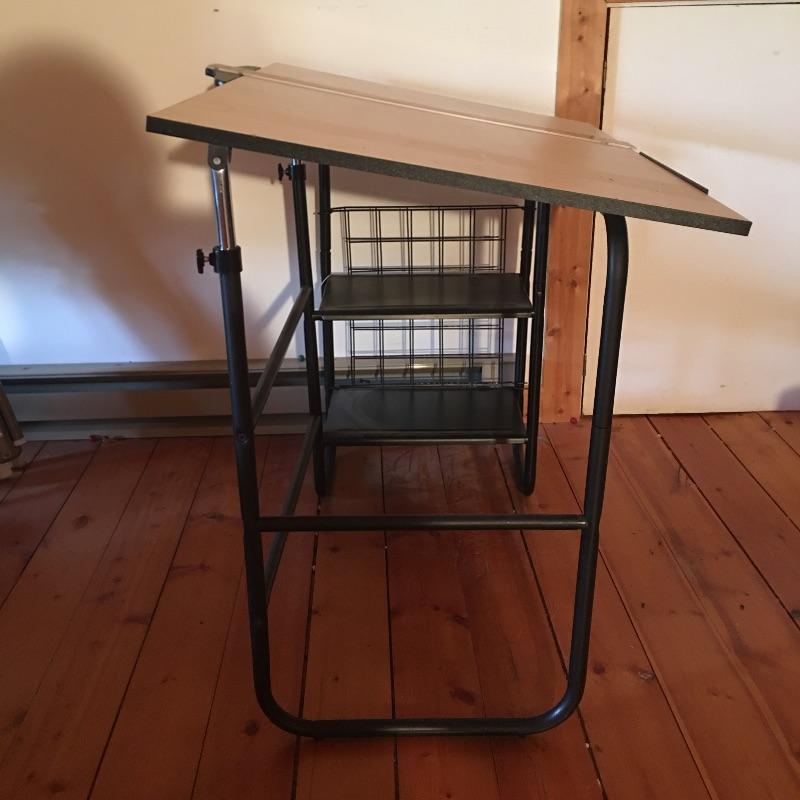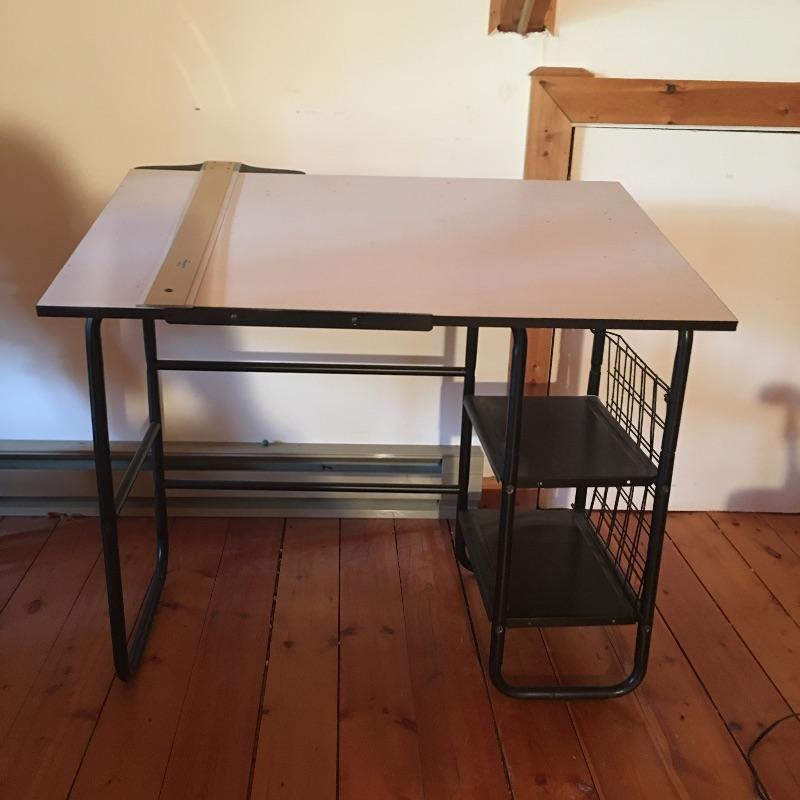 Included in this lot is an adjustable drafting table with two shelves on right side, lamp and a slide rule. A great drafting table for the home office or the student in your home.