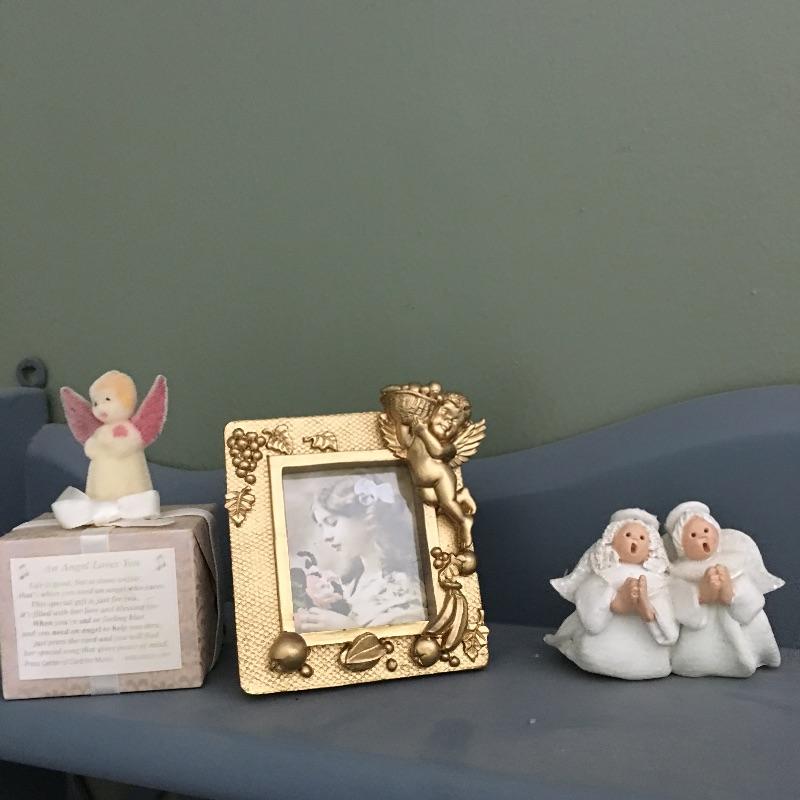 Lot includes a flock of angels in a variety of sizes, materials and styles. Cute and elegant, all watching out for you. Lot also features a gold colored frame and angelic box. The painted wood shelf measures 6” x 21.25” x 21.25” and has a nice lattice style back.