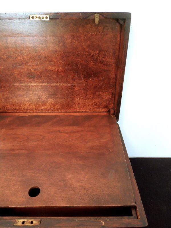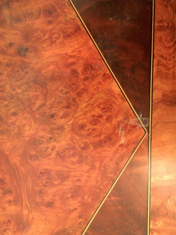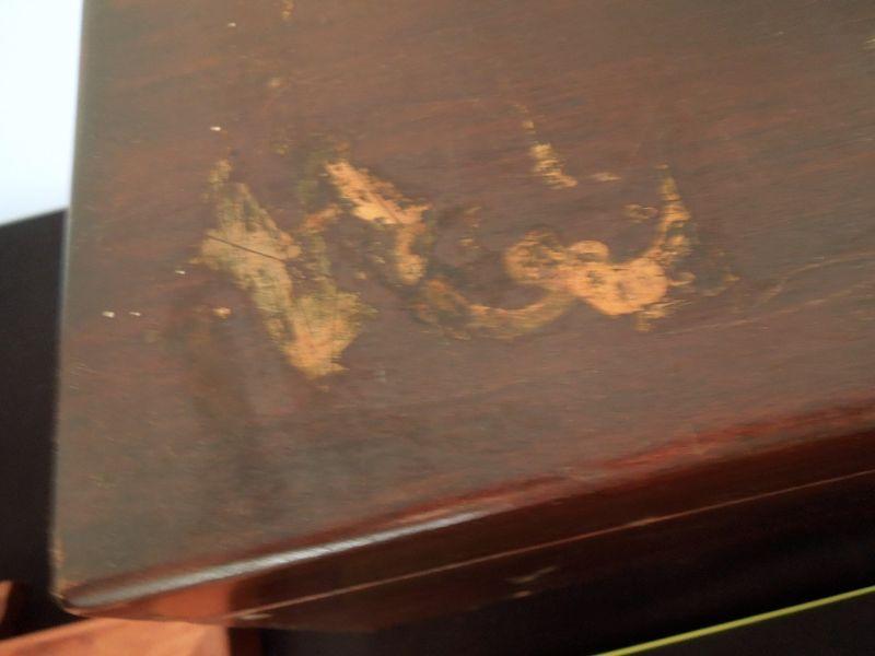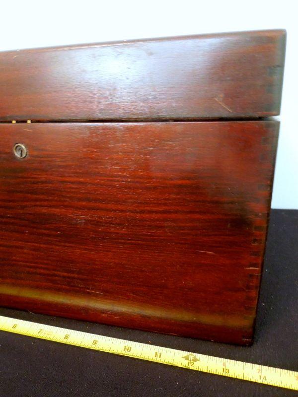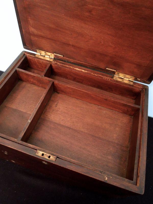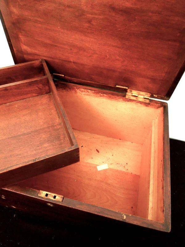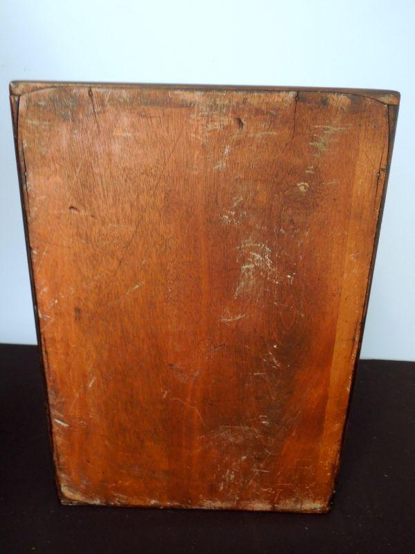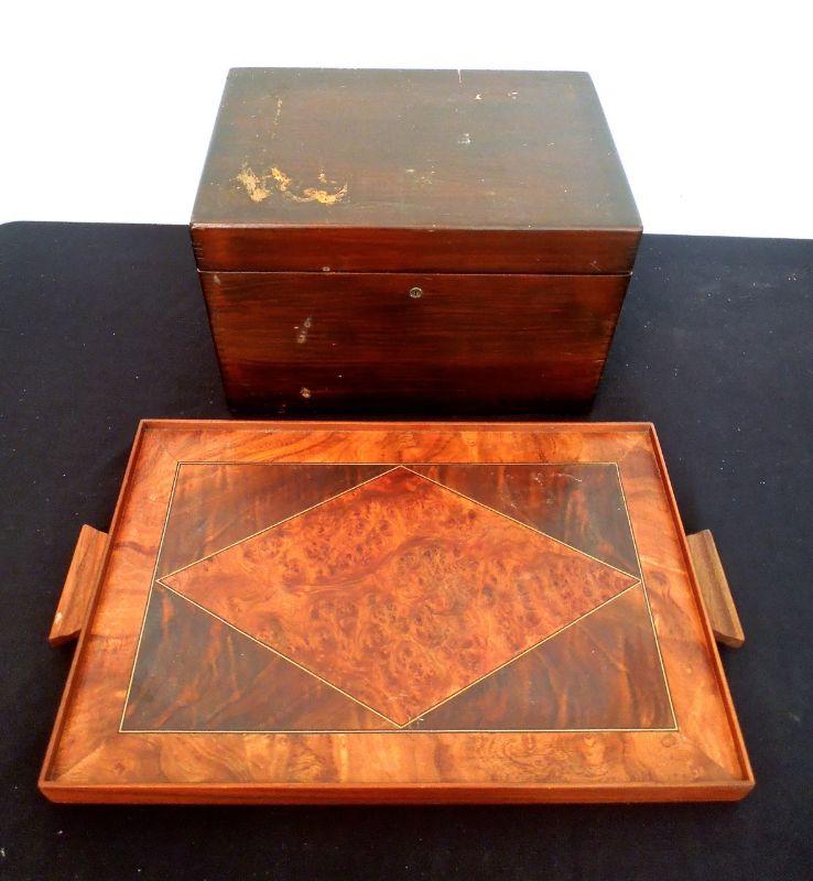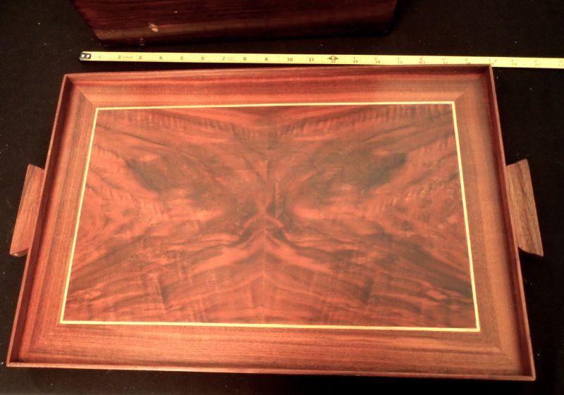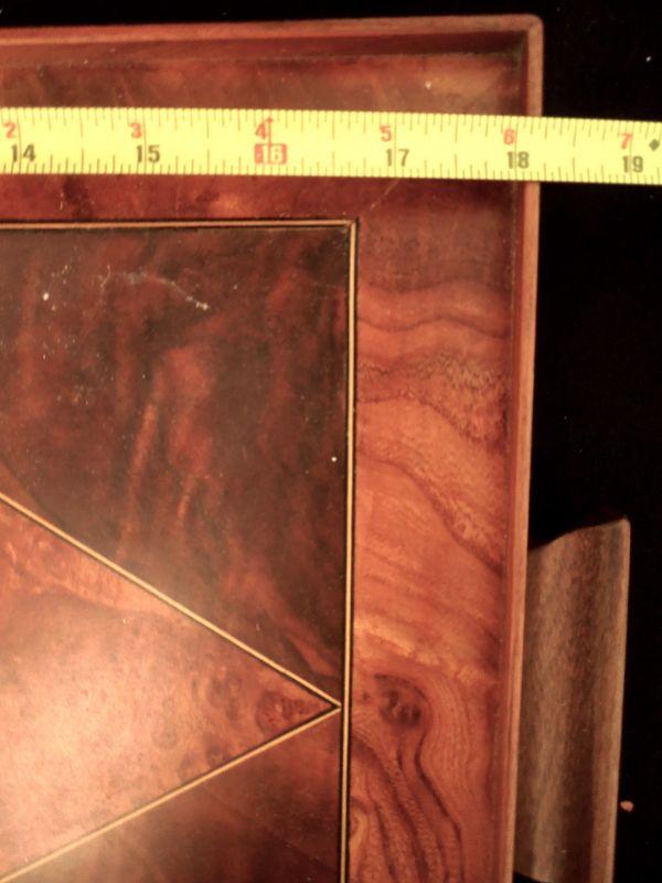 Very old wood box. No key. Shelf inset. An inlaid double sided handled serving tray featruing cherry and burl wood. See photos for dimensions and condition.