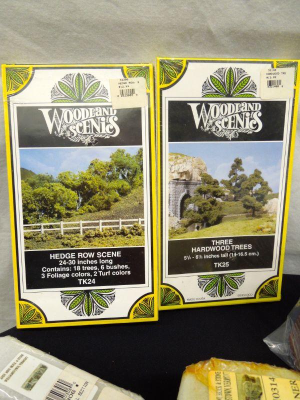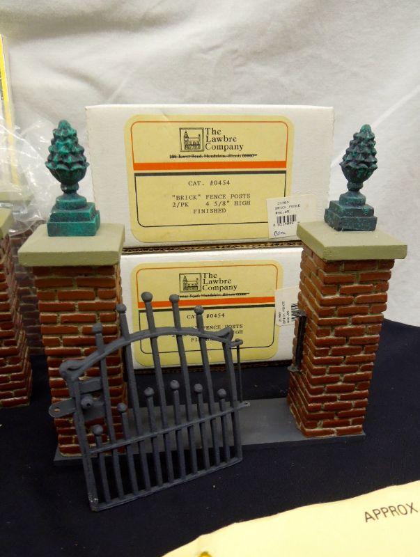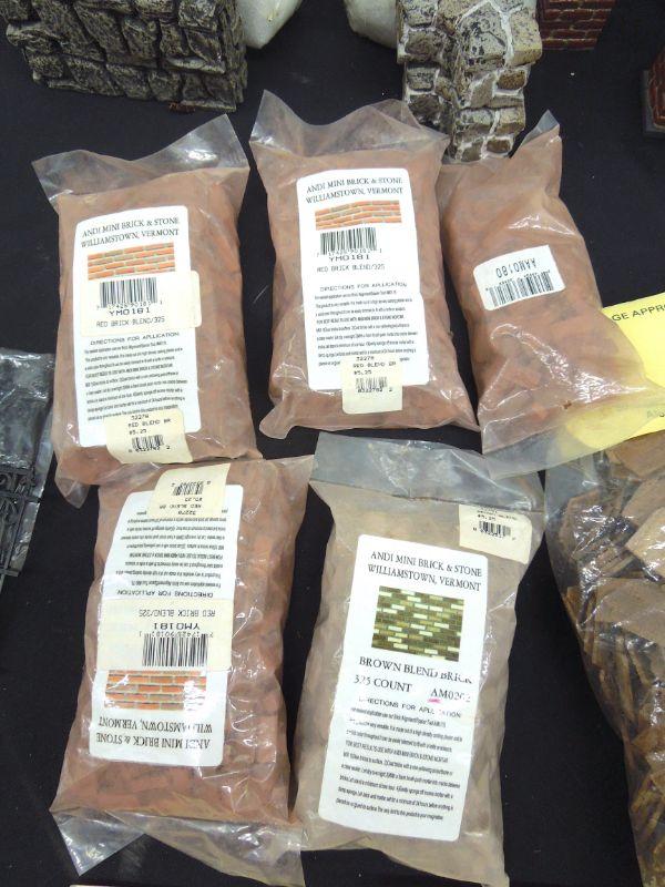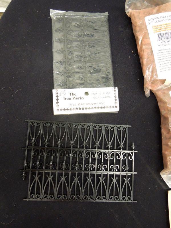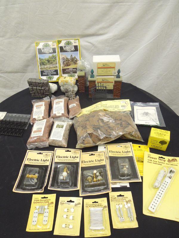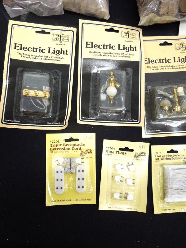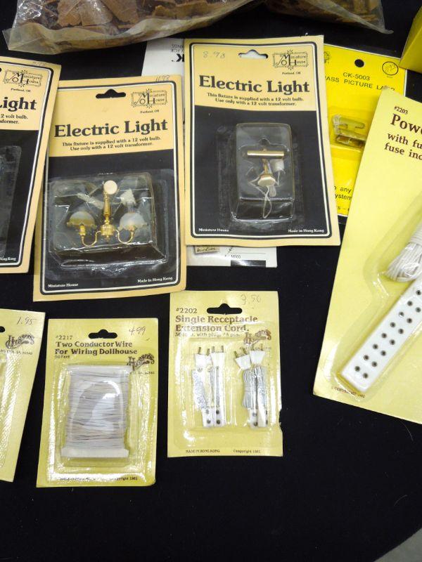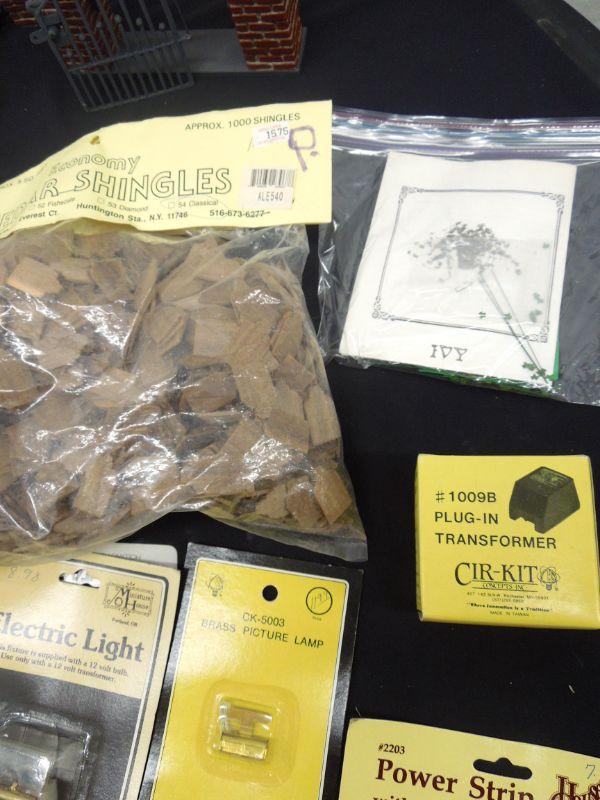 Many packaged items from "Houseworks and Miniature House" brands for accesorizing a minature dollhouse including cedar shingles, brickwork, stone fence, picket fence, electric lighting fixtures, gate, and more.