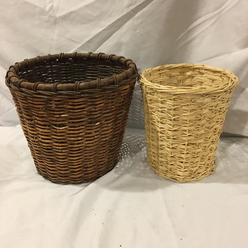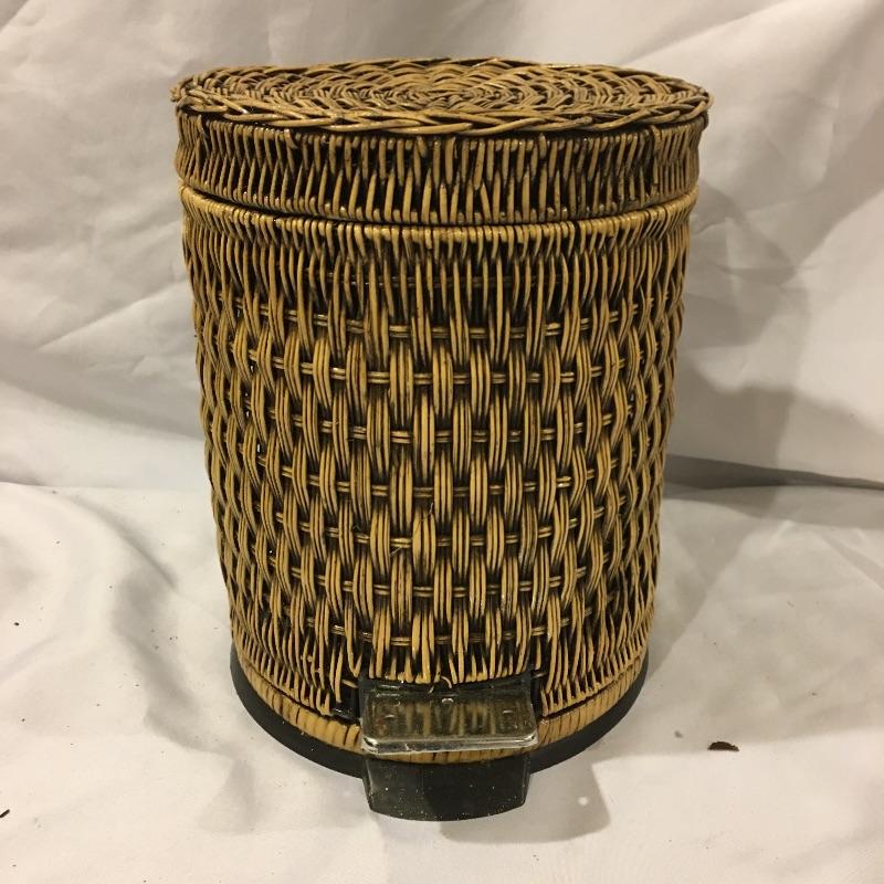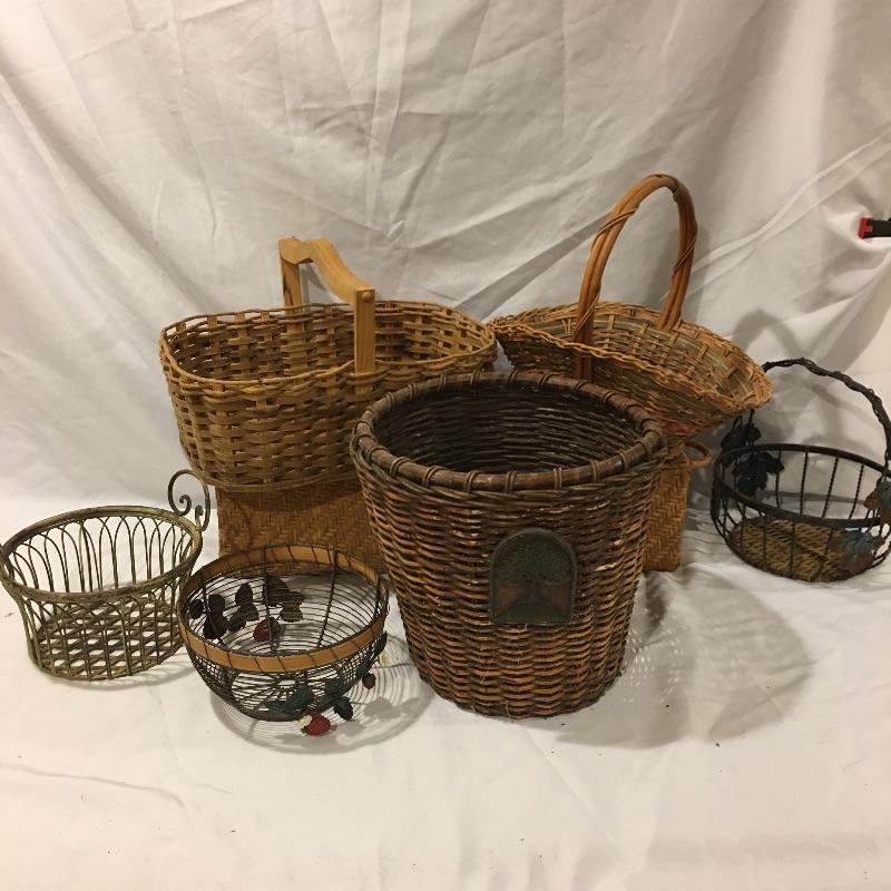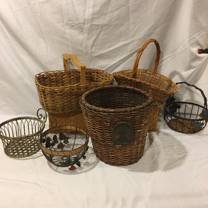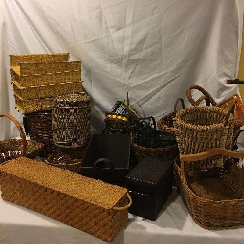 This is a great array of baskets in a variety of sizes, styles, shapes and materials. Lot includes trash can , metal baskets, wicker box with lid, basket with beads, canvas basket, metal and wicker baskets and more. Largest rectangular lidded basket measures 29” x 6” x 6.5”.