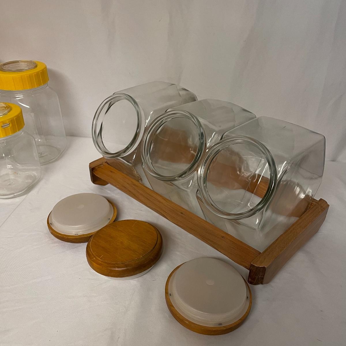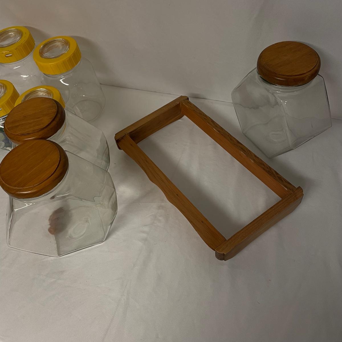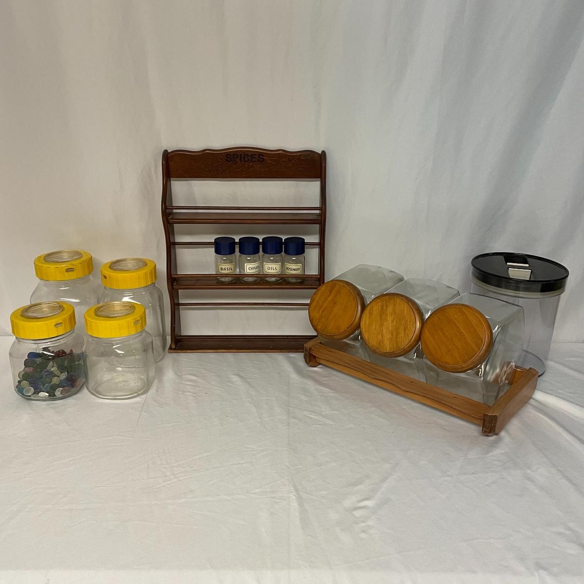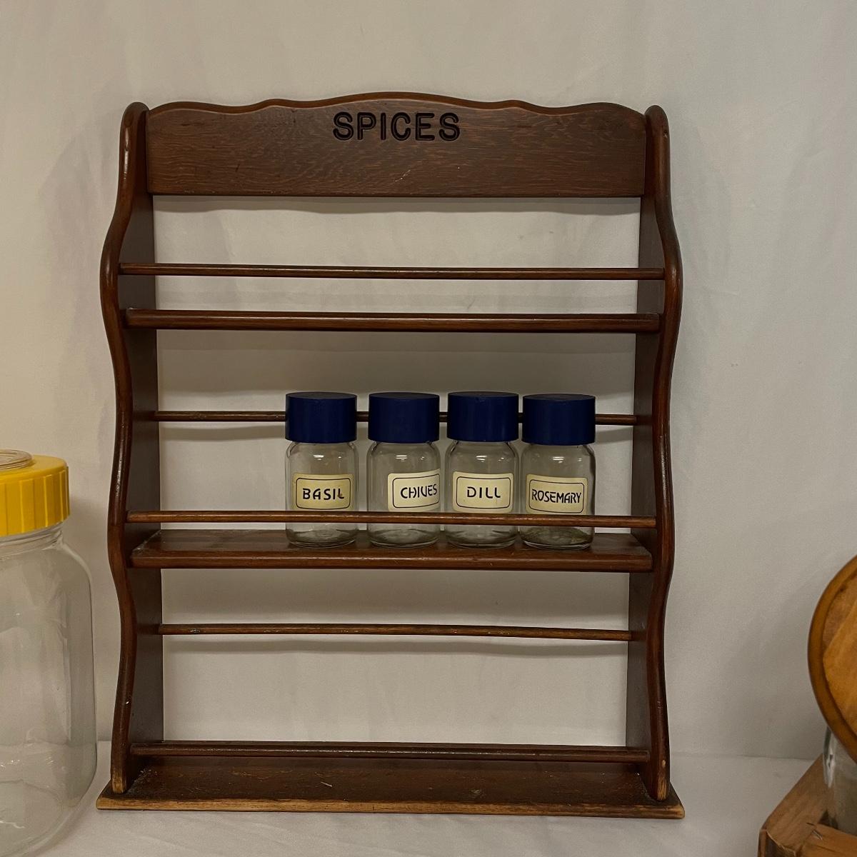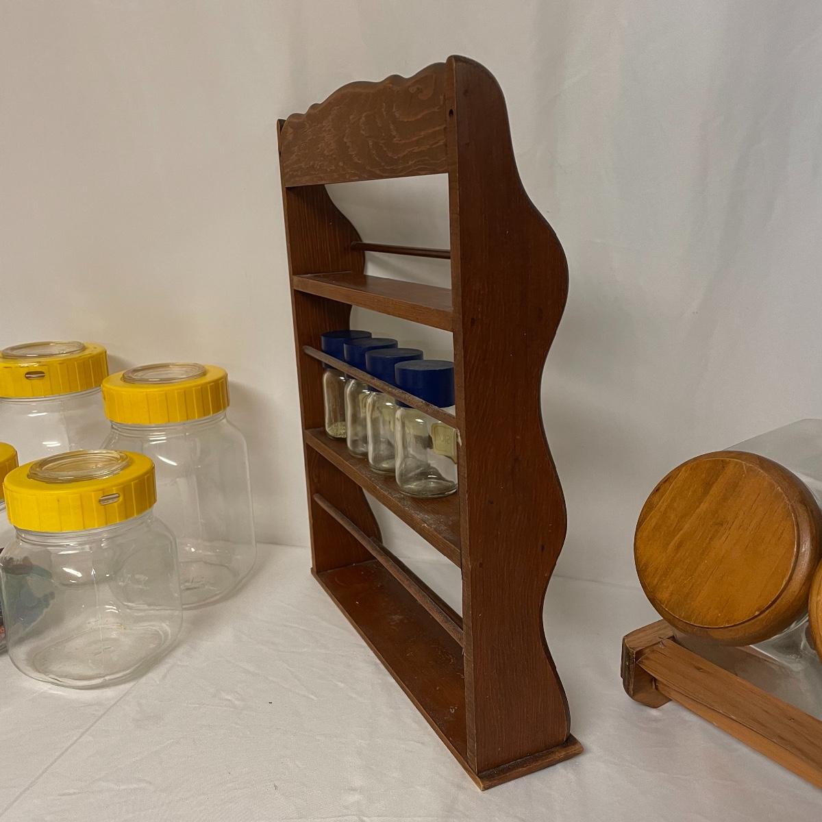Why pay more for new when you get the real vintage here! Lot includes a farmhouse style wooden wall spice rack with four pre-labeled glass spice jars. Piece measures 12.5” x 3” x 16”. The jars have a blue lid that is plastic, but looks like painted wood. Lot also offers an old fashioned wooden rack with three leaning 8” tall glass hexagon canisters. Collection also offers an air tight plastic canister to keep your food fresh and a set of four Italian glass canisters with yellow plastic and glass lids, these are labeled from largest to small 2, 1 1/2, and the smaller two are labeled 1. One of the small ones has some lovely glass beads. See images. Local pick up only.