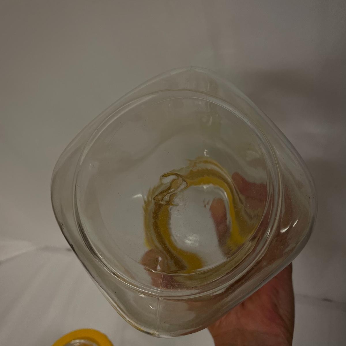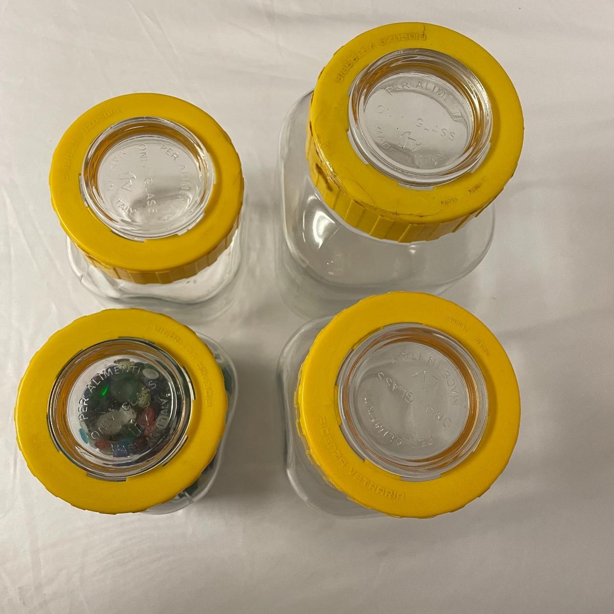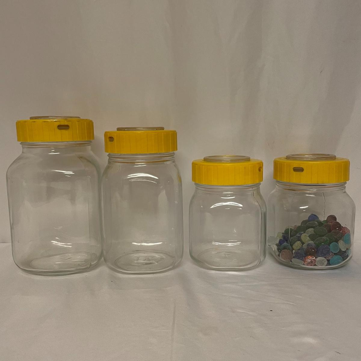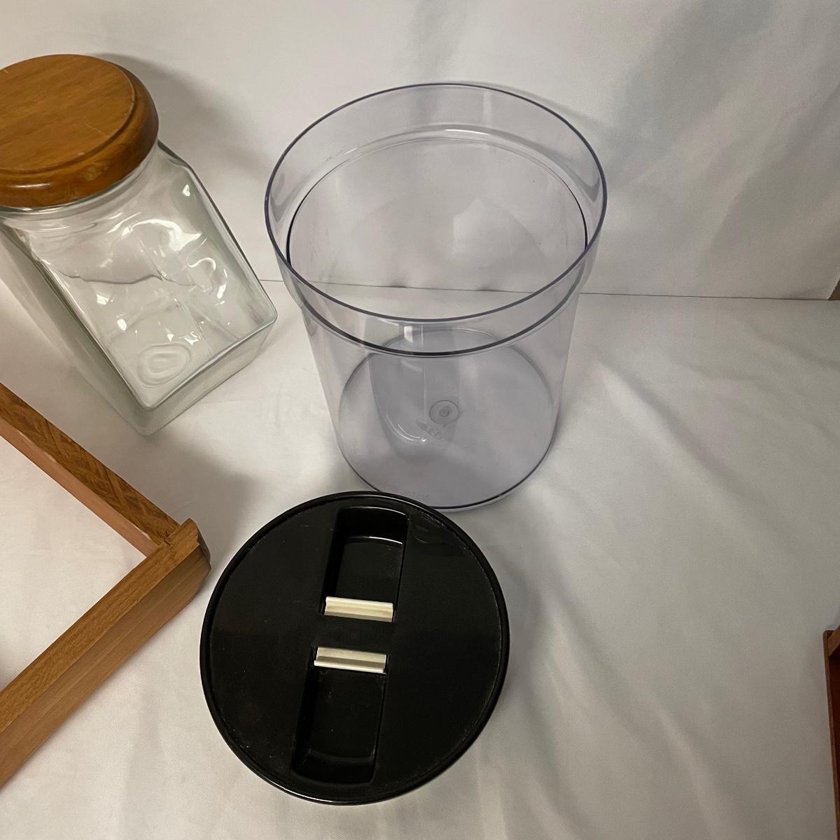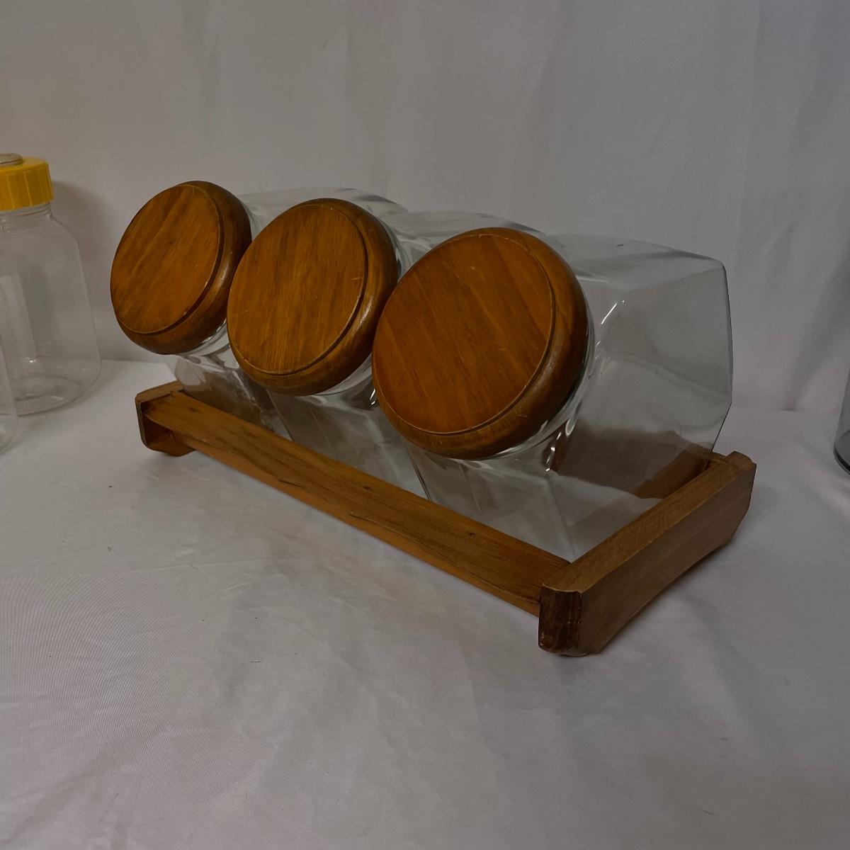 Why pay more for new when you get the real vintage here! Lot includes a farmhouse style wooden wall spice rack with four pre-labeled glass spice jars. Piece measures 12.5” x 3” x 16”. The jars have a blue lid that is plastic, but looks like painted wood. Lot also offers an old fashioned wooden rack with three leaning 8” tall glass hexagon canisters. Collection also offers an air tight plastic canister to keep your food fresh and a set of four Italian glass canisters with yellow plastic and glass lids, these are labeled from largest to small 2, 1 1/2, and the smaller two are labeled 1. One of the small ones has some lovely glass beads. See images. Local pick up only.
