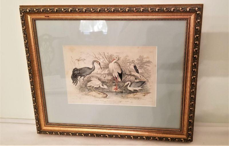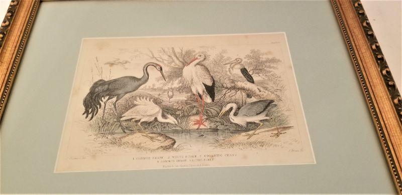 Another nice antique engraving - 5 birds - Common Crane, White Stork, Gigantic Crane, Common Heron, etc - Printed by Blackie & Son (Glasgow, Edinburgh, London) - 19th century. Professionally framed with conservation glass. Measures 15.5" x 13".