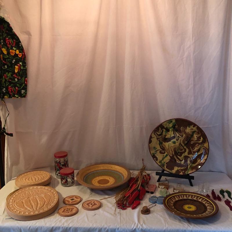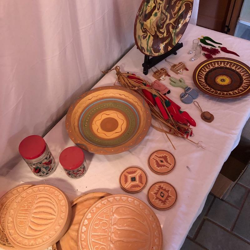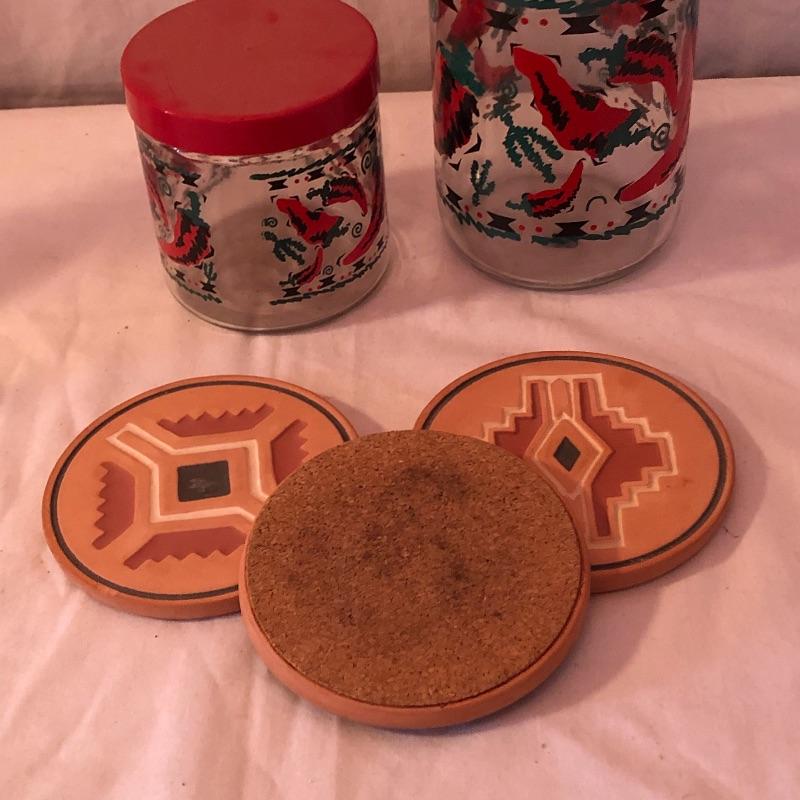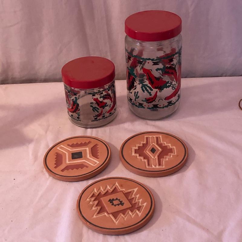 This lot includes a lot of fun decor! It includes seven decorative plates, a chili pepper apron, three southwestern coasters, two chili pepper jars, a Bob Timberlake throw and many decorative items. Shipping Available.