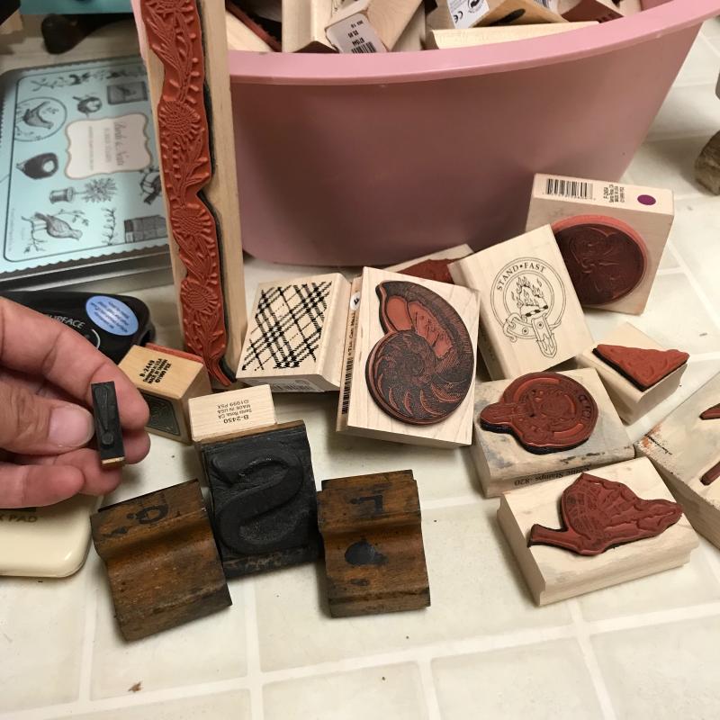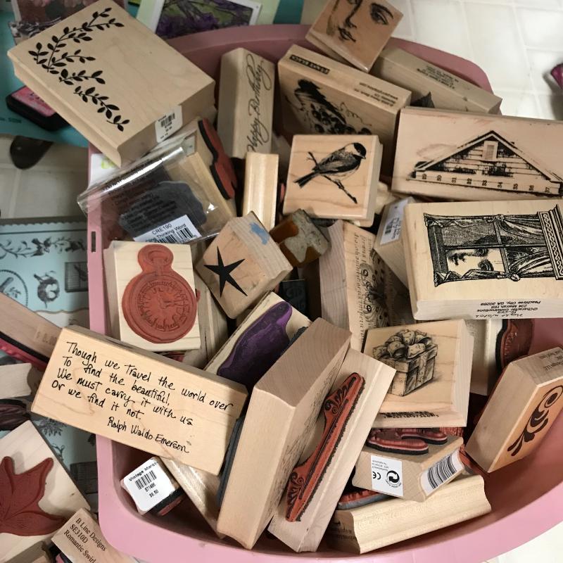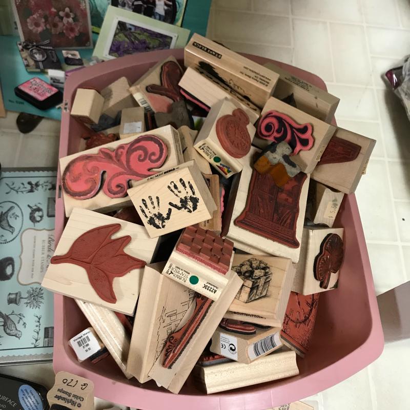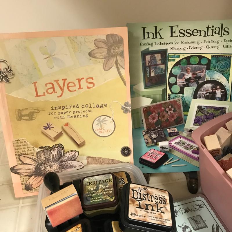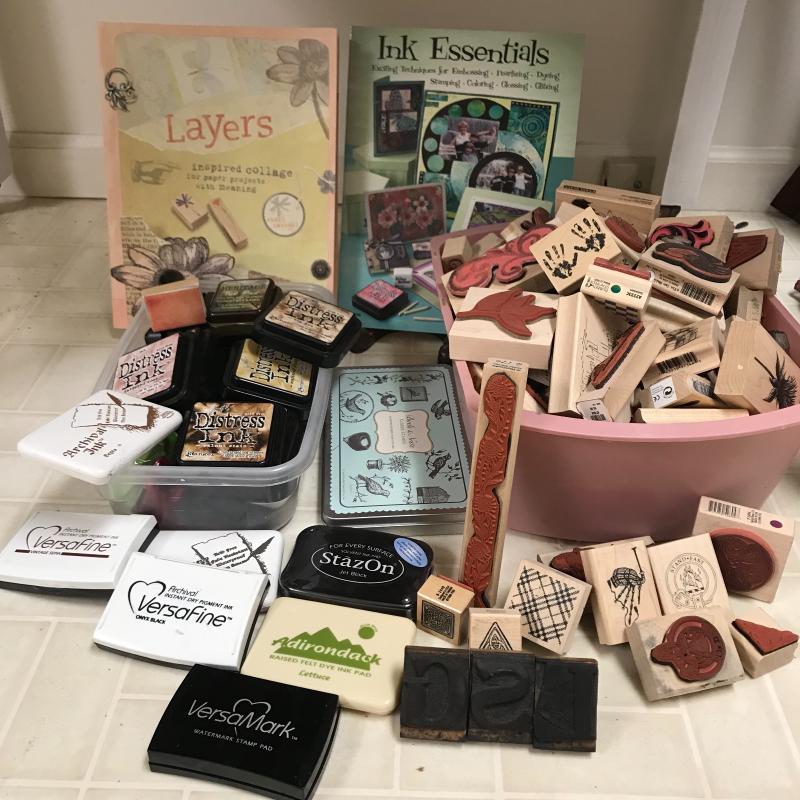 Large eclectic stamp collection with two technique books, distress and Versafine ink pads (conditions unknown), three small paper cut-outs. Great to begin or add to your crafting collection! Local pick up only.