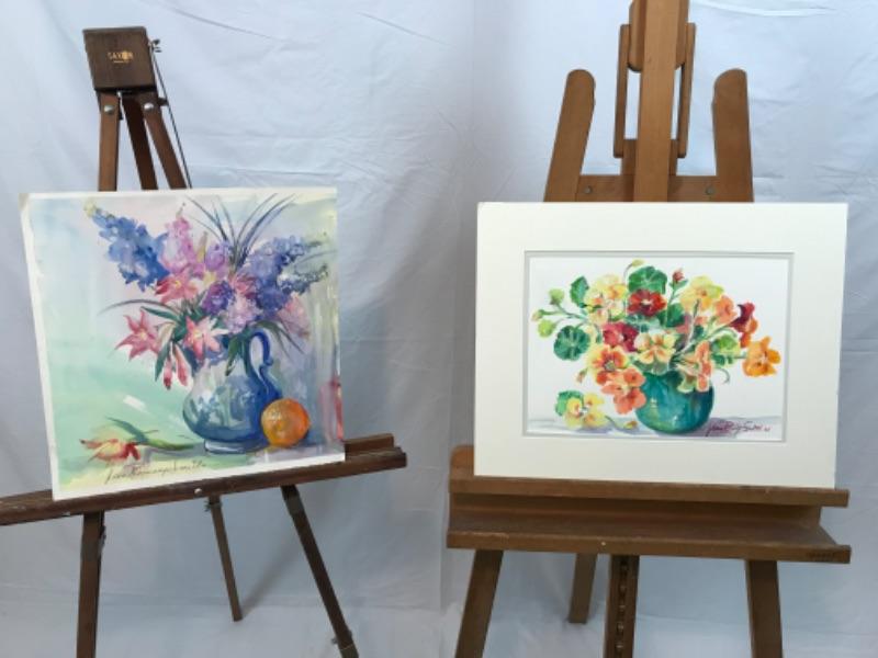 Pair of Jean Ranney Smith signed original watercolor paintings. “Green Vase” measures 20”x16” including mat and “Blue Vase” measures 15”x15”