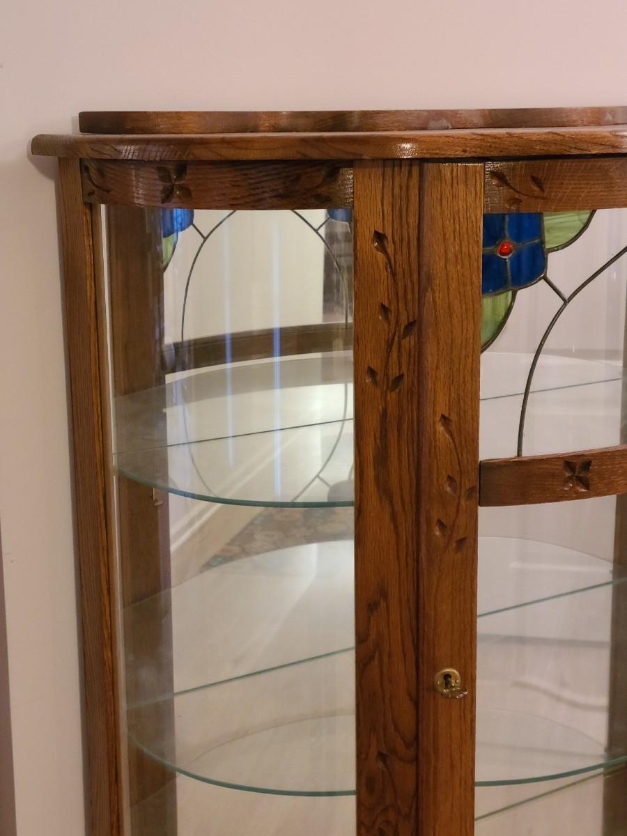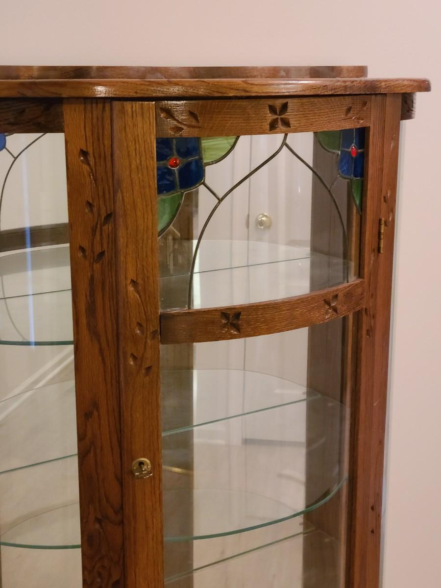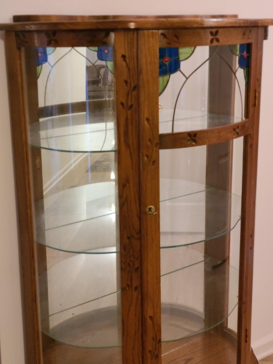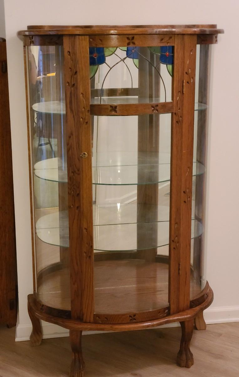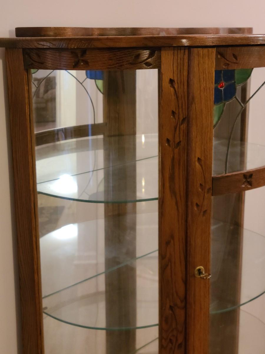 Lot 207: Bow Front Oak Lighted Curio Cabinet w/Stained Glass & Key