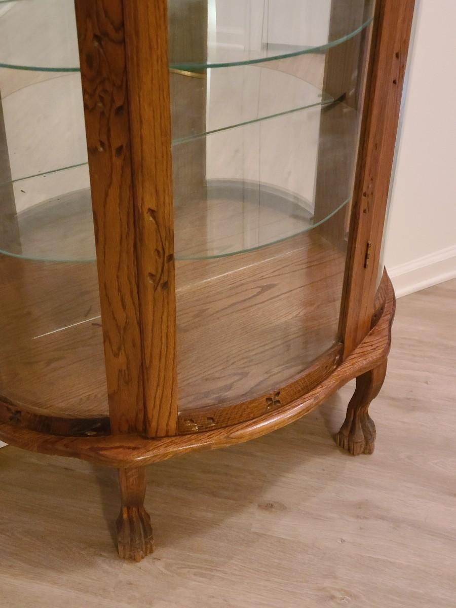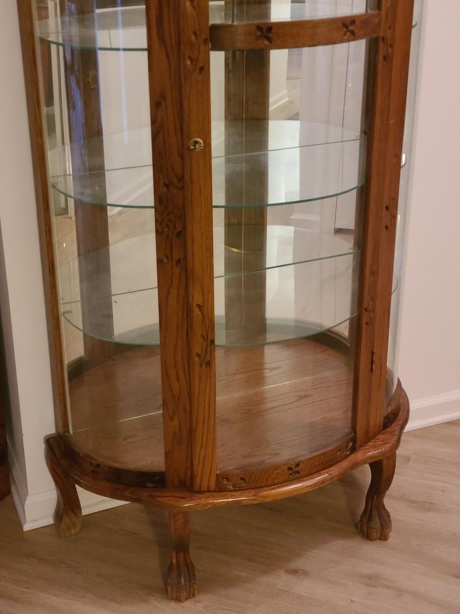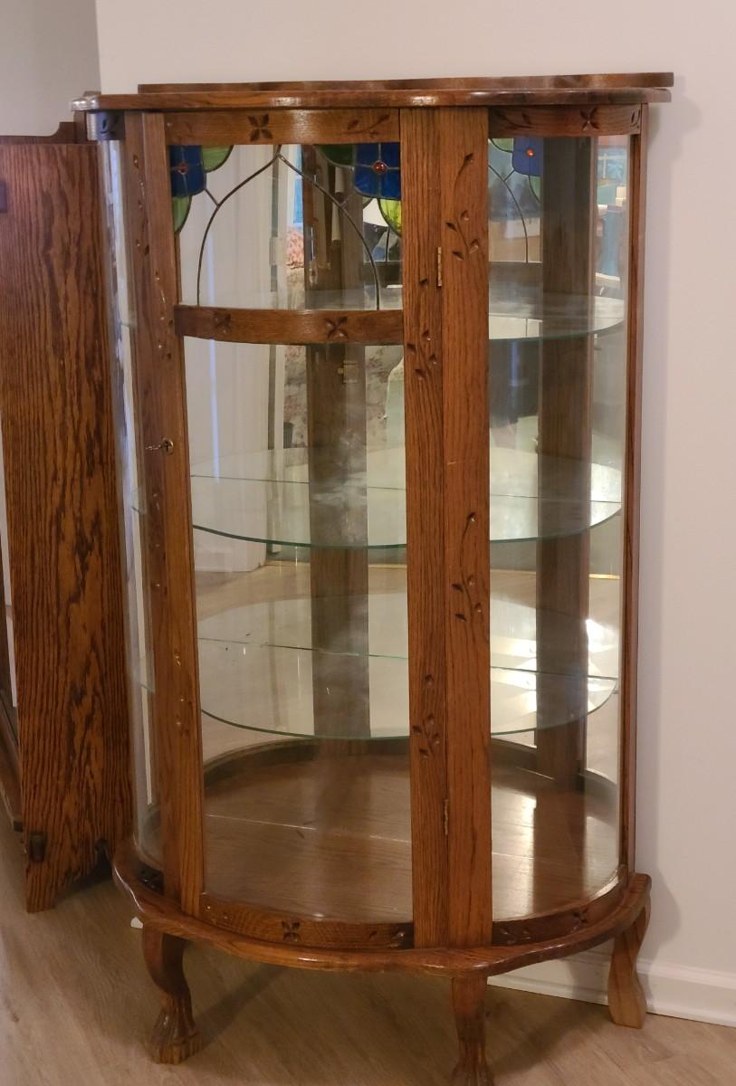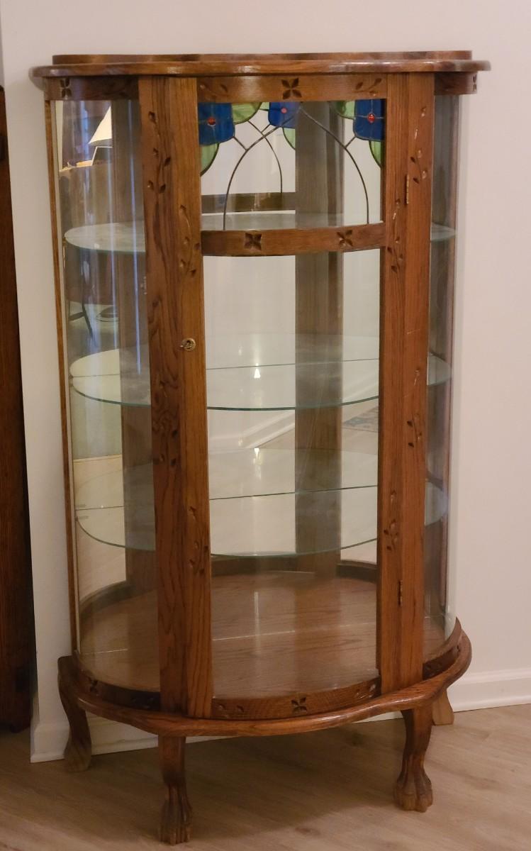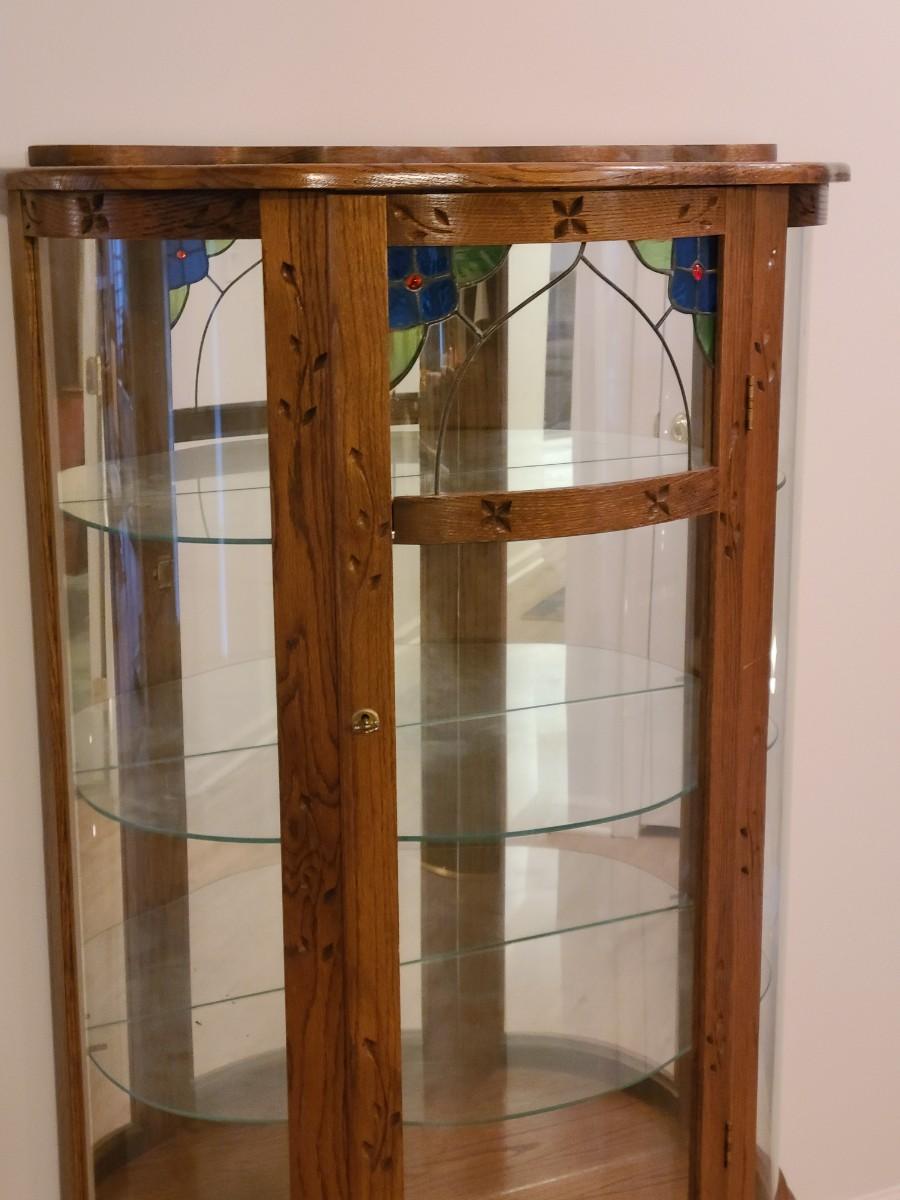 Lot 207: Bow Front Oak Lighted Curio Cabinet w/Stained Glass & Key