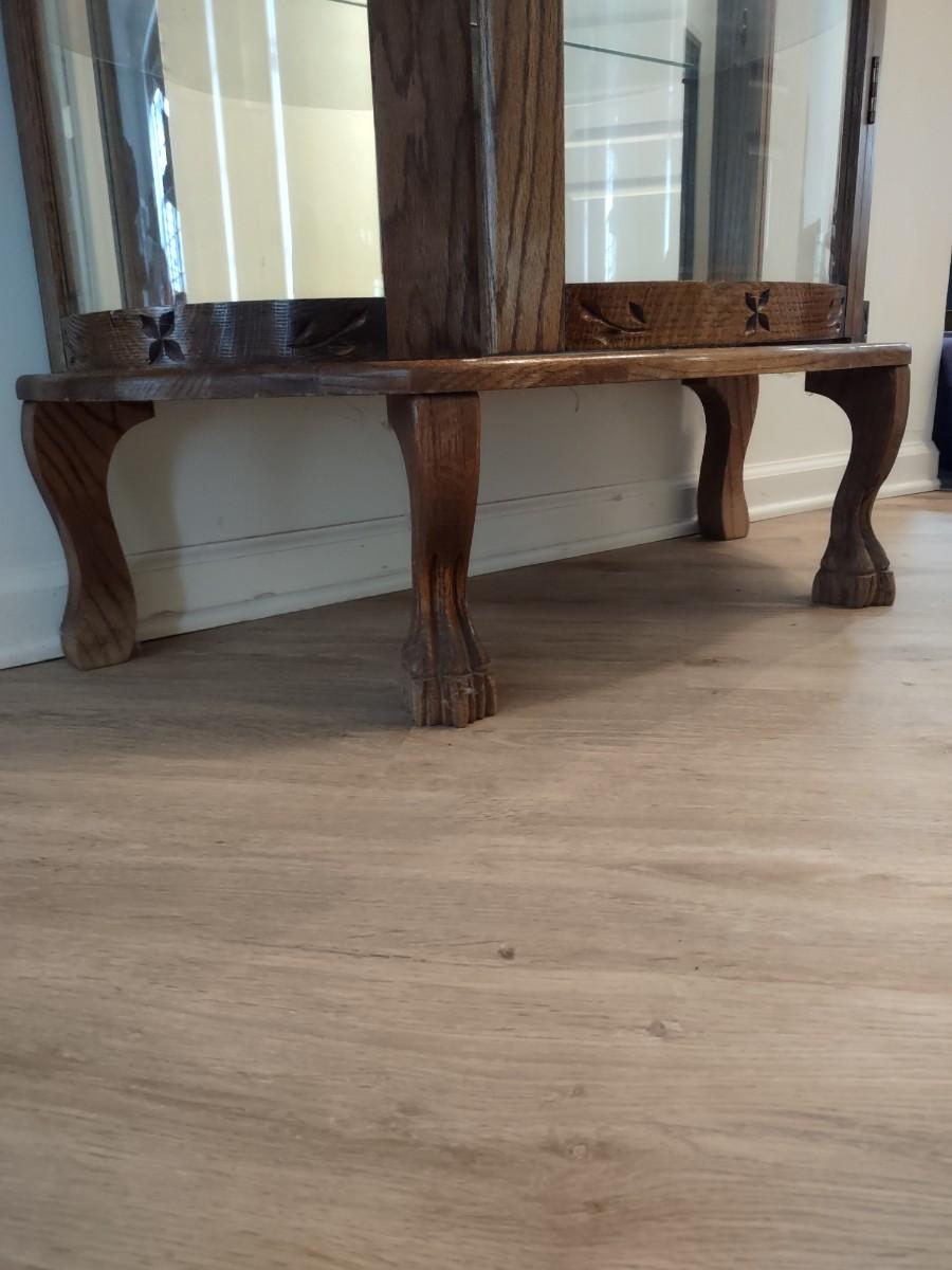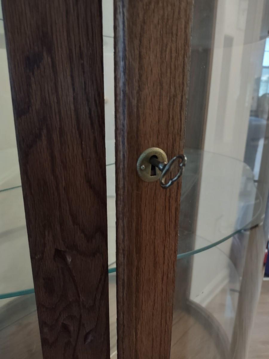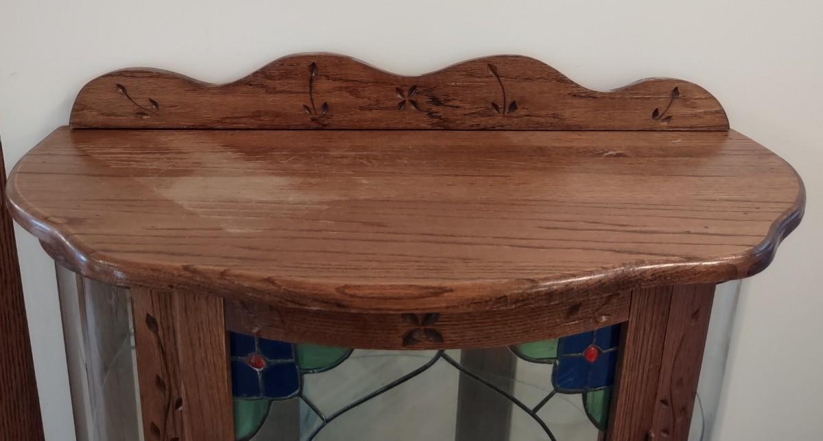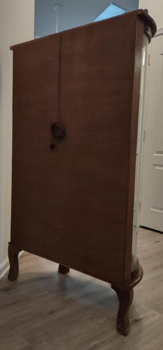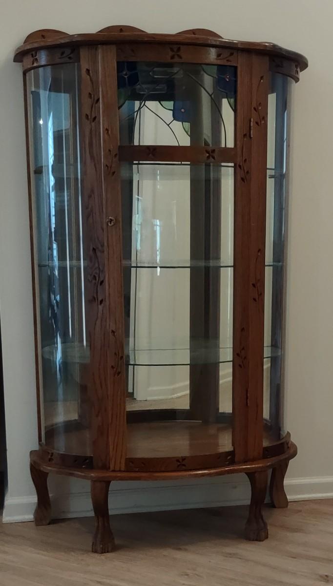 Lighted Curio Cabinet With Stained Glass & Key.. 35×17×58 Very Good Condition. The decorative back panel on the top, was removed but is included and is not attached. You can use with or without. Glass shelves, mirror backed. This is solid and makes a beautiful statement piece with the blue and green floral stained glass panels at the top center. Please see all pictures as they are the best representation of the items. The pictures show condition, measurements if taken, and what is included in the lot. Due to the large amount that we photograph and the time frame, we are not always able to take measurements. All items unless noted, are pre-owned and have been used. If you purchased furniture, you must bring help. We do not allow one person to carry large furniture out on their own. Bring help, tools and a truck for the safety of our client’s homes, and your personal safety. Company policy. Thank you.
