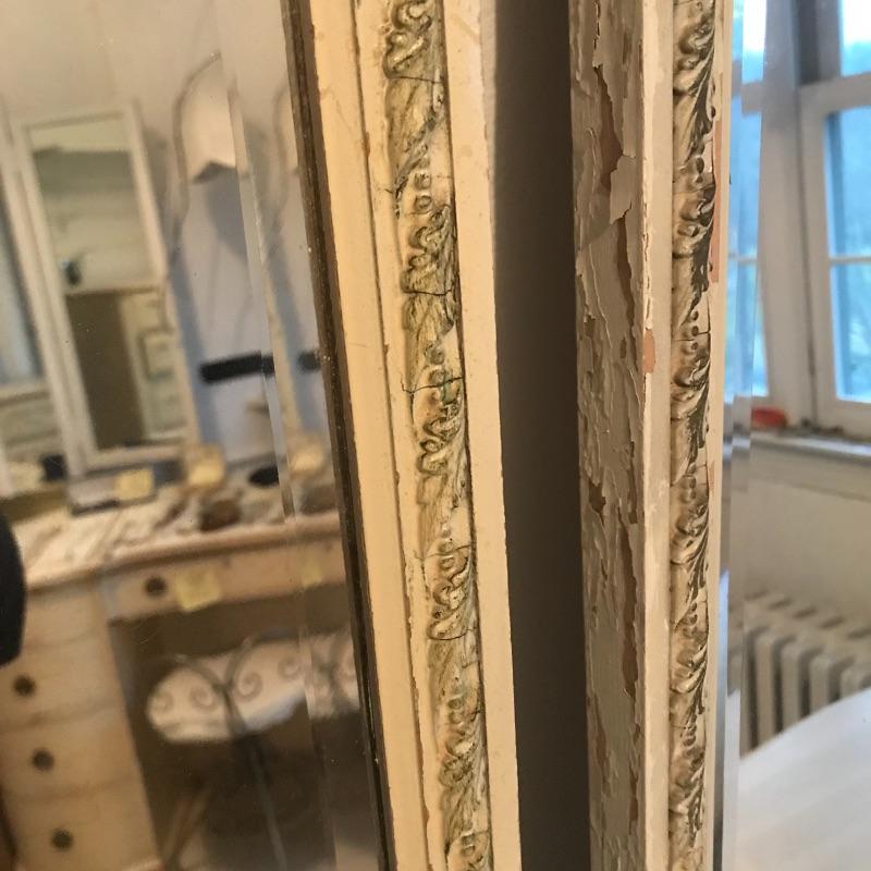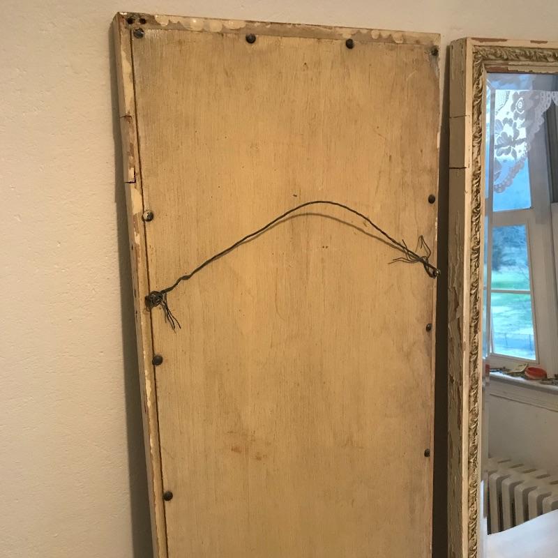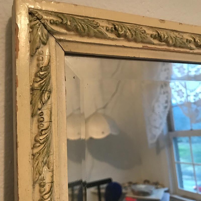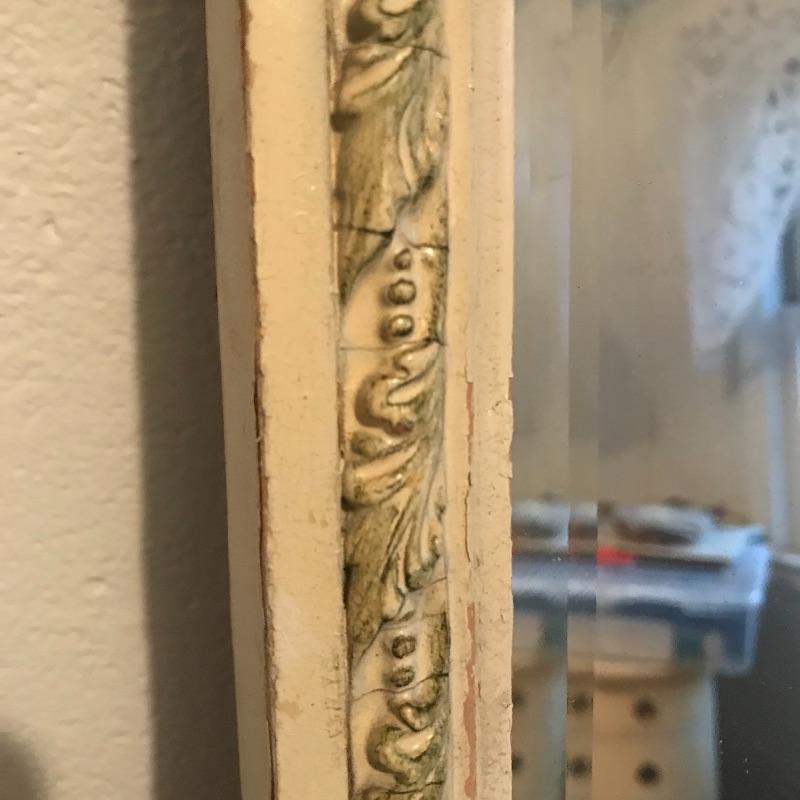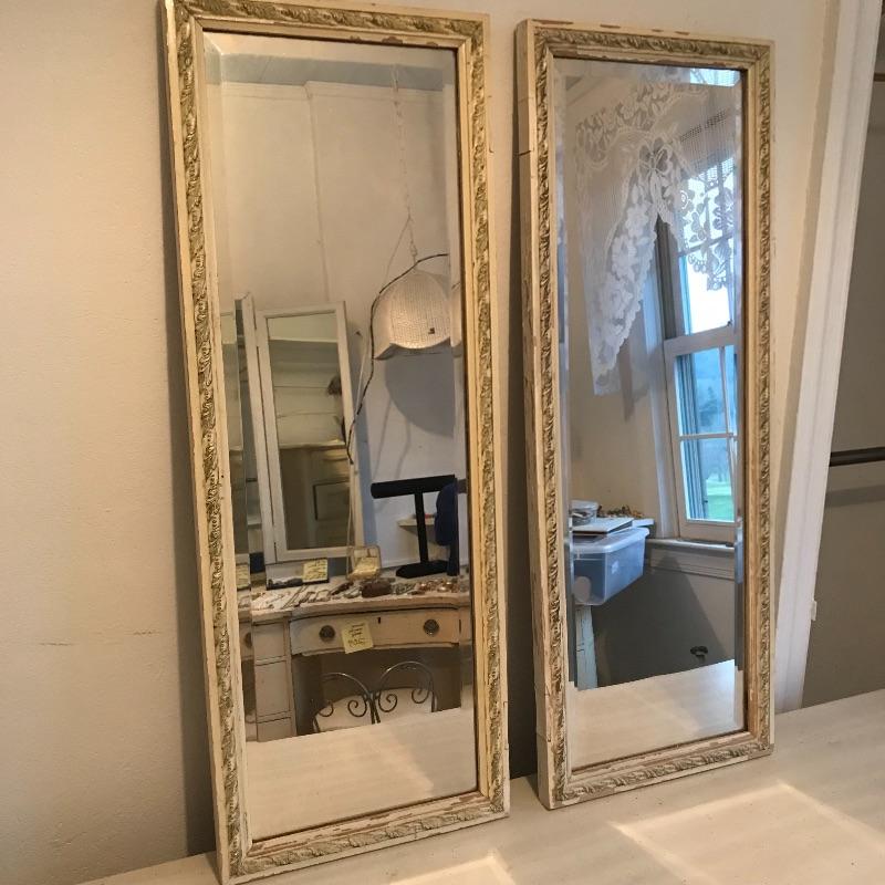 This matching pair of vintage beveled mirrors would be perfect for your bedroom or foyer, alike. Paint is chipped in a few places but this contributes to the overall distressed look. Pieces are solid. Approx. 32” x 12” each. Local pickup only.