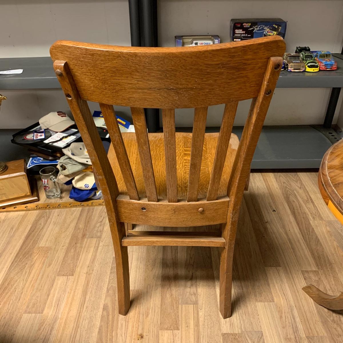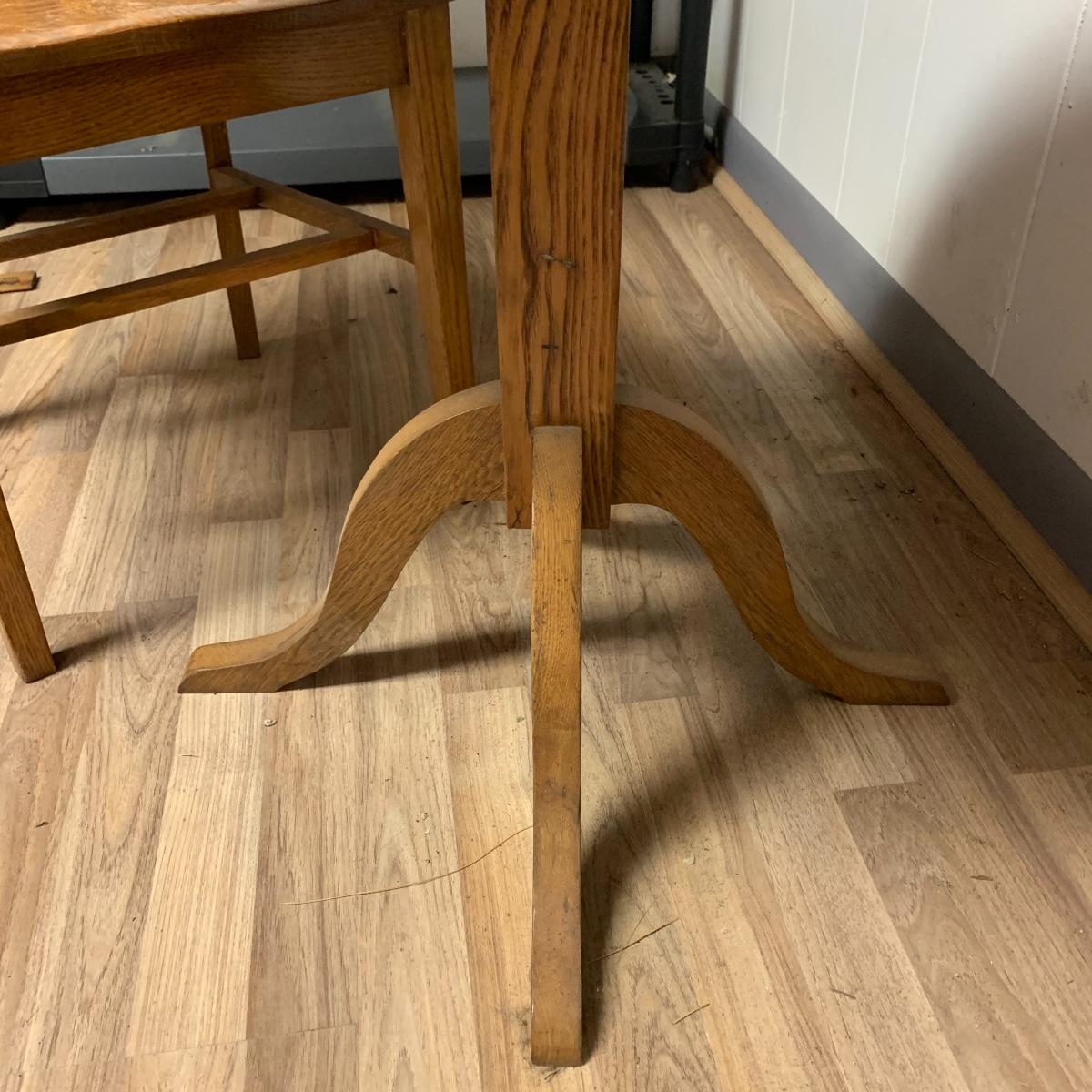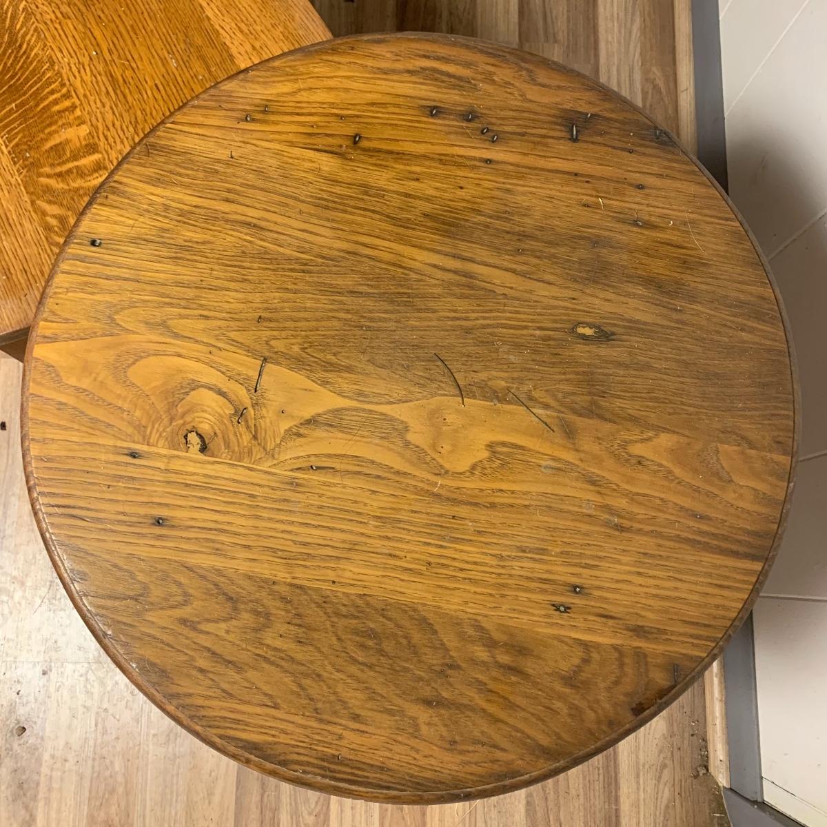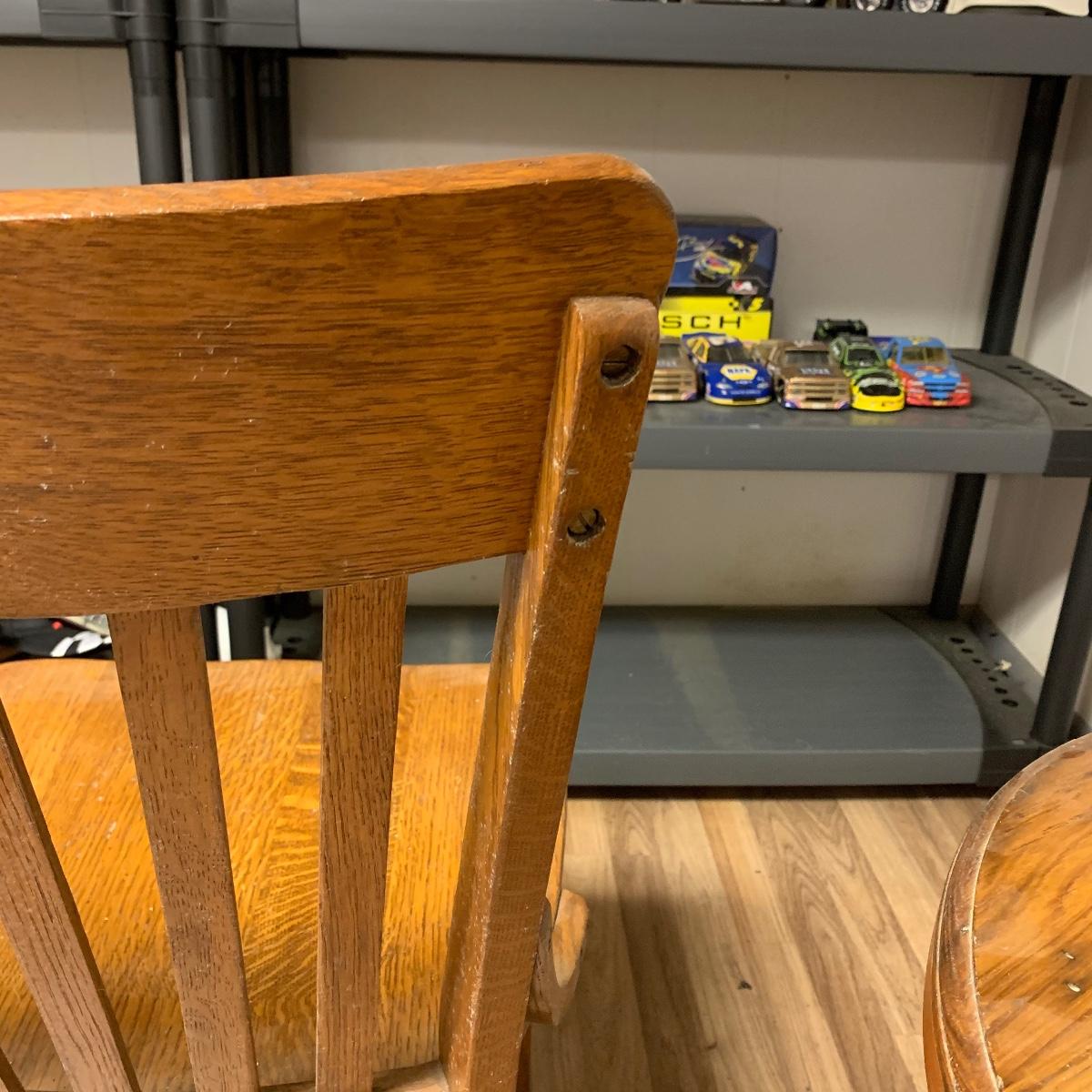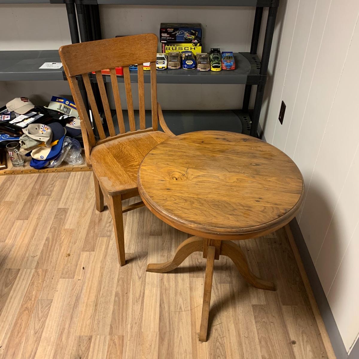 Check out this cute pair! The table is a 22” round table that stands on three legs and measures 23” tall. The chair is a sturdy classic straight back and measures 35” tall X 18” wide X 17” deep. The seat height is a 17.5 inches. Both are in good condition. Local pickup only.