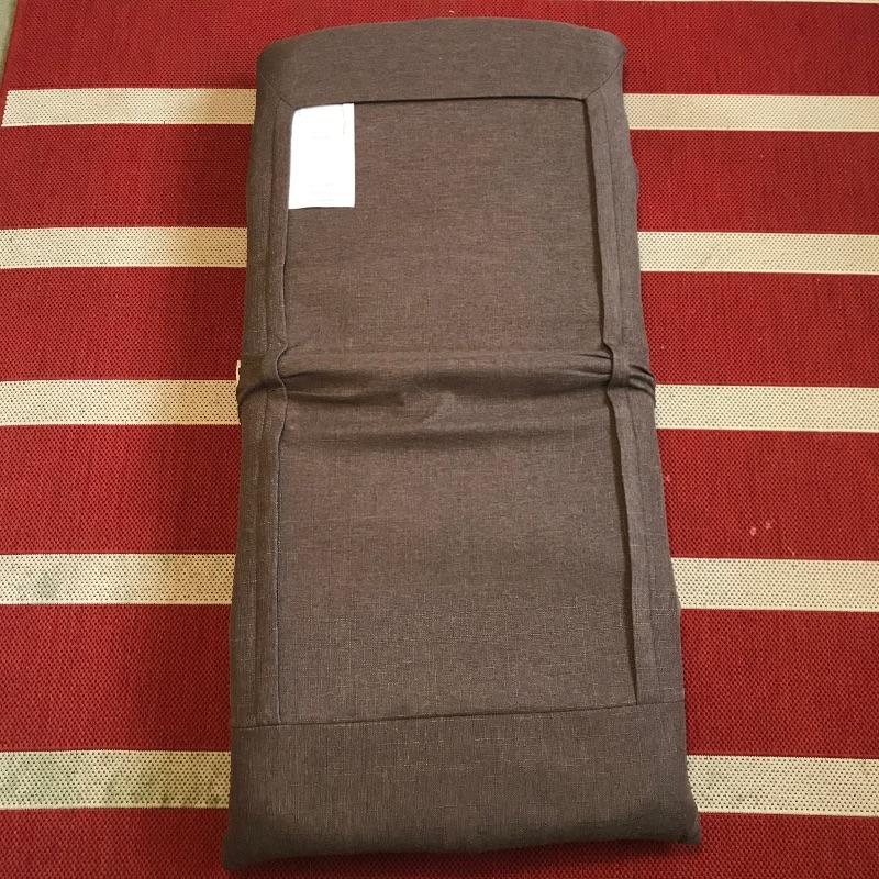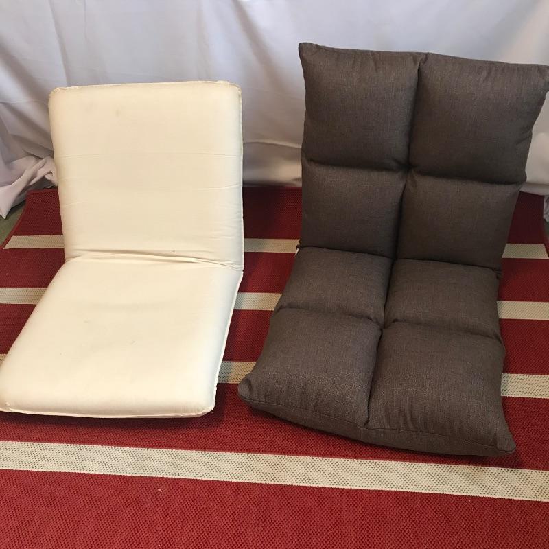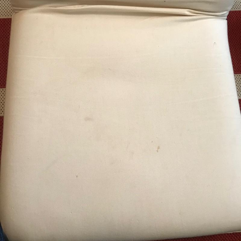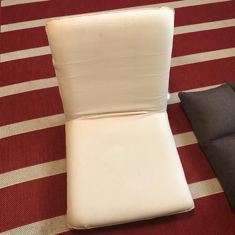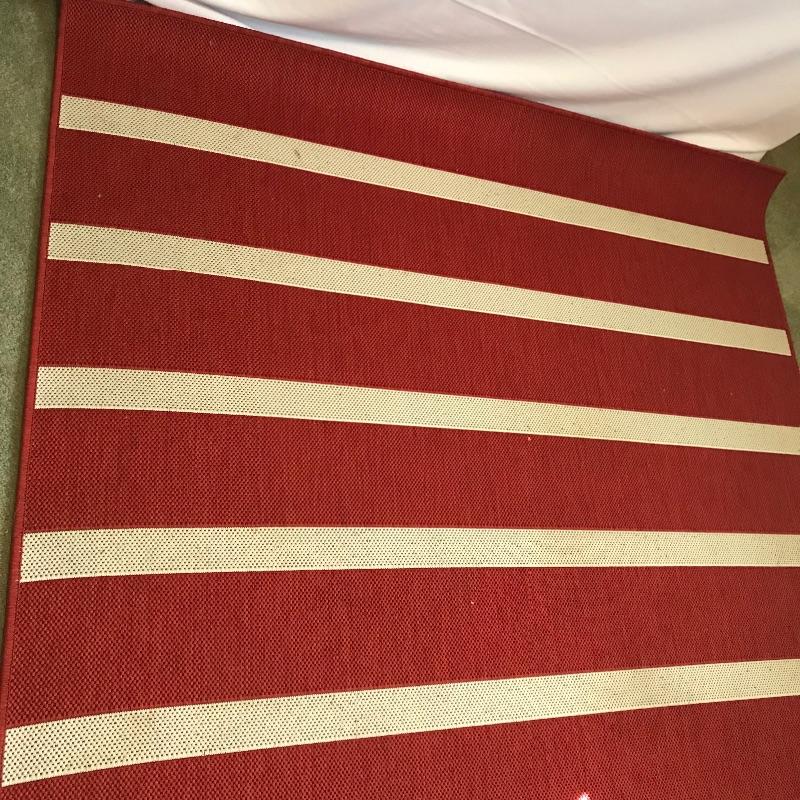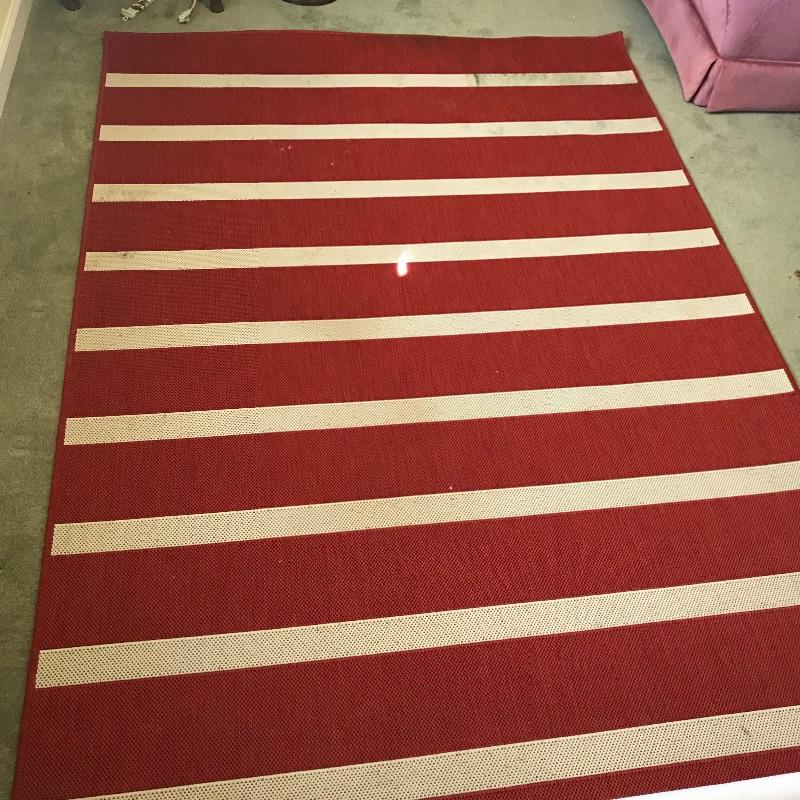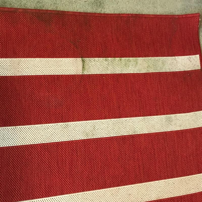 Nice sized two sided striped outdoor area rug. This rug has some areas needing to be cleaned, but is in great shape overall. There are small bright spots seen in pics, these are sunshine. Rug measures approximately 61” x 90”. We’ve paired up two loungers that have adjustable degrees of reclining. The ivory one has some stains, but good news- the tag states it’s machine washable! Five ivory and floral printed outdoor pillows are included with the loungers and rug. See photos. No shipping.