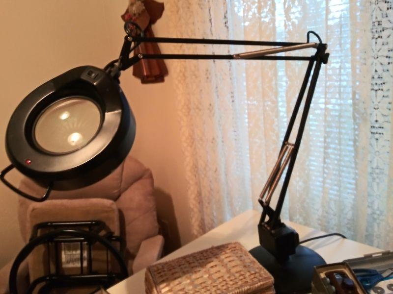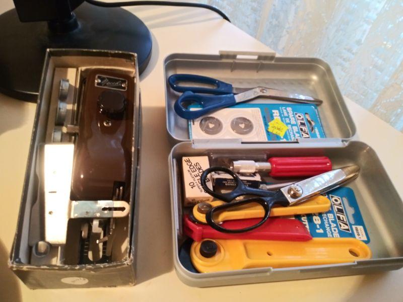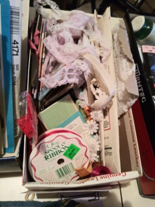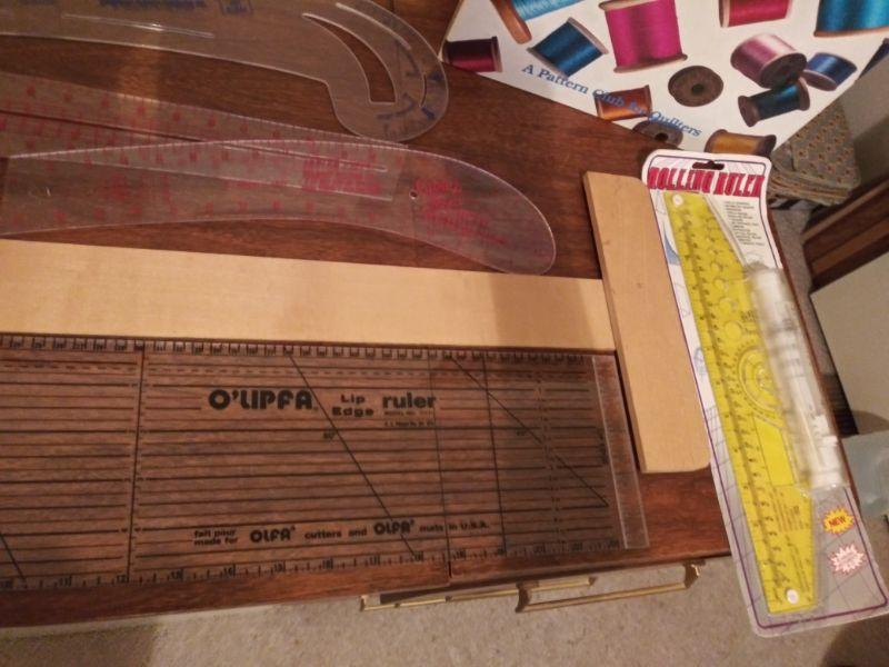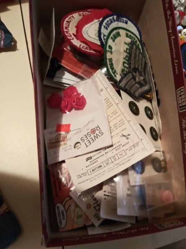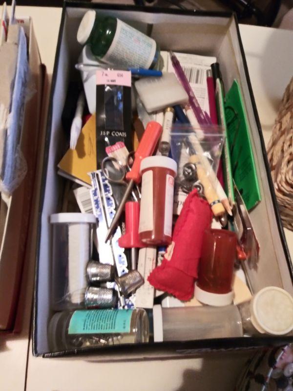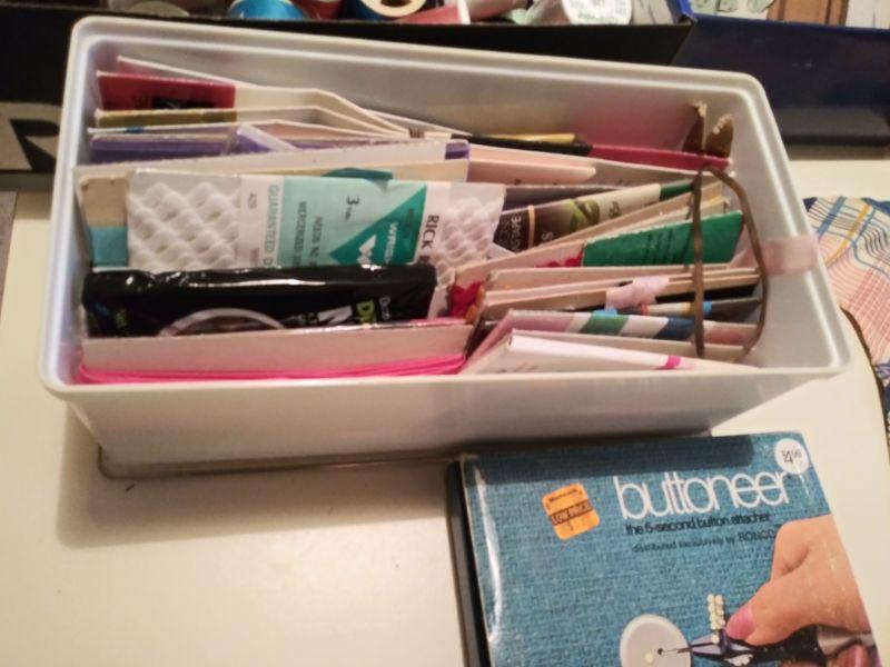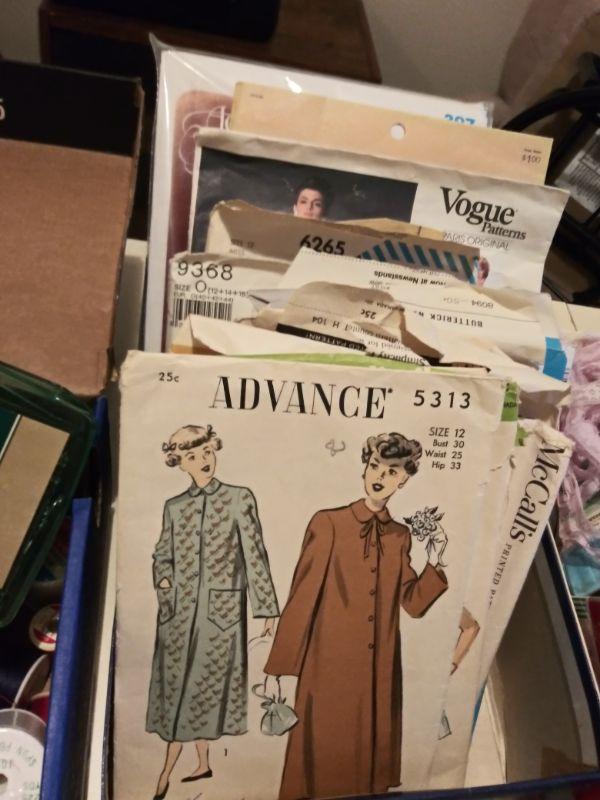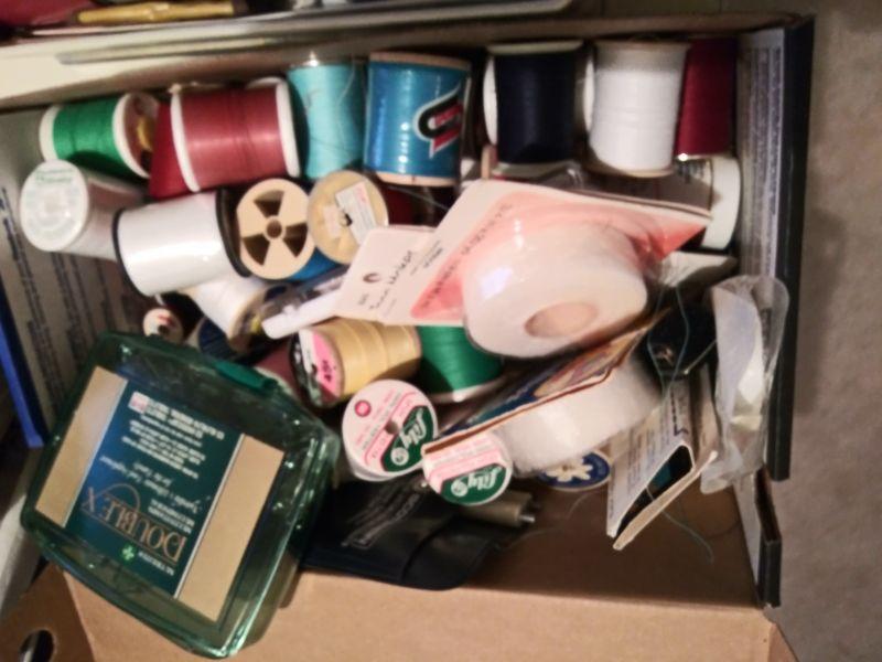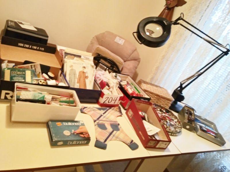 HUGE LOT OF SEWING NOTIONS, MATERIAL, MAGNIFIED LIGHT, PATTERNS AND MUCH MORE