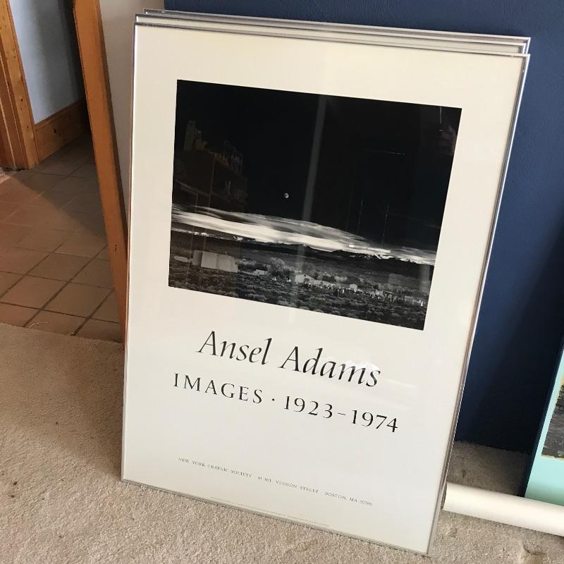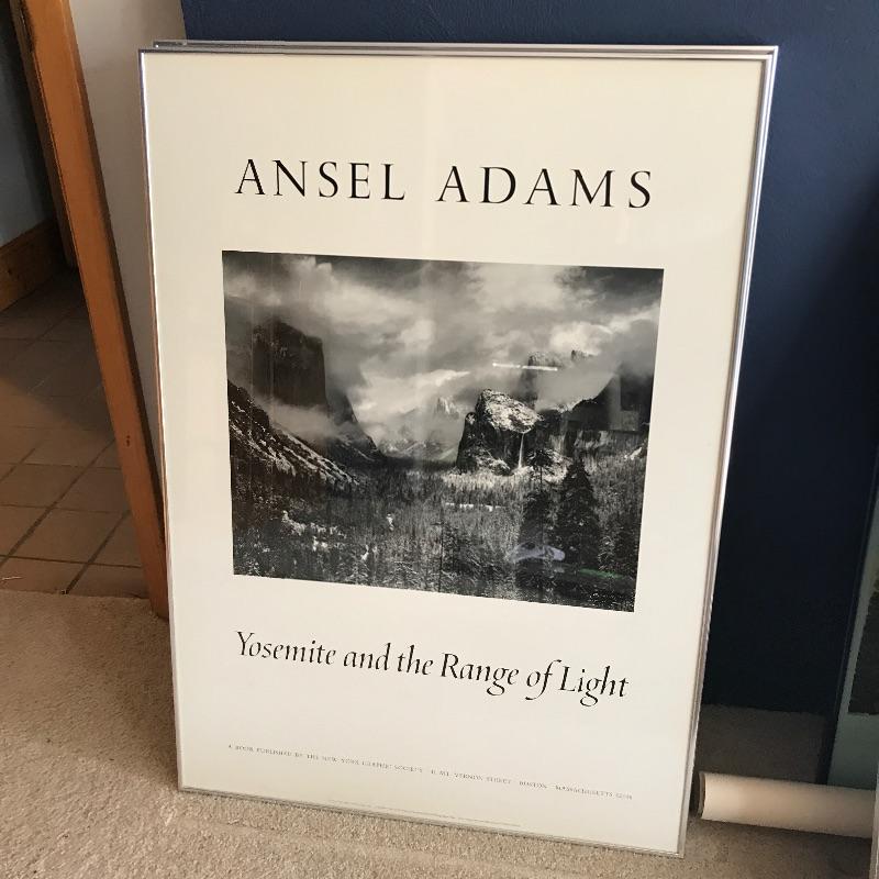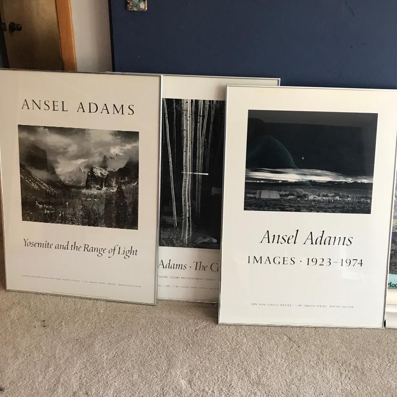 Superb trio of black and white framed posters by the famed photographer Ansel Adams. All three are nicely framed with a silver poster frame and glass front. See images for more information on each individual piece.All measure approx 37” x 26” Local Pickup Only.