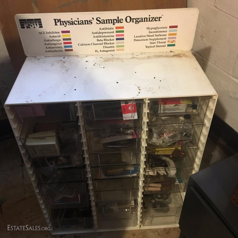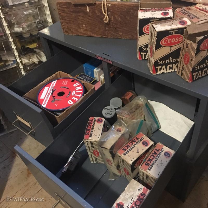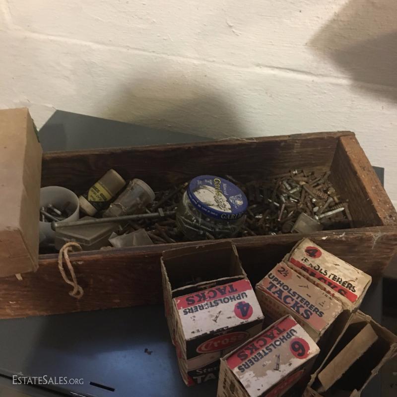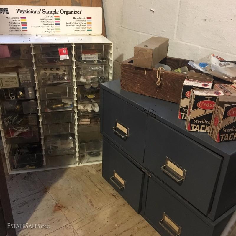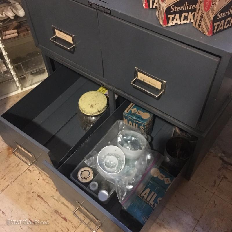 Tall plastic organizer and two metal Steelmaster stackable units. Also wooden box. All contents are included.