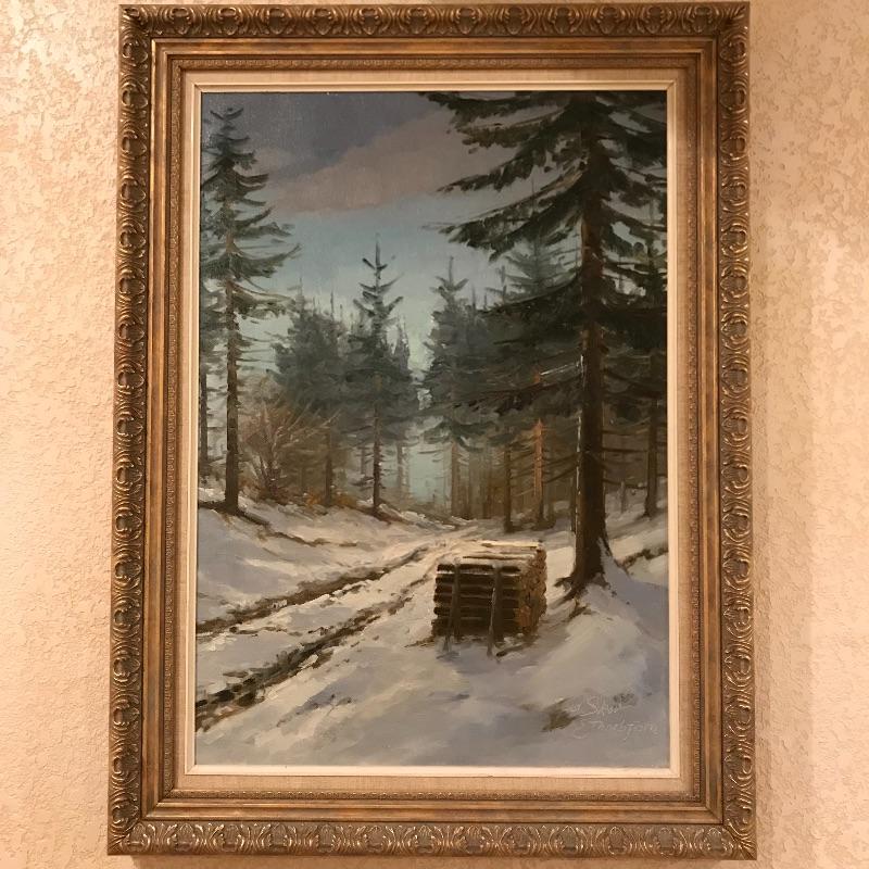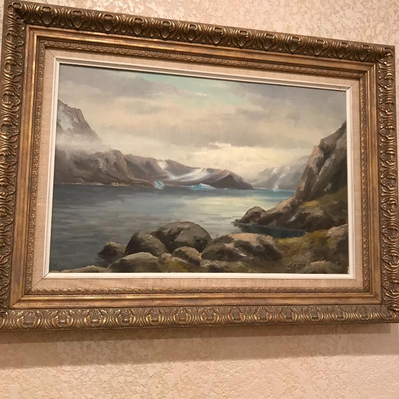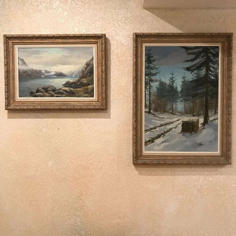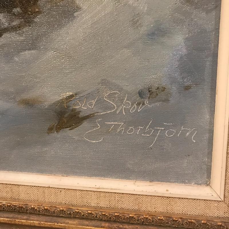 “Rold Skov” and “Gronland” Signed by E Thorbjorn. Both pieces appear to be oil paintings on canvas and have lovely matching gold painted wooden frames with identical matting. “Rold Skov” measures 24” x 32” and “Gronland” measures 25” x 18.5”. Both frames are 2” thick. Shipping available. Please call UPS with dimensions at 828-252-6930 for a shipping quote prior to bidding.