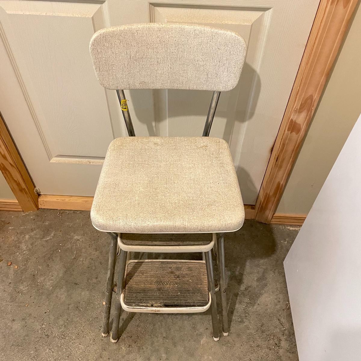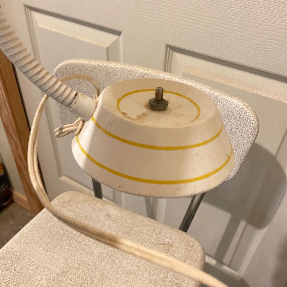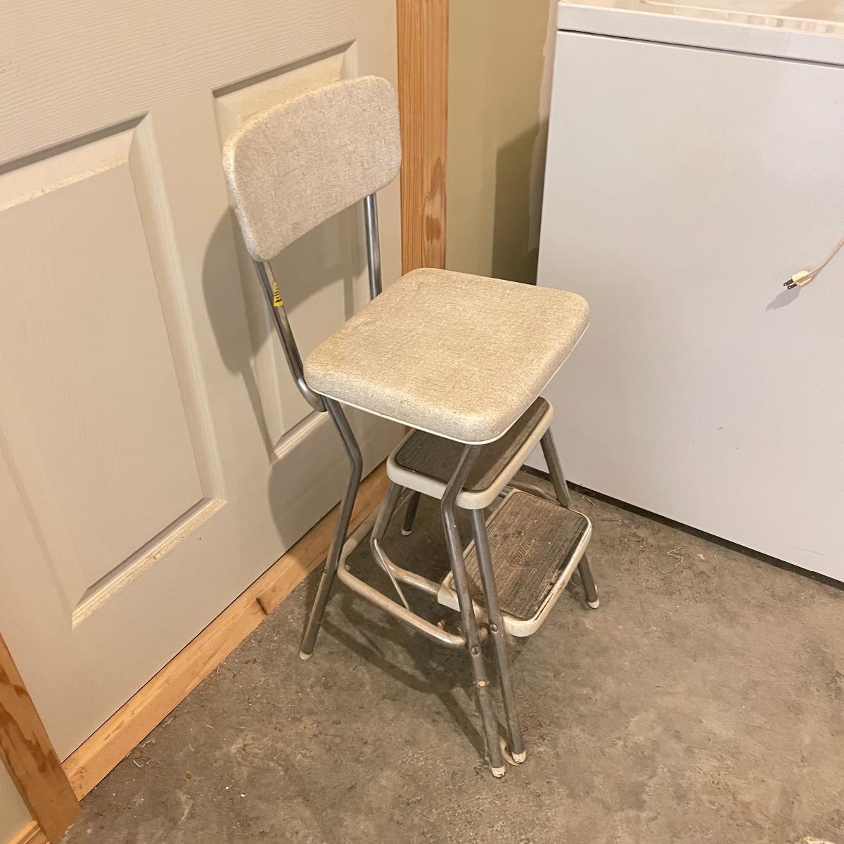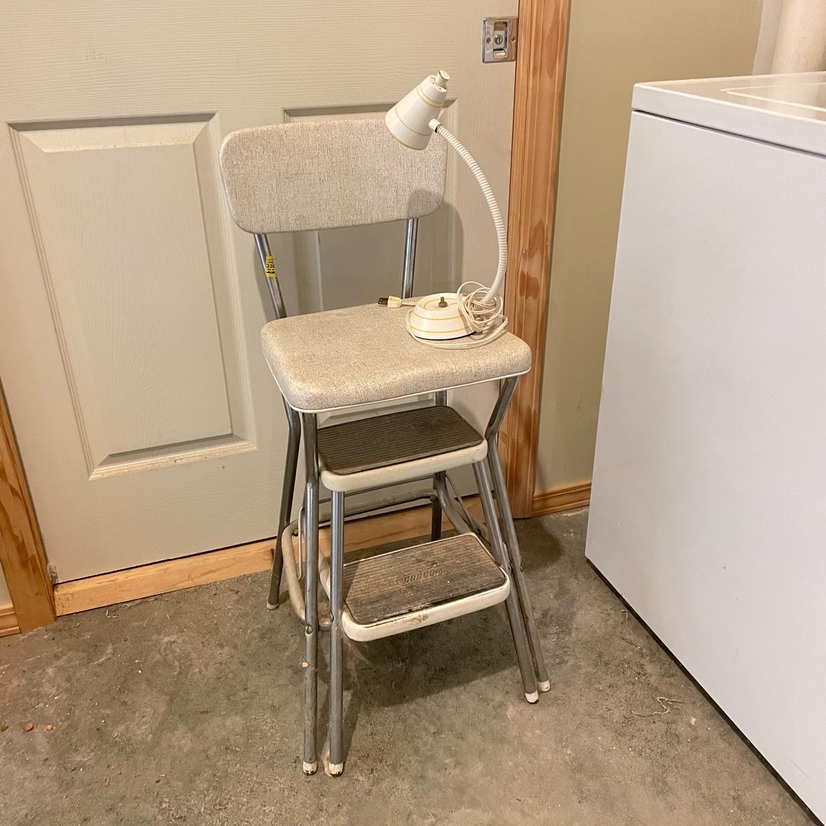 Versatile Cosco stool/step ladder combo along with a vintage retro style desk lamp that has some nicks and scrapes, and a white metal lamp. The hanging lamp has an electric cord attached and is not connected to the house. It has a pull power cord to operate and the shade measures 16”d x 7”. The step stool nests into the seat, great for saving space. It measures 14” x 16” x 34” with a seat height at 24”. Lastly, the retro lamp with little yellow stripes and bendable metal neck. This lamp operates with a push power button. See images. Local pick up only.