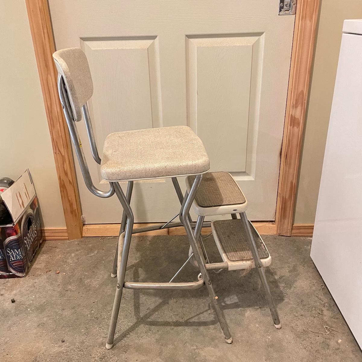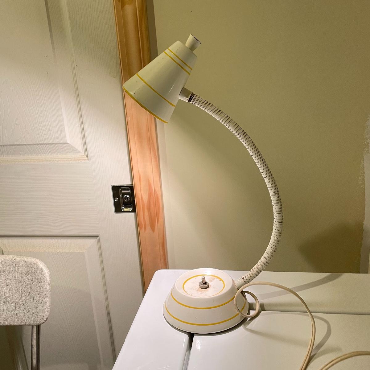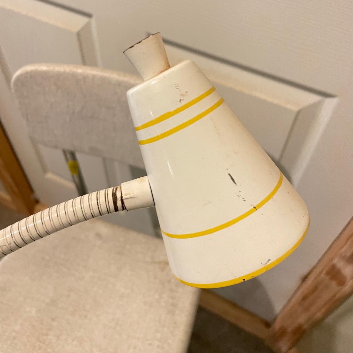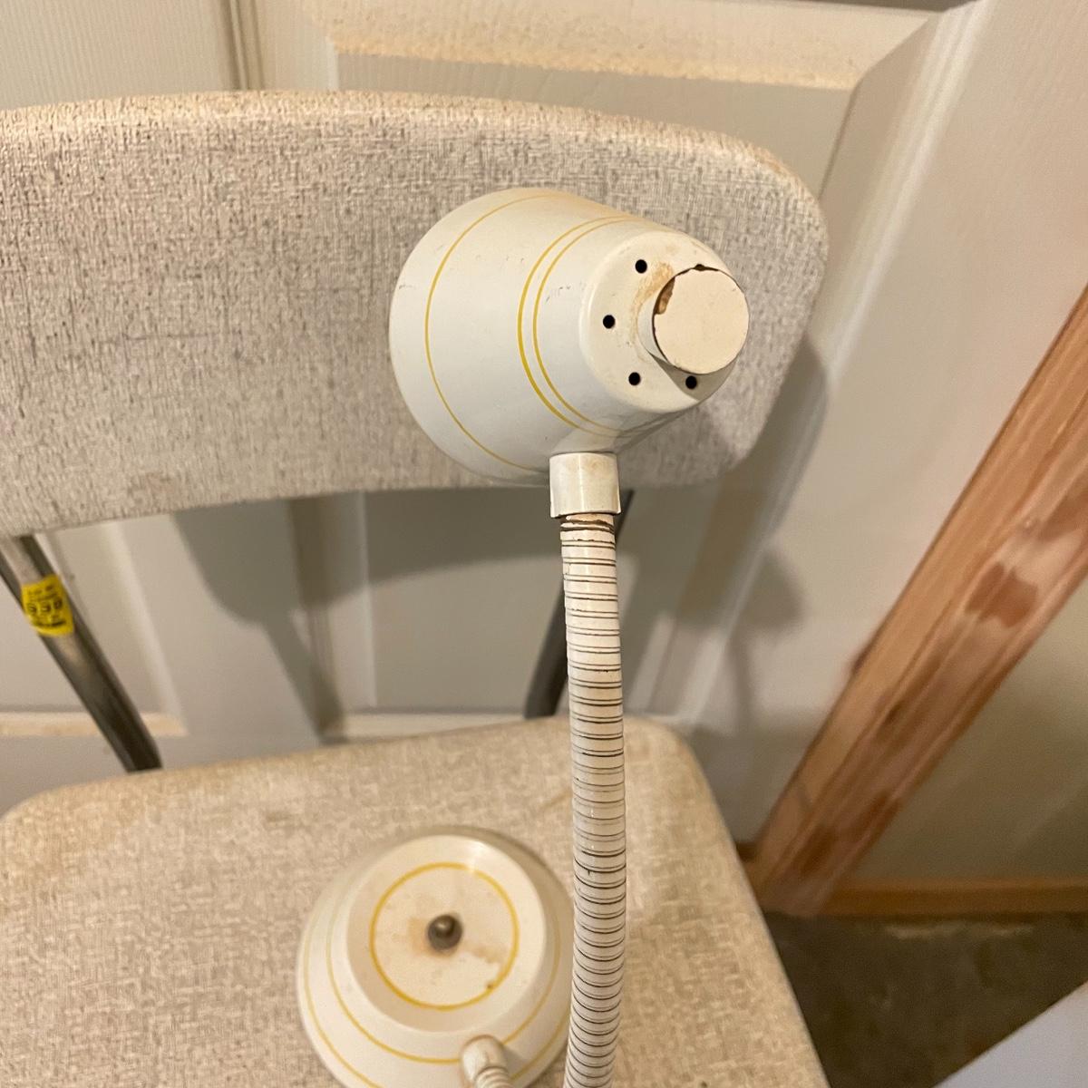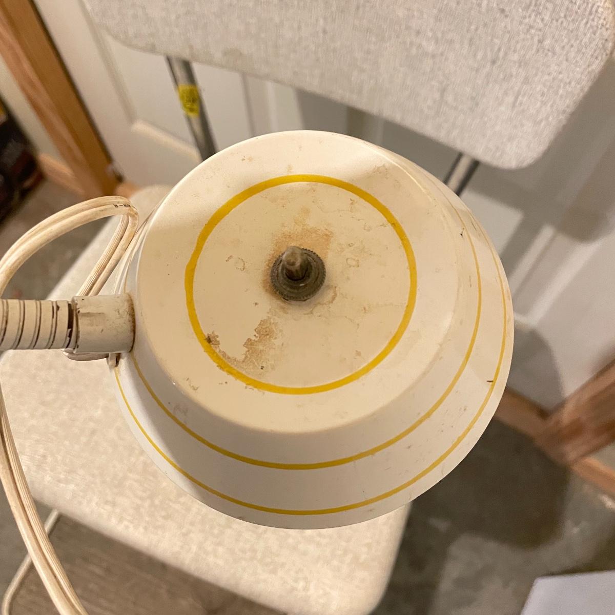 Versatile Cosco stool/step ladder combo along with a vintage retro style desk lamp that has some nicks and scrapes, and a white metal lamp. The hanging lamp has an electric cord attached and is not connected to the house. It has a pull power cord to operate and the shade measures 16”d x 7”. The step stool nests into the seat, great for saving space. It measures 14” x 16” x 34” with a seat height at 24”. Lastly, the retro lamp with little yellow stripes and bendable metal neck. This lamp operates with a push power button. See images. Local pick up only.