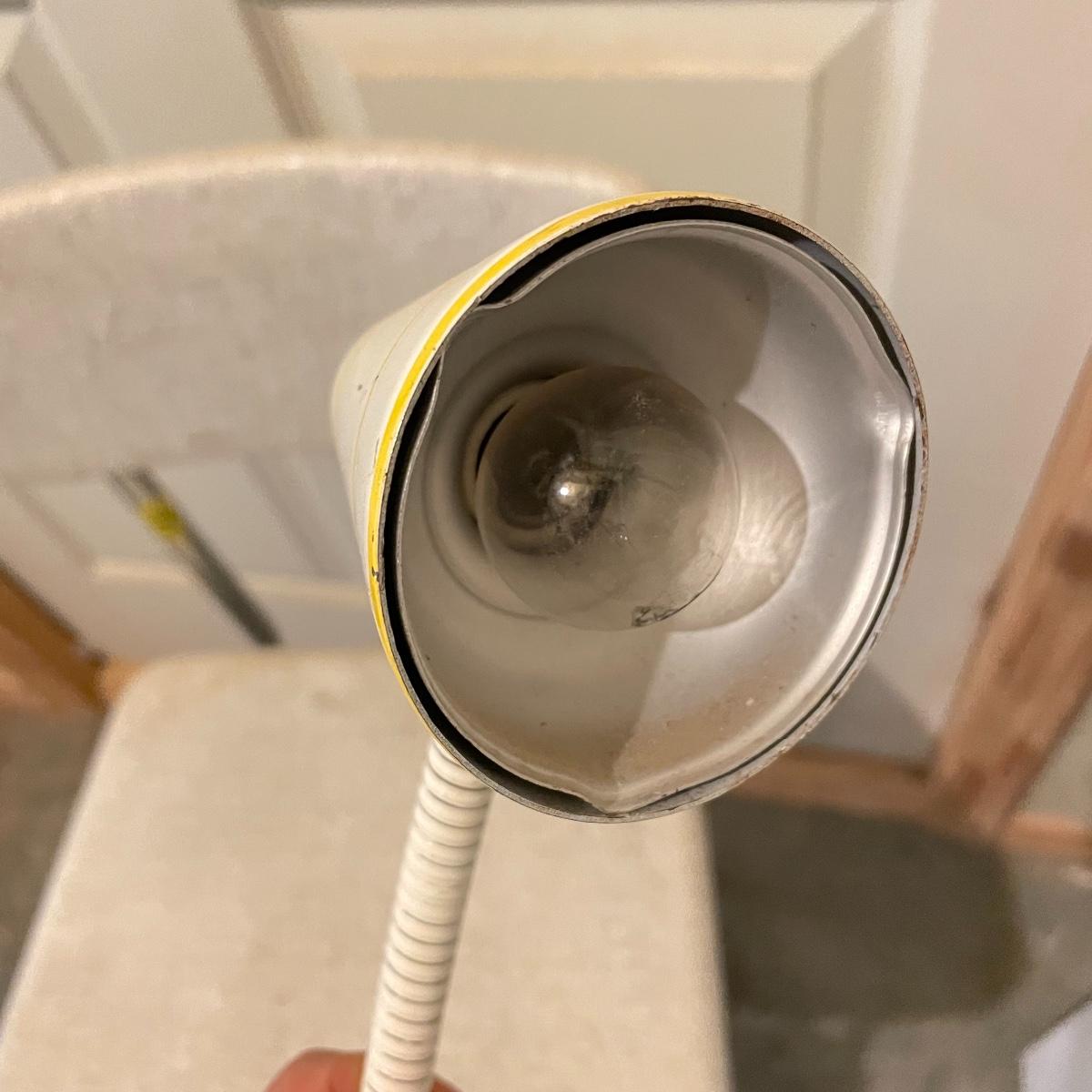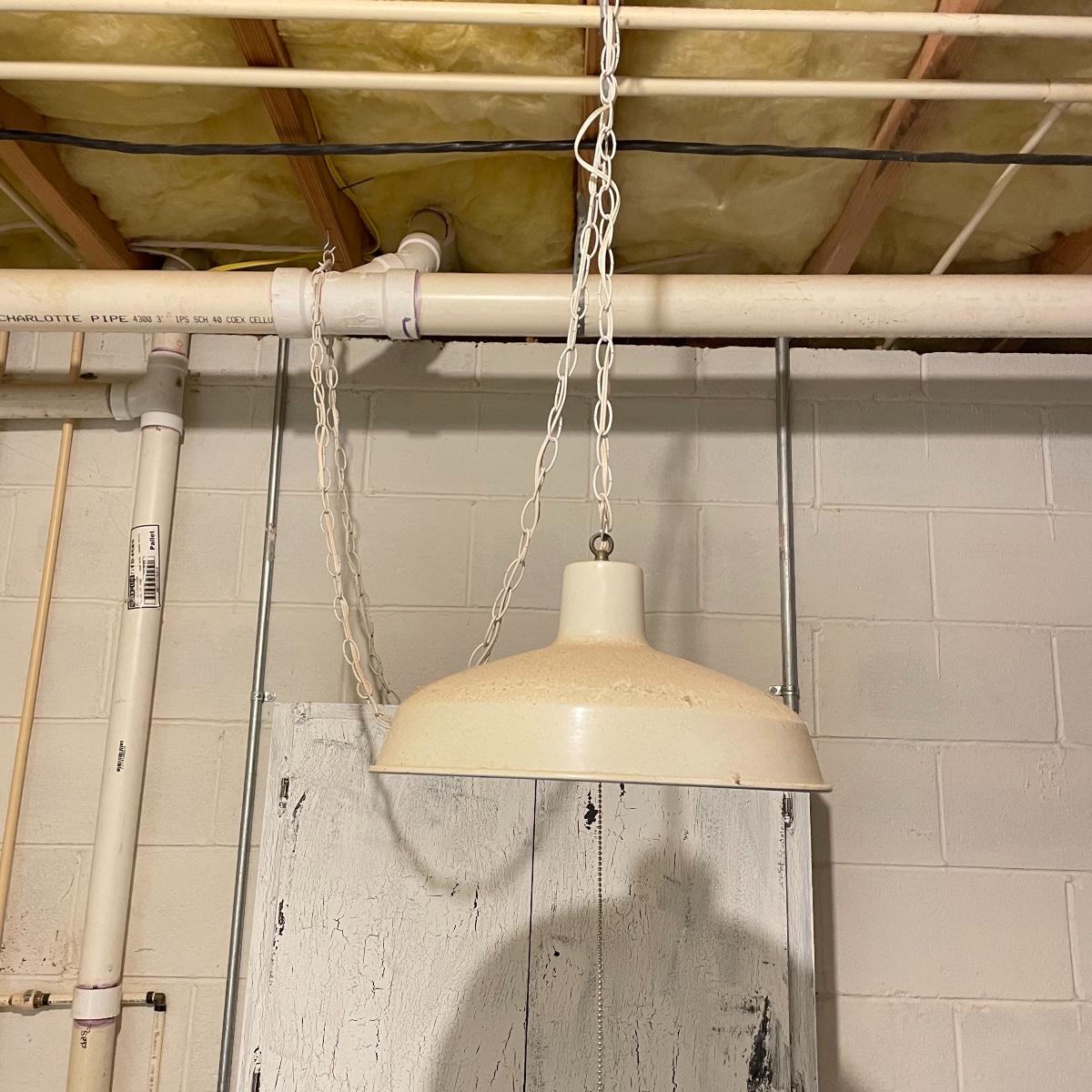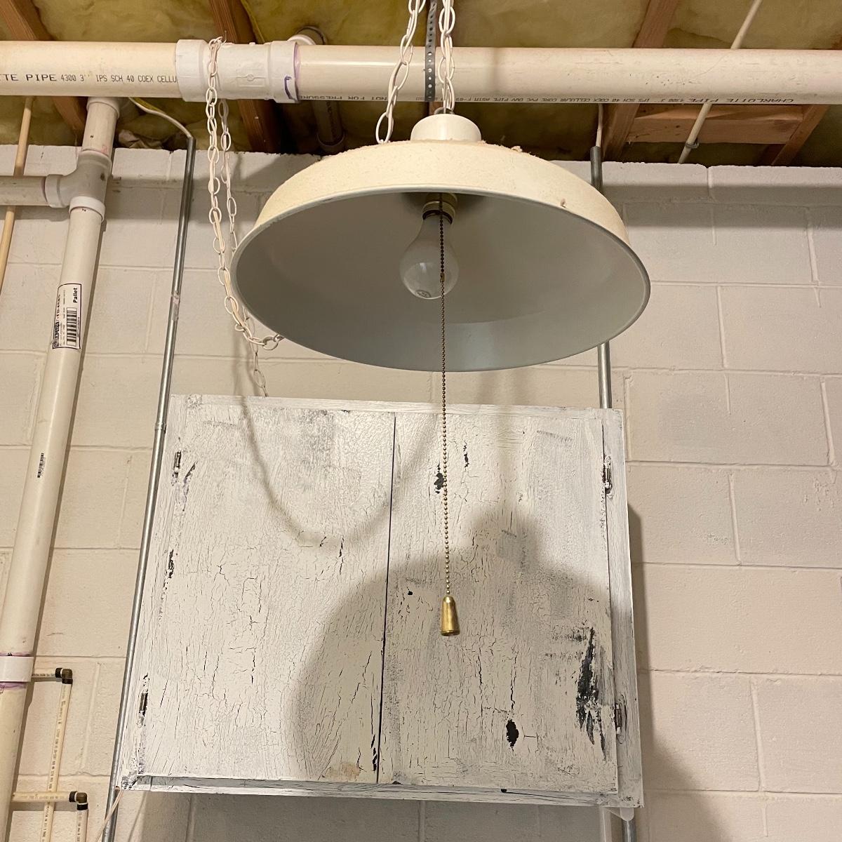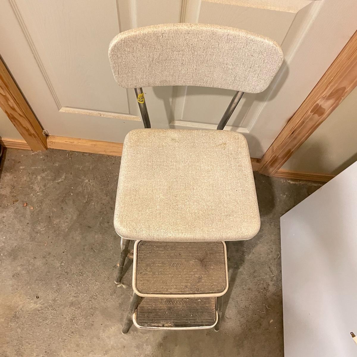 Versatile Cosco stool/step ladder combo along with a vintage retro style desk lamp that has some nicks and scrapes, and a white metal lamp. The hanging lamp has an electric cord attached and is not connected to the house. It has a pull power cord to operate and the shade measures 16”d x 7”. The step stool nests into the seat, great for saving space. It measures 14” x 16” x 34” with a seat height at 24”. Lastly, the retro lamp with little yellow stripes and bendable metal neck. This lamp operates with a push power button. See images. Local pick up only.