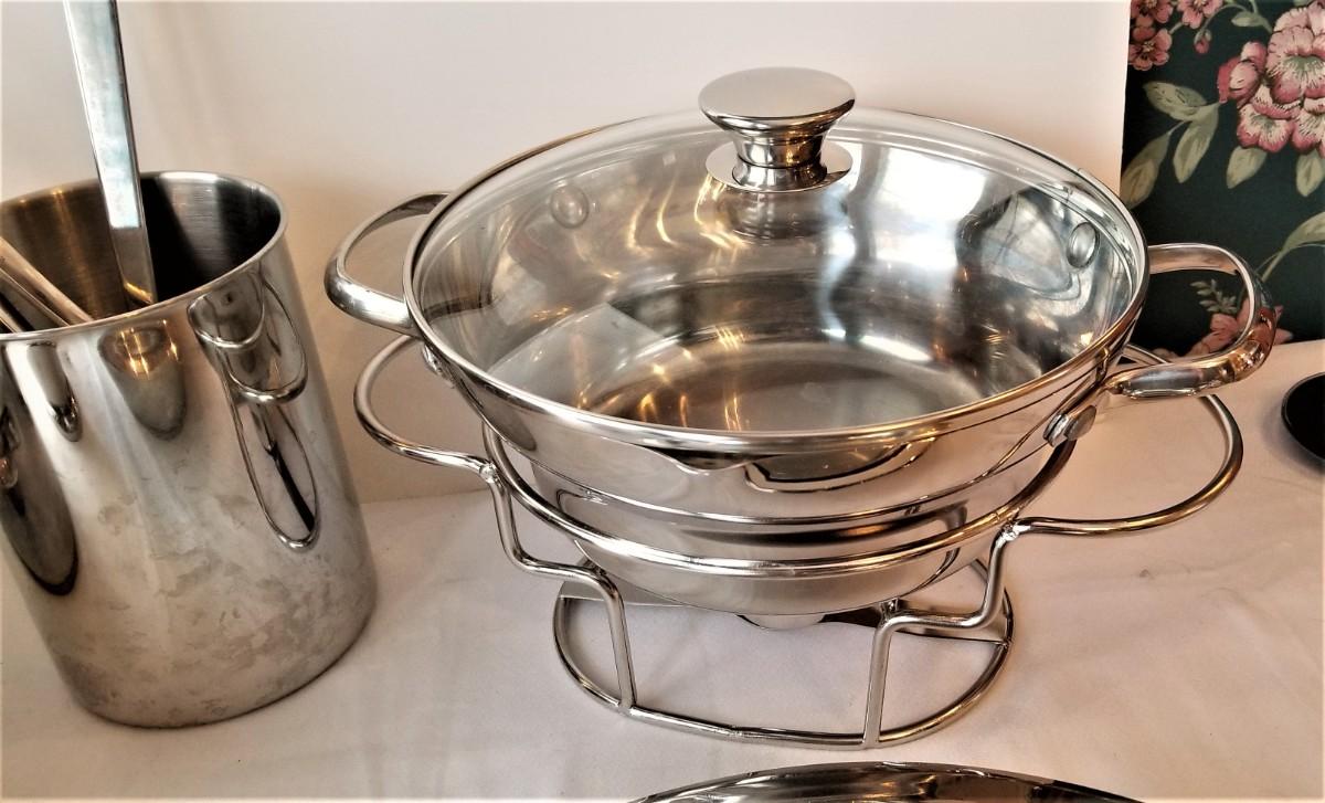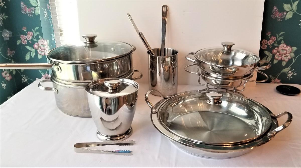 Nice set of gently used Wolfgang Puck Cookware - You get all you see here. 11" Chicken Fryer, 7 Qt. Dutch Oven, 13" Buffet Server, Ice Bucket, Utensil holder with 3 utensils, 3 Qt Soup Pot w/stand. Nice condition.
