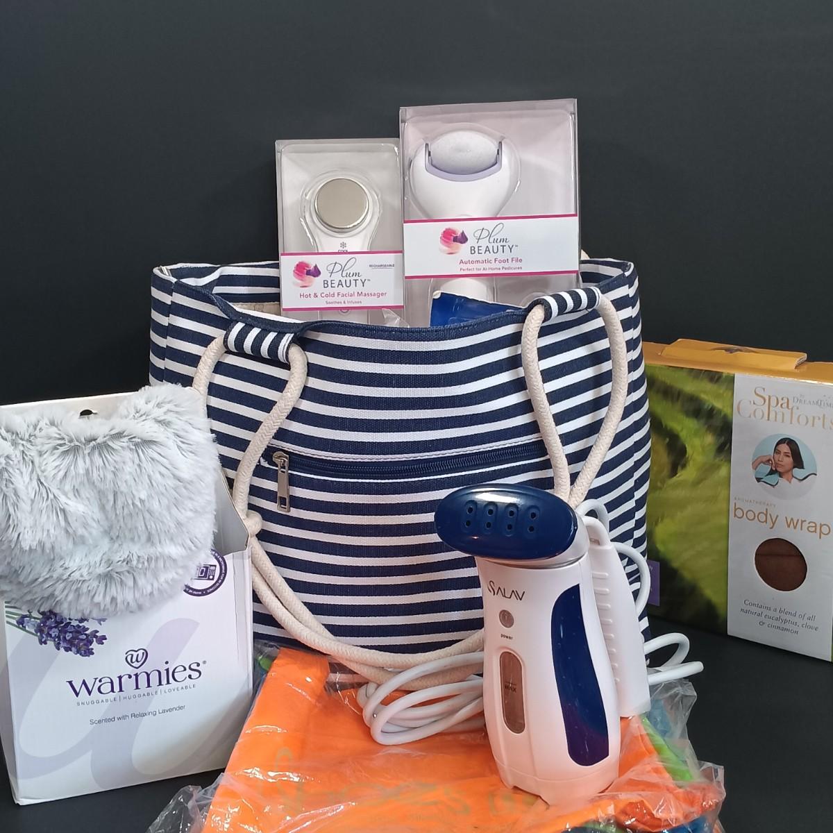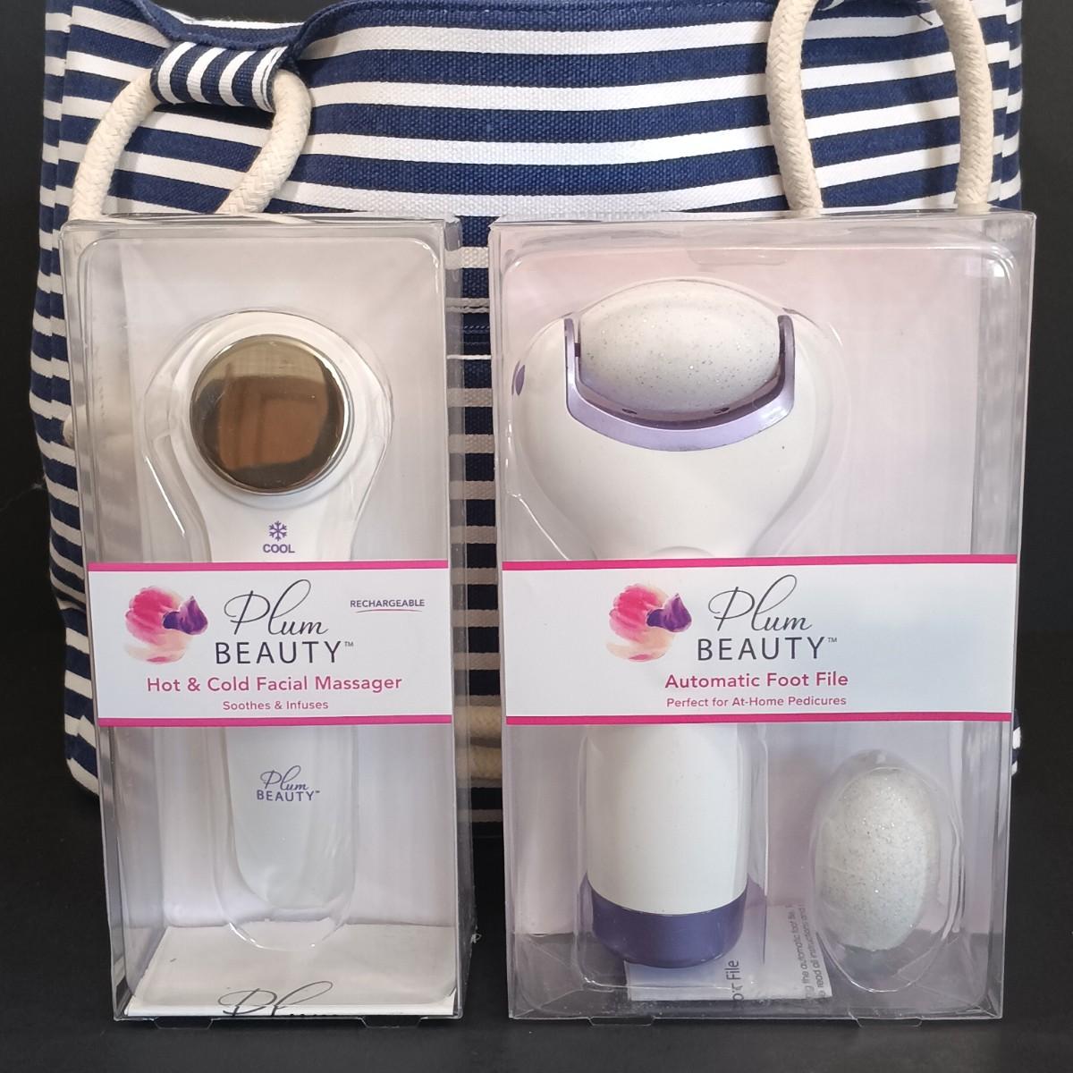 LOT 207K: Spa Day- Plum Beauty Facial Massager & Foot File w/ Body Wrap, Travel Garment Steamer, Neck Wrap & More
