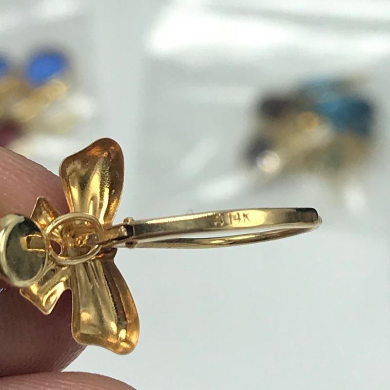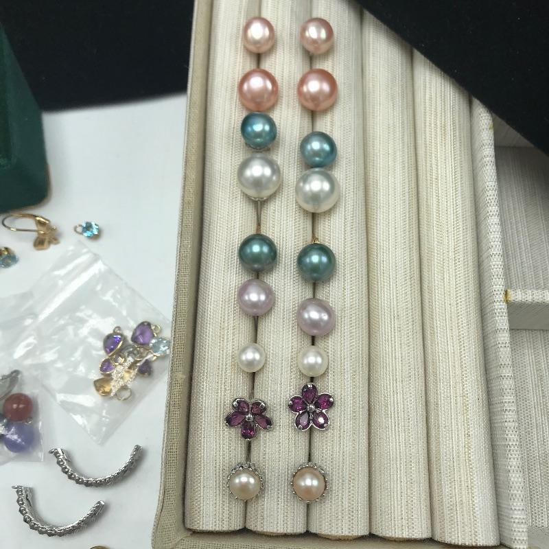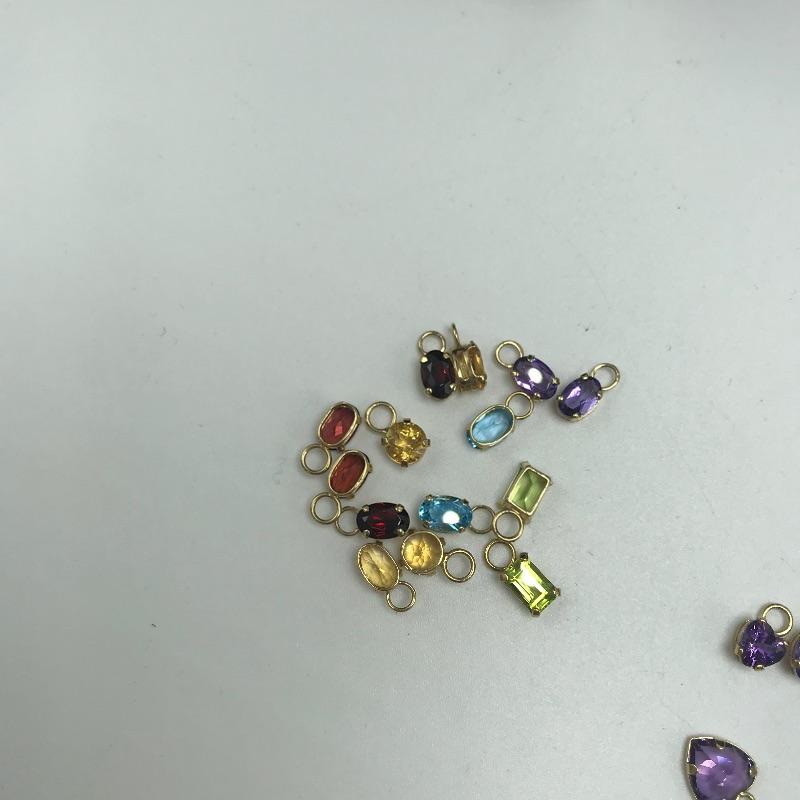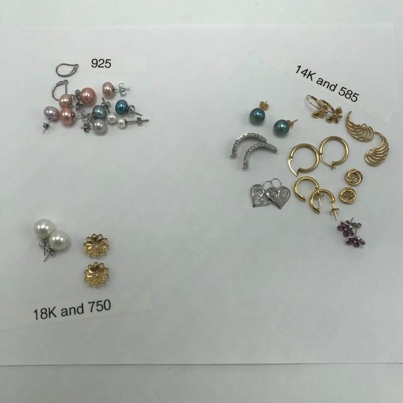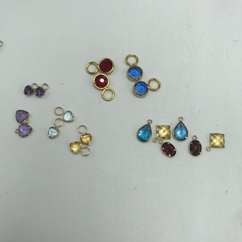Large selection of pieces to mix and match. Lot includes a green felt box with stones to dangle from gold loops. Pick the color of your choosing. You'll also find several interchangeable hoops, flowers, to get creative with your homemade earrings. Many earrings appear marked as 585 or 14K, 18K or 750 and 925. Only a few earring backs are marked 14K, the others appear unmarked. The metal accessories like wings, flower and hearts all appear to be marked precious, see photo with markings labels. Some gem charms will only fit the bow earrings. Please come to preview and see all the possibilities! Small forest green felt box measures approximately 3.75” x 3.25” x 2.25”. Starting bid based on melt values.